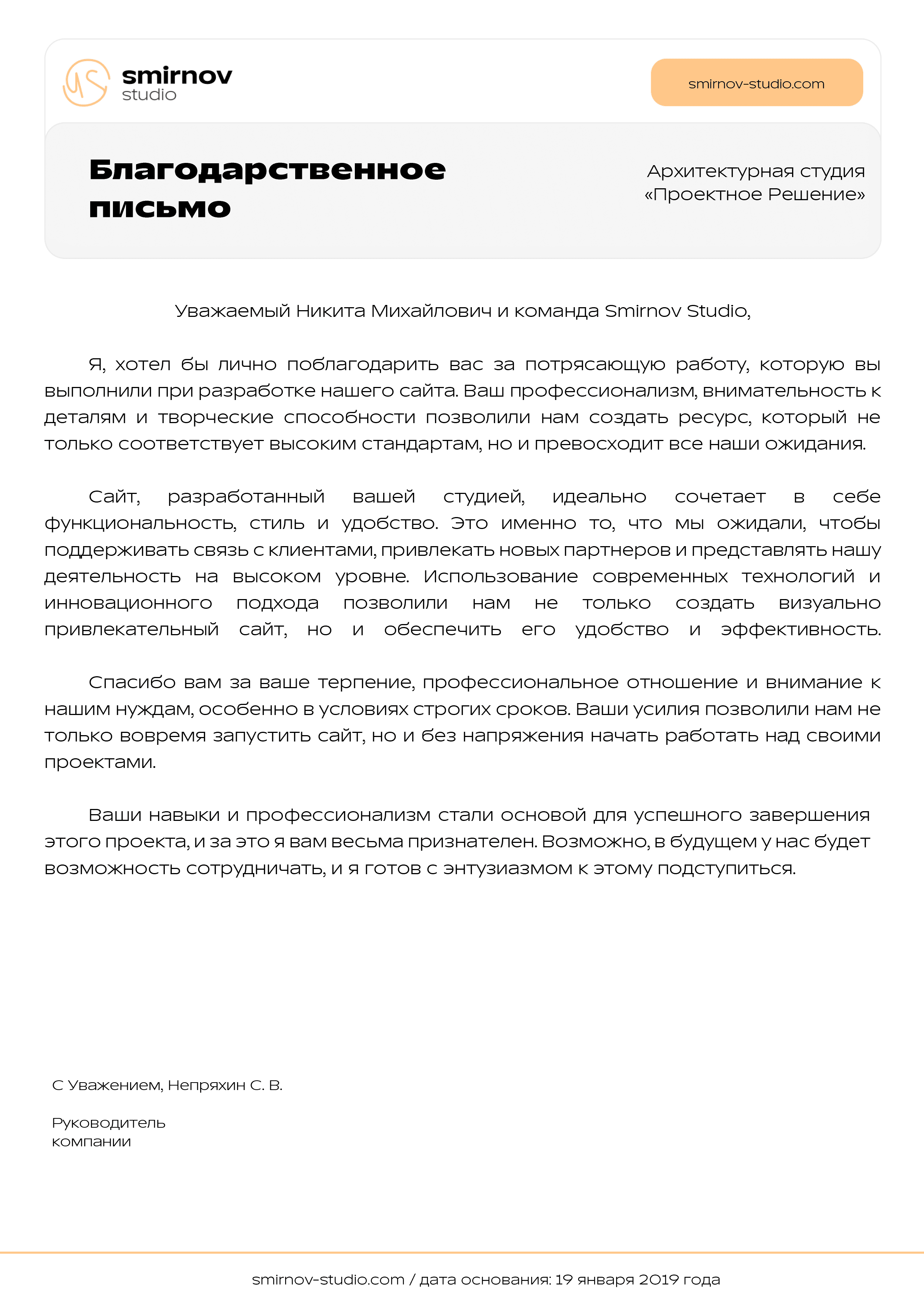 Отзыв от:Проектное РешениеУважаемый Никита Михайлович и команда Smirnov Studio, Я, хотел бы лично поблагодарить вас за потрясающую работу, которую вы выполнили при разработке нашего сайта. Ваш профессионализм, внимательность к деталям и творческие способности позволили нам создать ресурс, который не только соответствует высоким стандартам, но и превосходит все наши ожидания. Сайт, разработанный вашей студией, идеально сочетает в себе функциональность, стиль и удобство. Это именно то, что мы ожидали, чтобы поддерживать связь с клиентами, привлекать новых партнеров и представлять нашу деятельность на высоком уровне. Использование современных технологий и инновационного подхода позволили нам не только создать визуально привлекательный сайт, но и обеспечить его удобство и эффективность. Спасибо вам за ваше терпение, профессиональное отношение и внимание к нашим нуждам, особенно в условиях строгих сроков. Ваши усилия позволили нам не только вовремя запустить сайт, но и без напряжения начать работать над своими проектами. Ваши навыки и профессионализм стали основой для успешного завершения этого проекта, и за это я вам весьма признателен. Возможно, в будущем у нас будет возможность сотрудничать, и я готов с энтузиазмом к этому подступиться