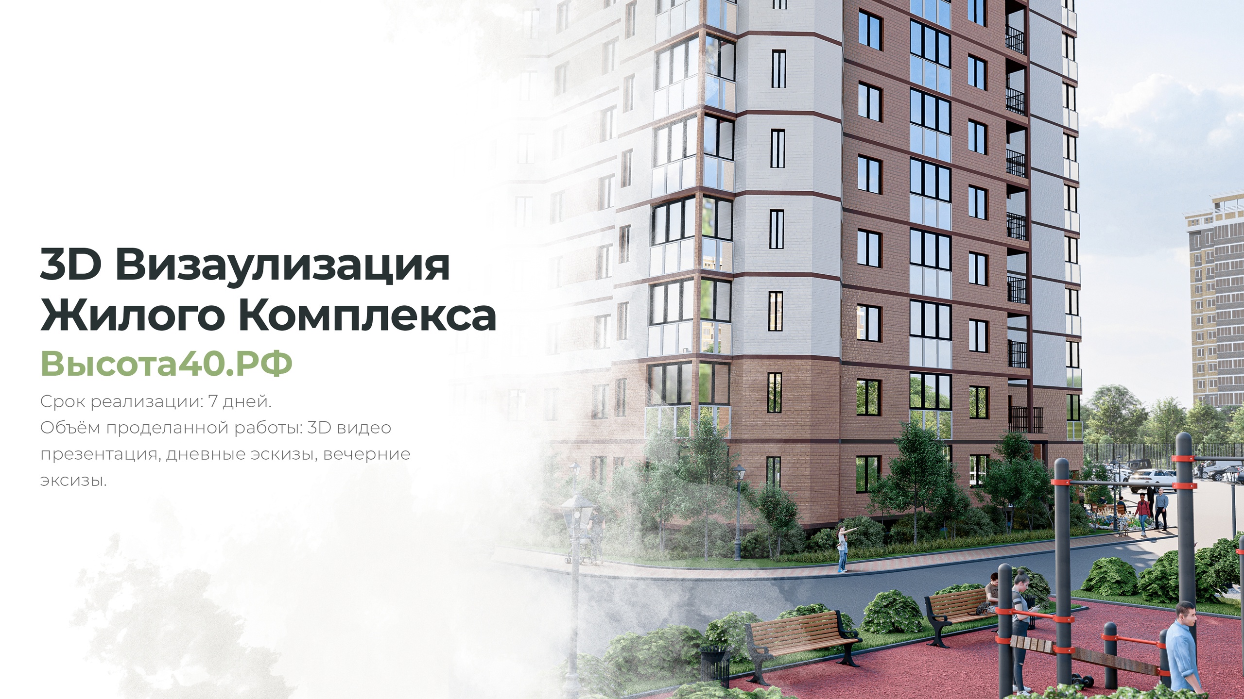 🏡 Разработка 3D визуализации под ключ для Жилого Комплекса «Высота 40». Срок реализации 7 дней. Весь объём работы сделан нашей командой без подрядчиков: ландшафтная архитектура, 3D моделирование объектов, создание окружения, наполнение материалов по референсам и многое другое.