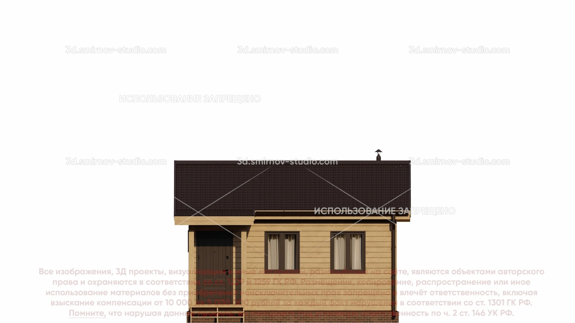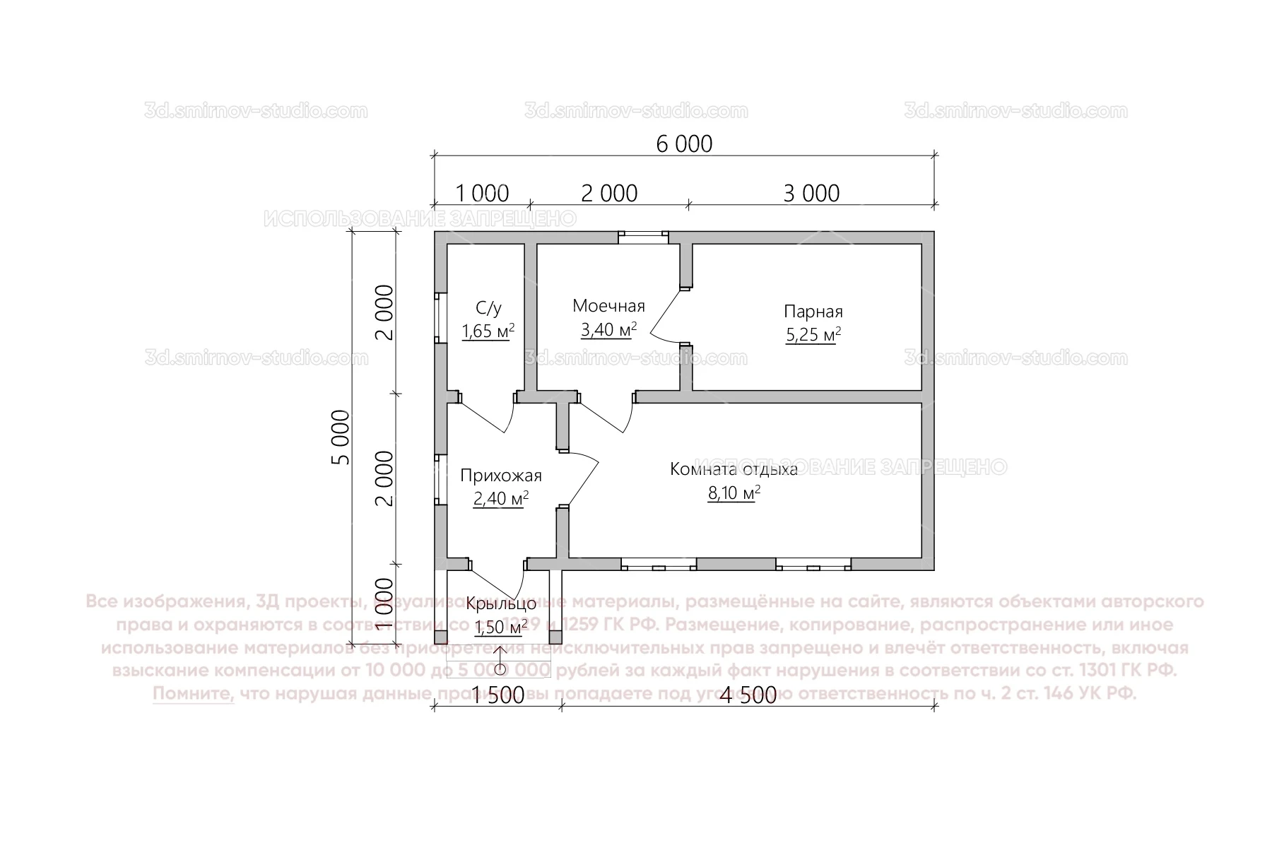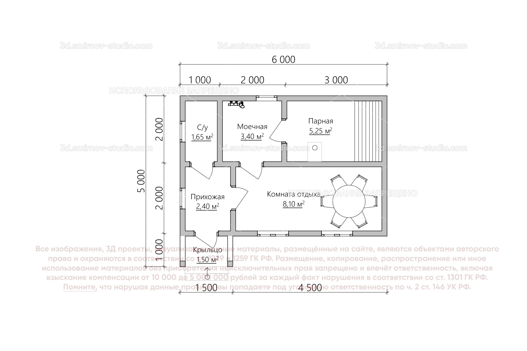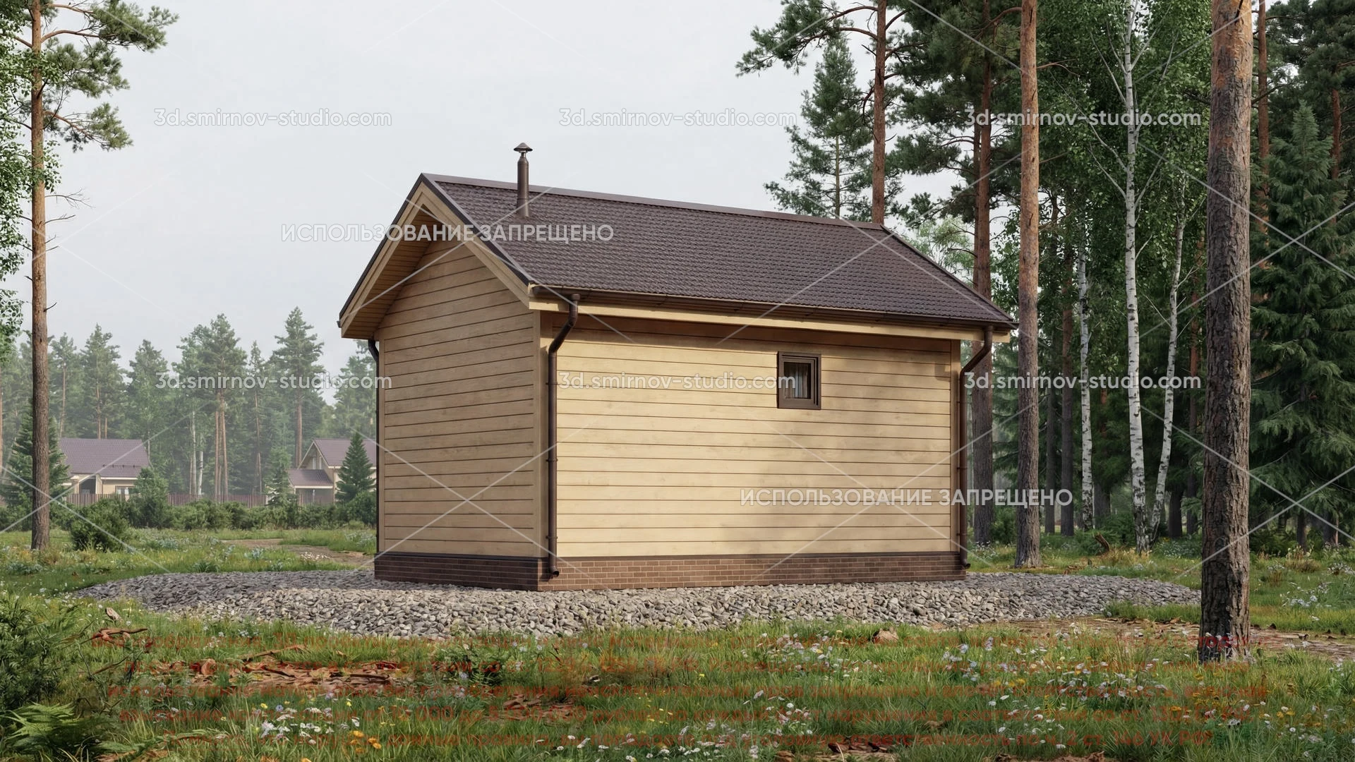 3Д проект одноэтажной бани из бруса 6 на 5 метров, площадью 22,3 м², с прямой крышей, крыльцом, санузлом и комнатой отдыха