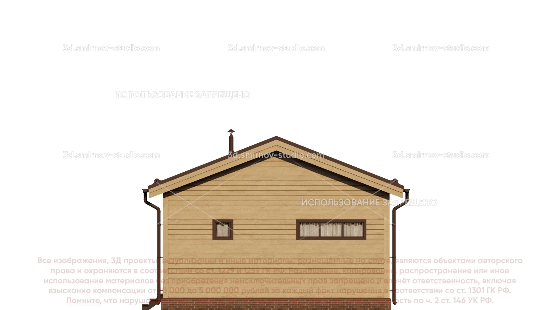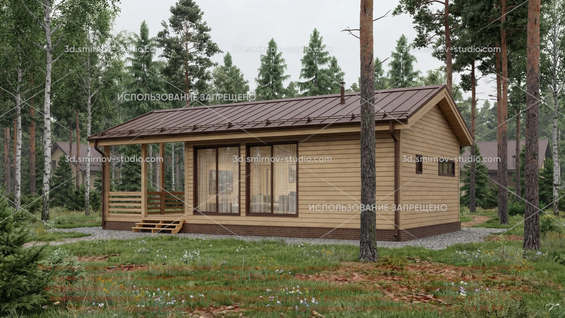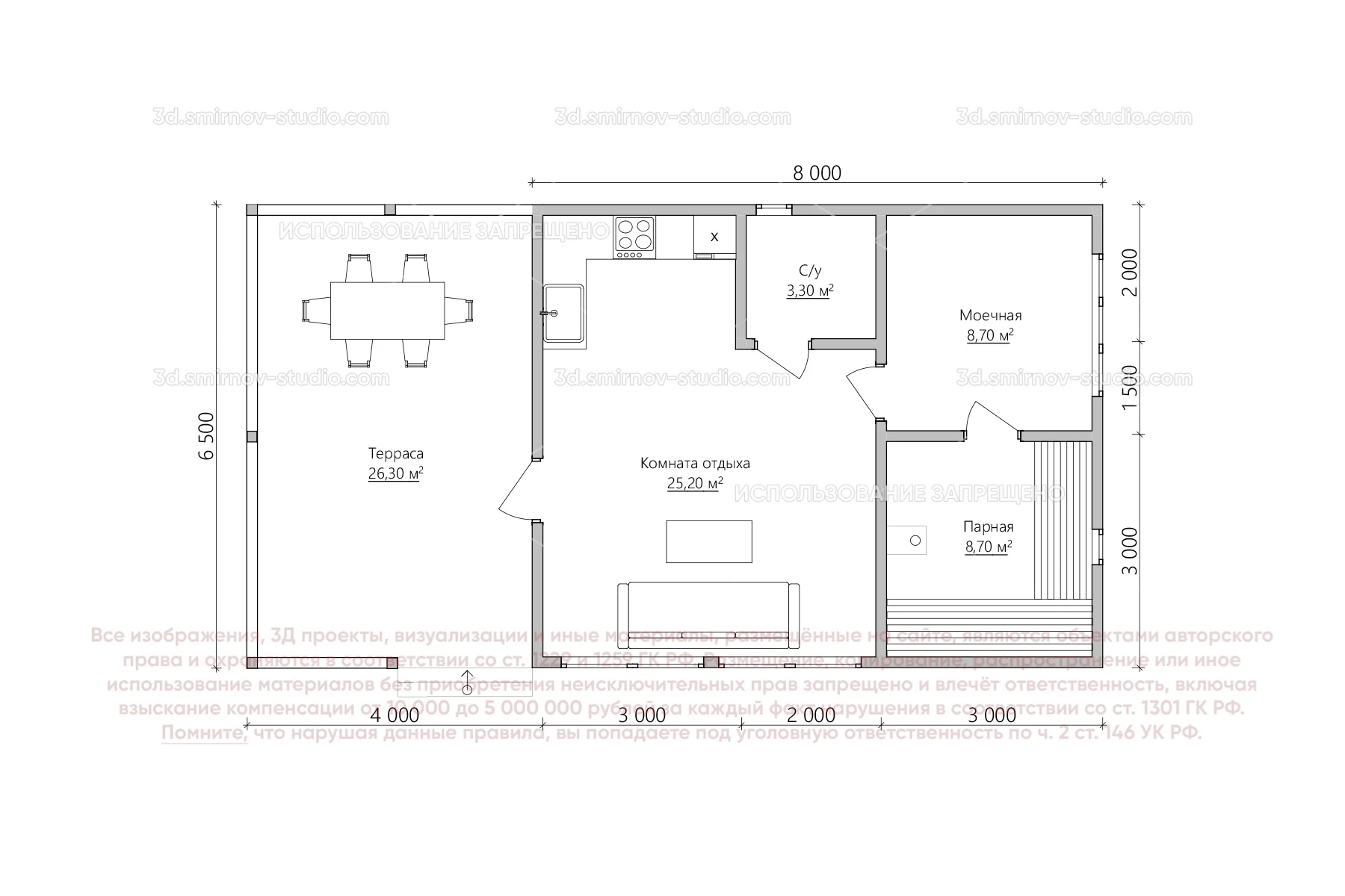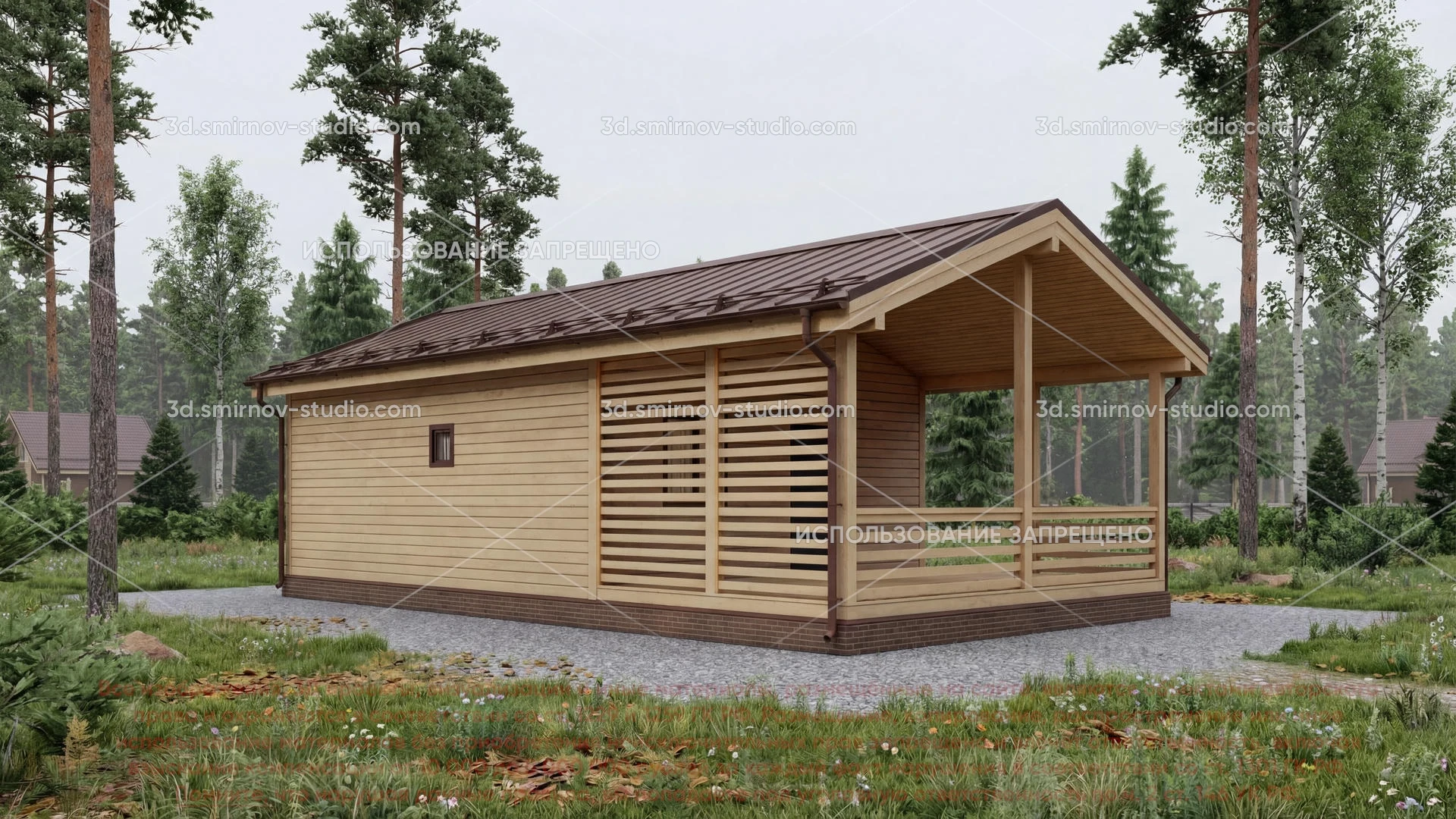 3Д проект одноэтажной бани из бруса 12 на 6.5 метров, площадью 72,2 м², с прямой крышей, большой террасой, санузлом и комнатой отдыха