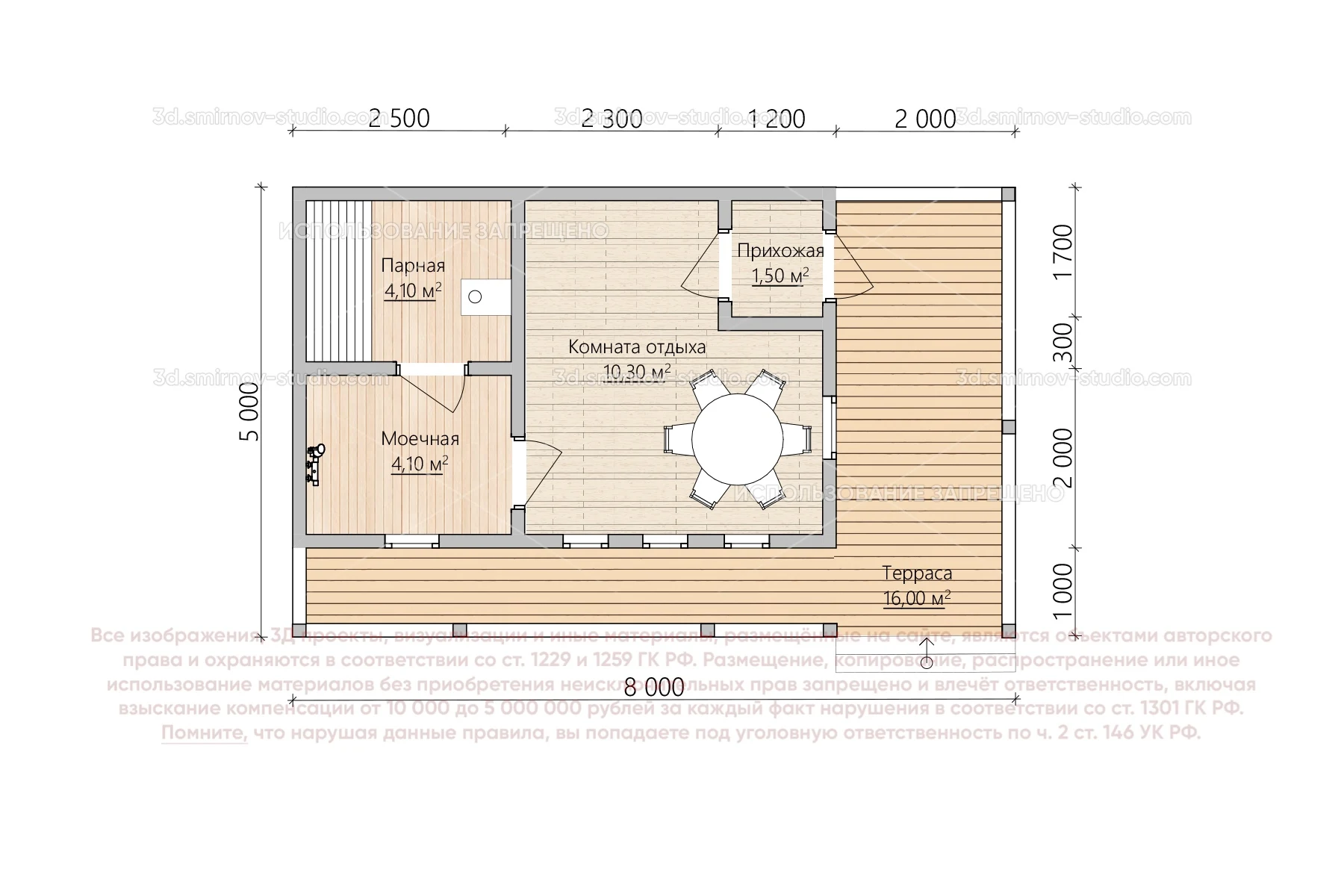 3Д проект одноэтажной бани из бруса 8 на 5 метров, площадью 36 м², с односкатной крышей, террасой, тех. помещением и комнатой отдыха