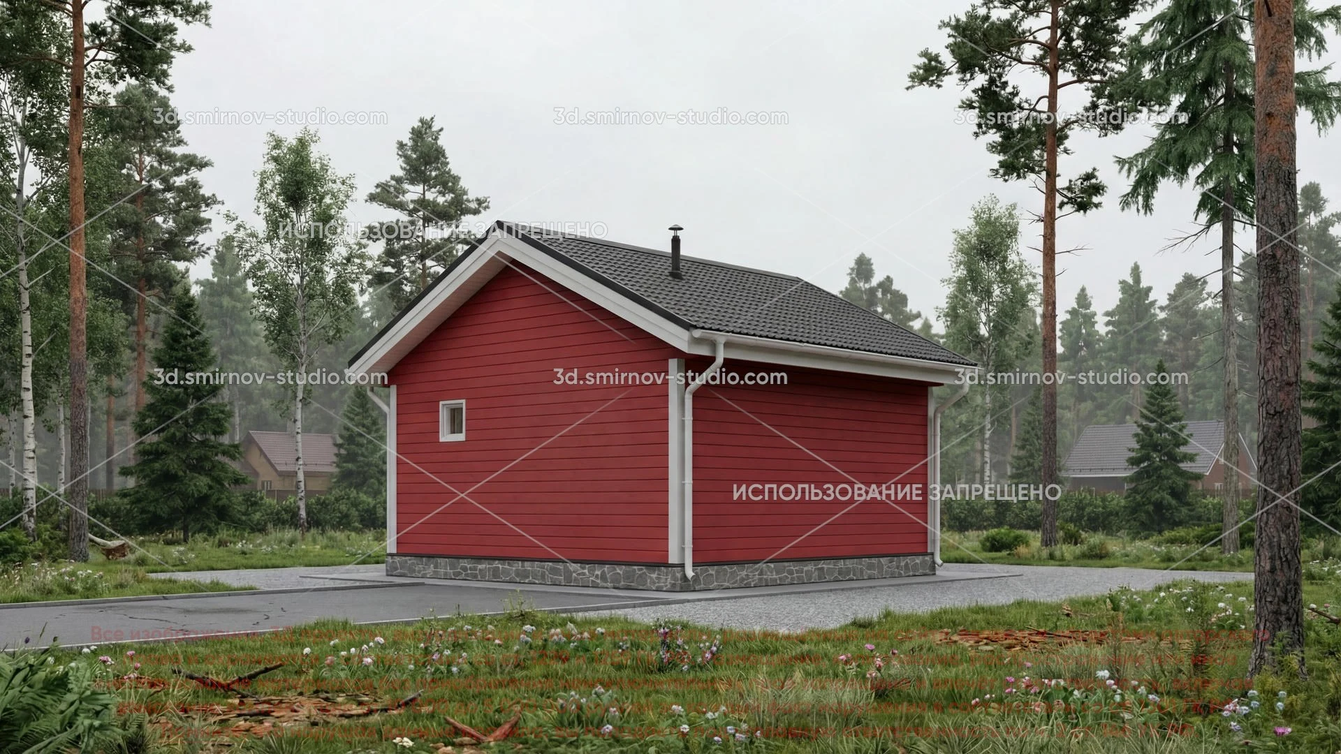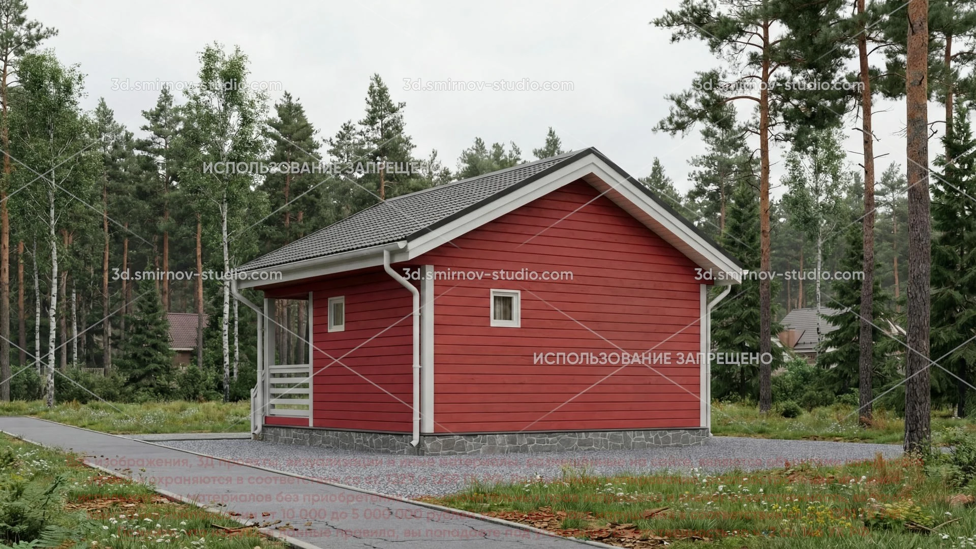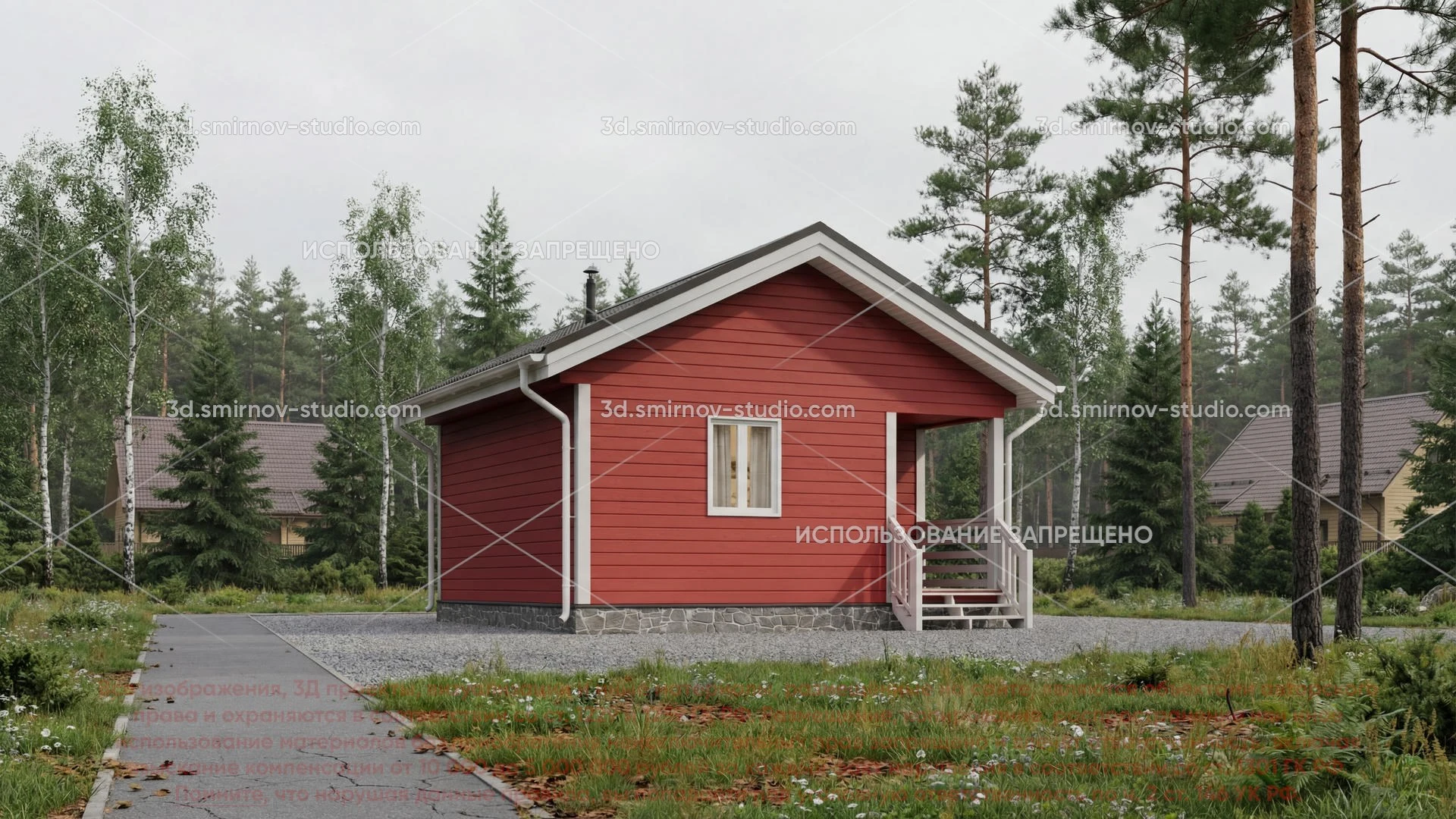 3Д проект одноэтажной каркасной бани 6 на 6 метров, площадью 30,8 м², с прямой крышей, террасой