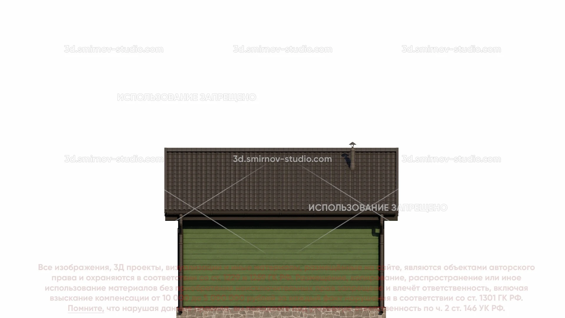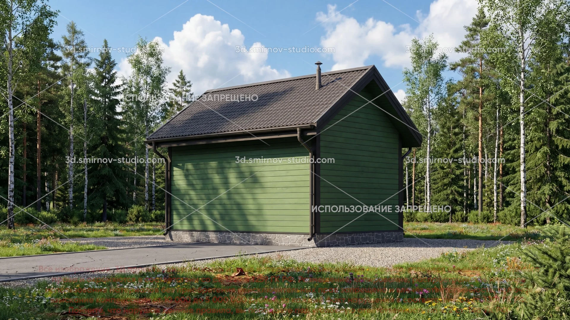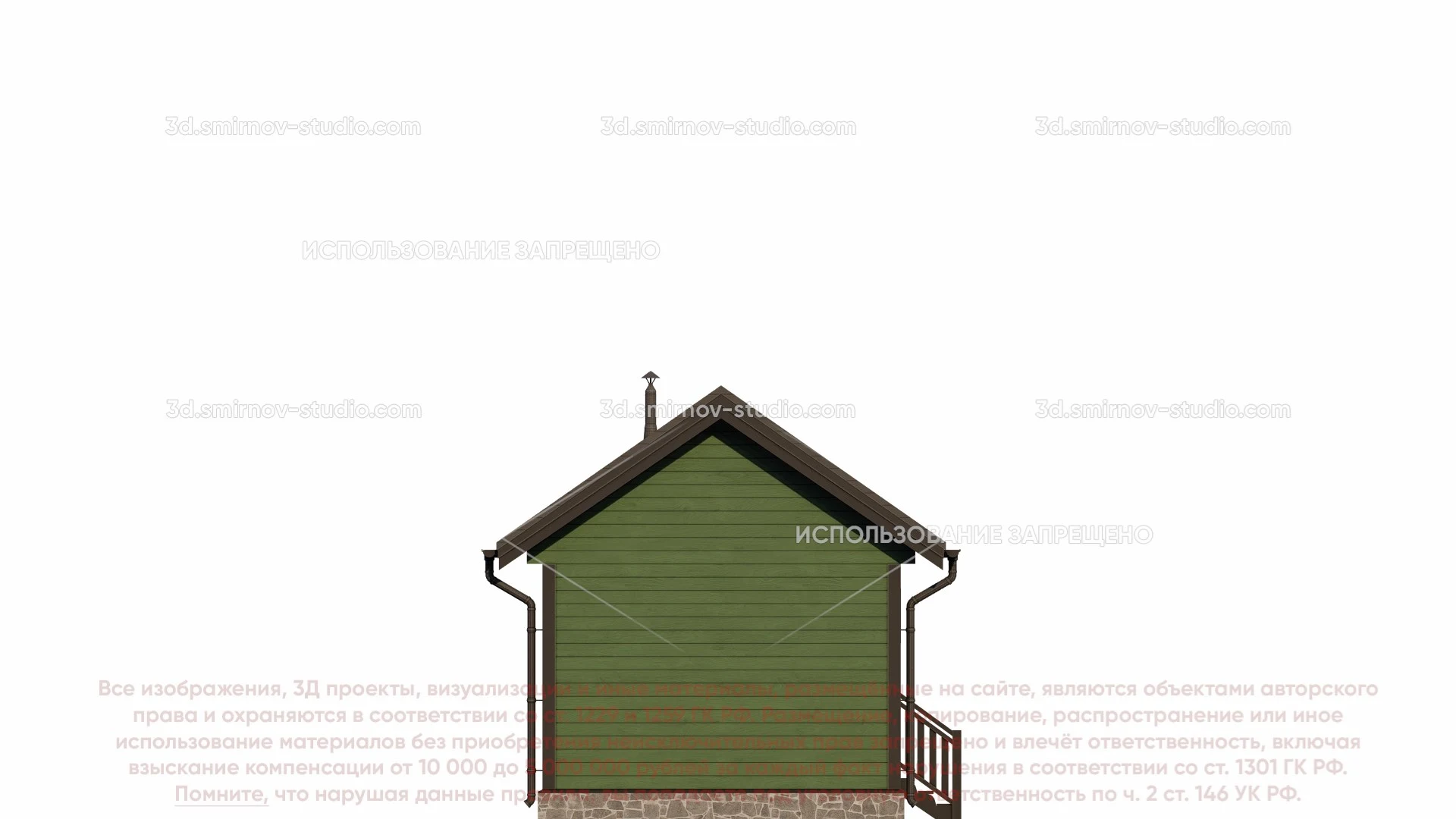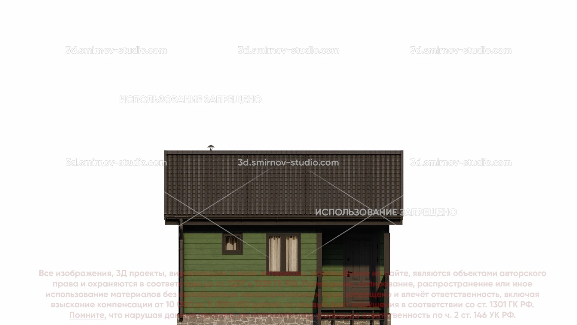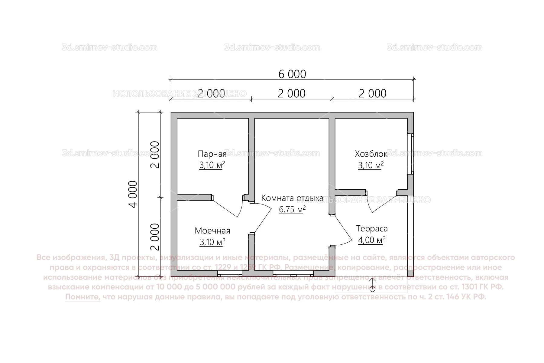 3Д проект одноэтажной каркасной бани 6 на 4 метра, площадью 20,05 м², с прямой крышей, террасой и хоз. блоком