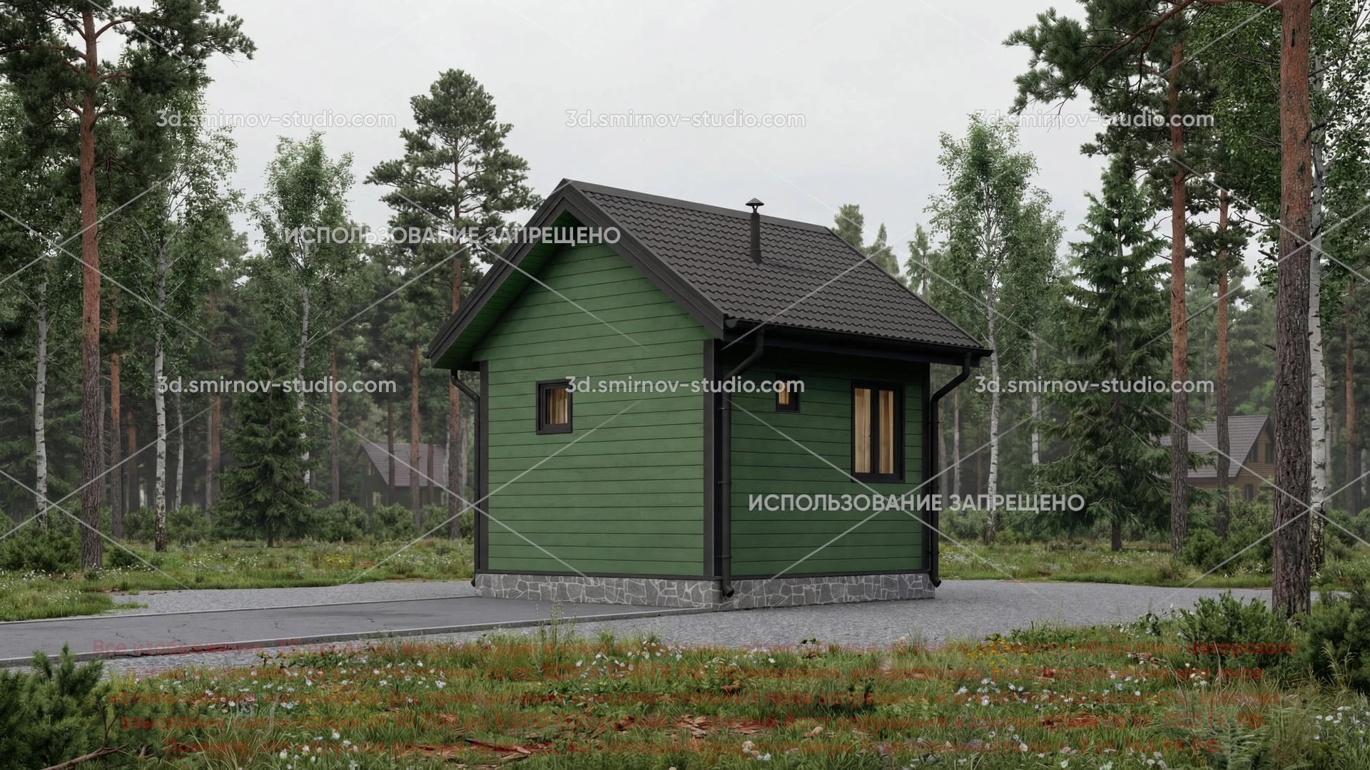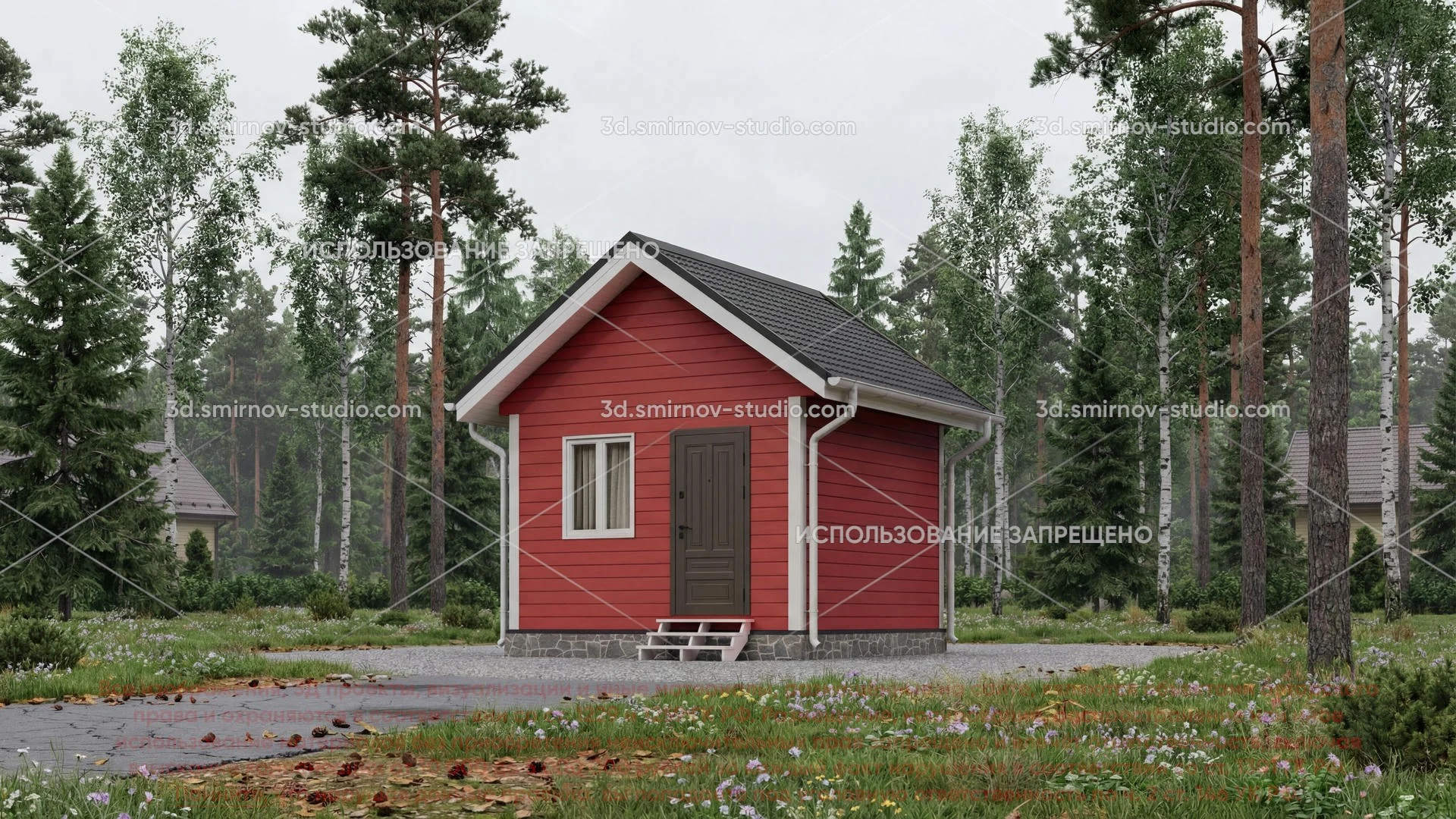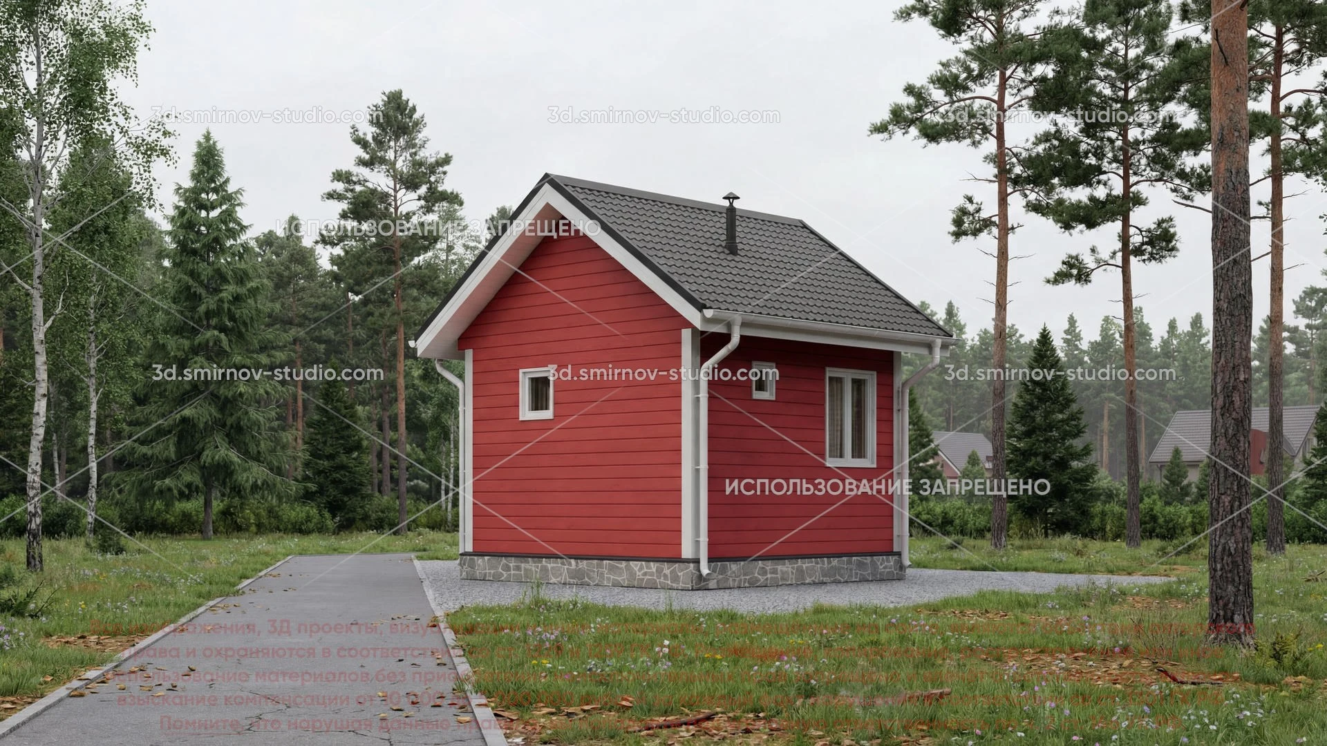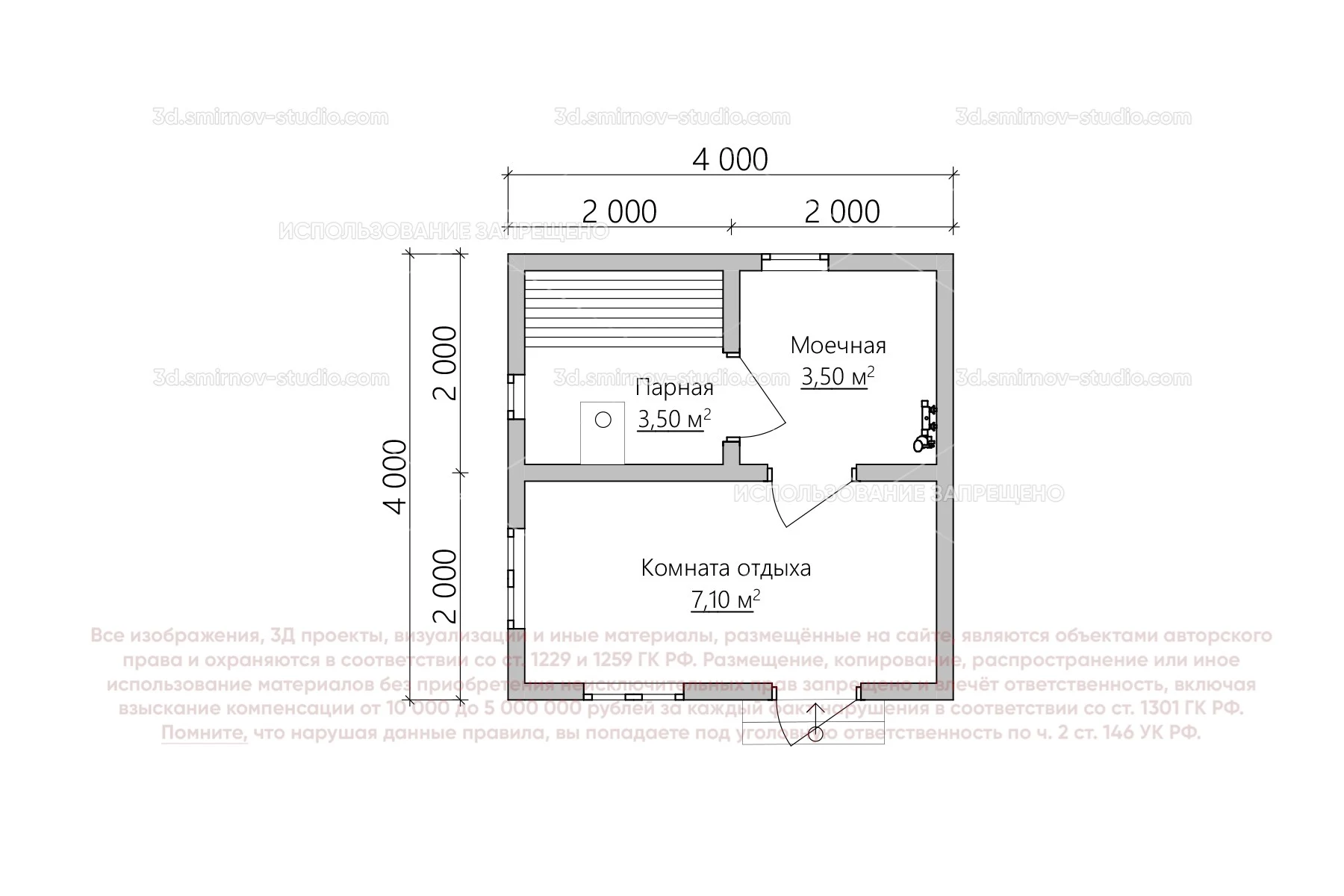 3Д проект одноэтажной каркасной бани 4 на 4 метра, площадью 14,1 м², с прямой крышей и комнатой отдыха