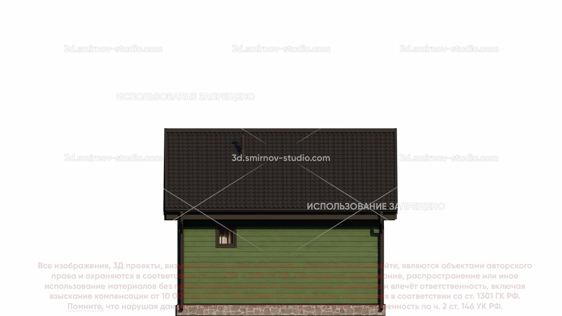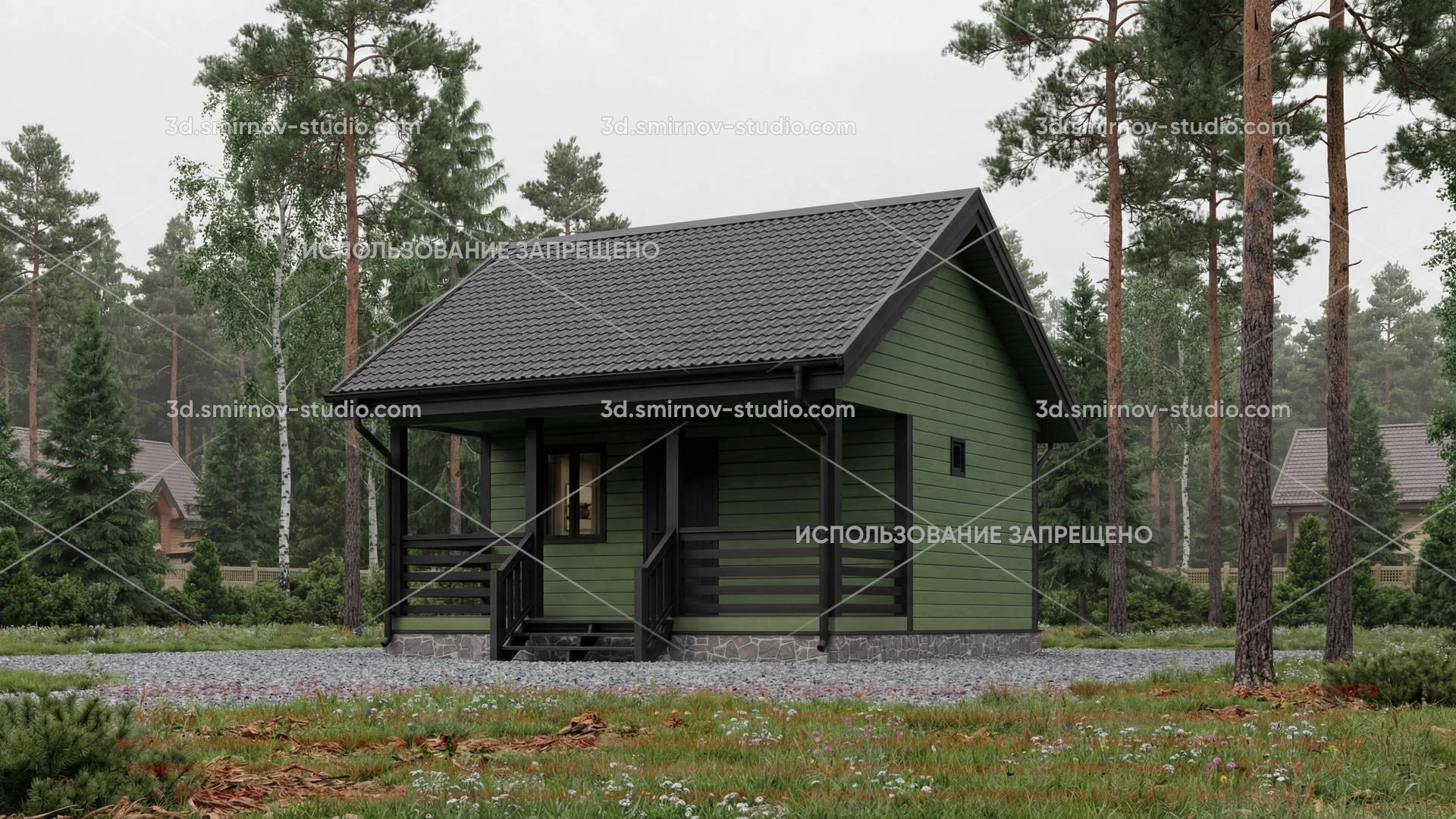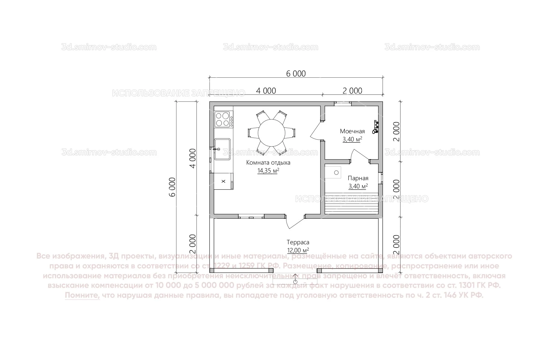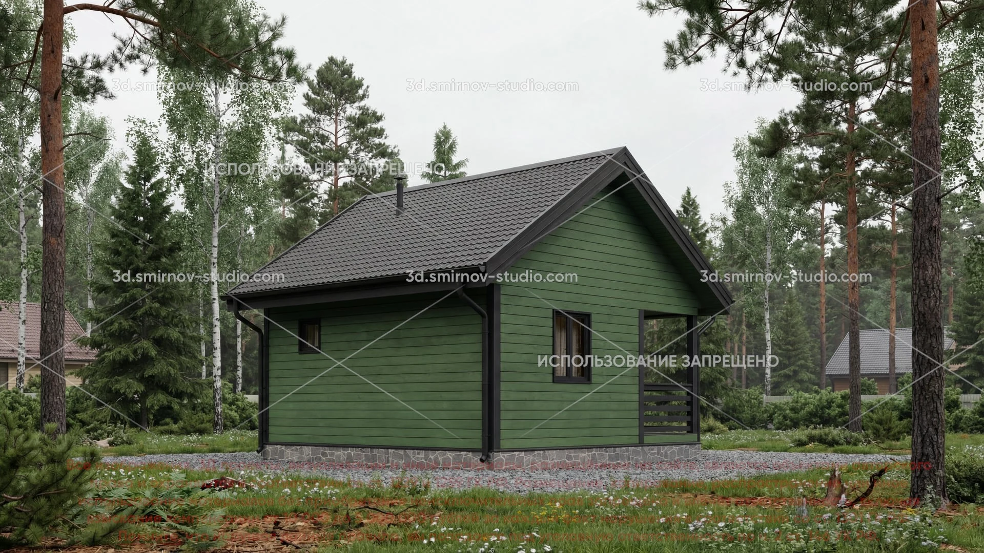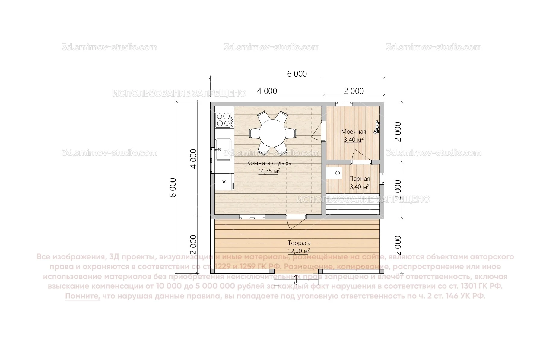 3Д проект одноэтажной каркасной бани 6 на 6 метров, площадью 30,9 м², с прямой крышей, террасой и комнатой отдыха