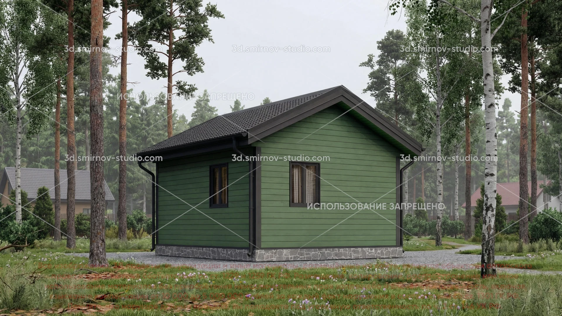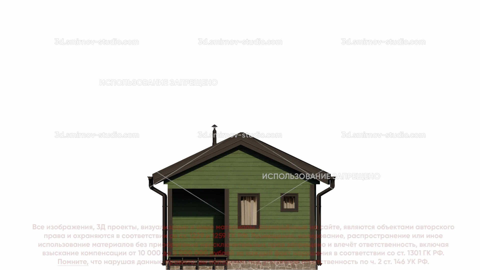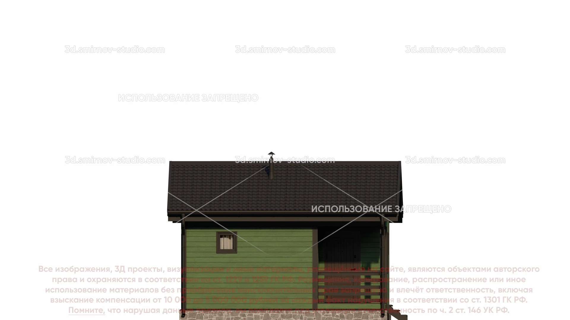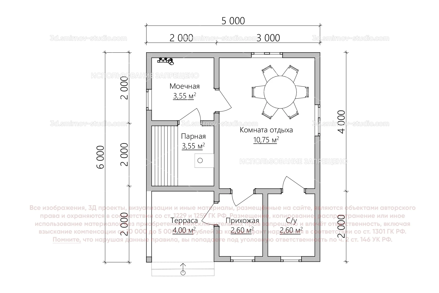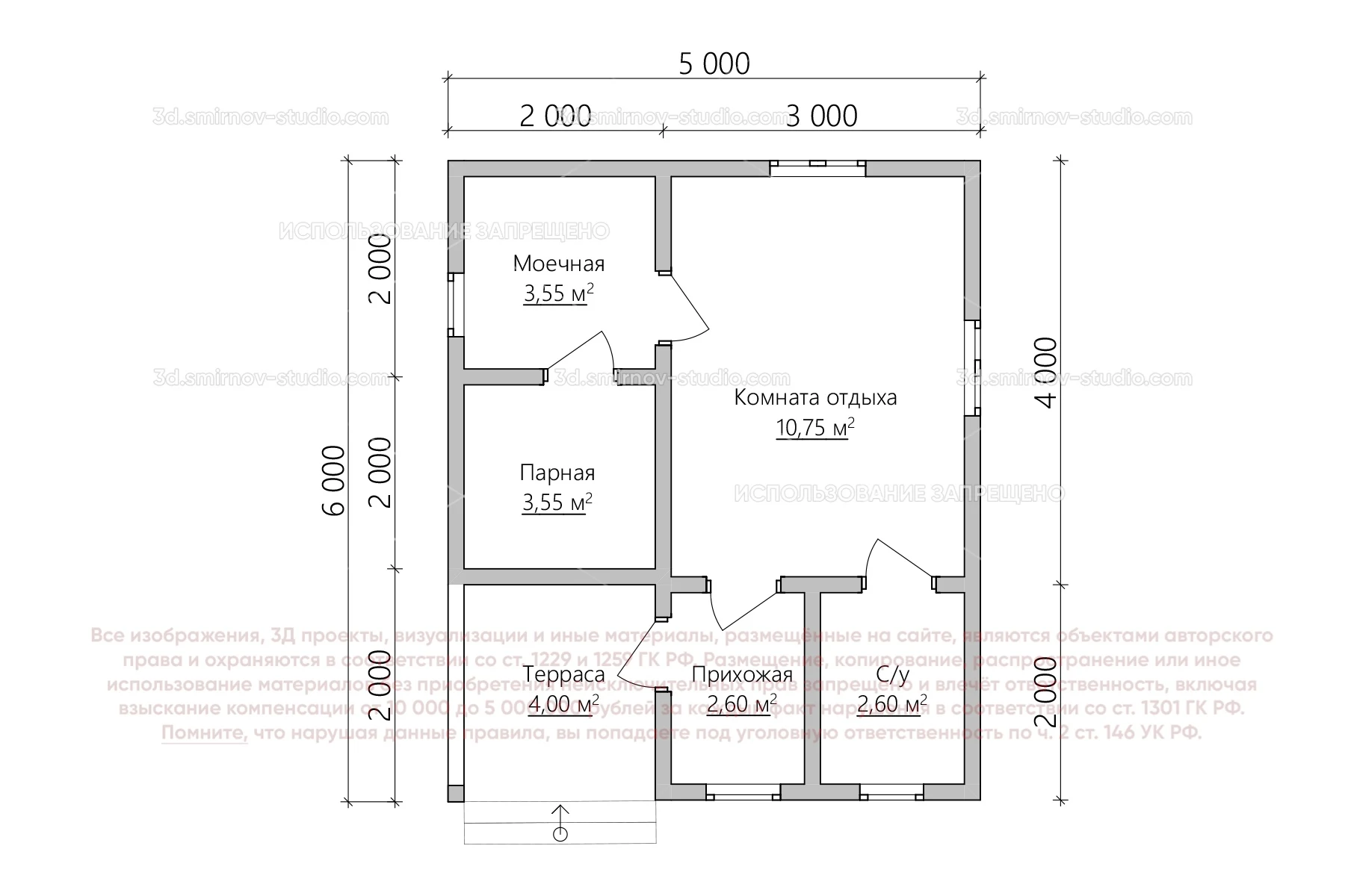 3Д проект одноэтажной каркасной бани 6 на 5 метров, площадью 27,05 м², с прямой крышей, крыльцом, санузлом и комнатой отдыха