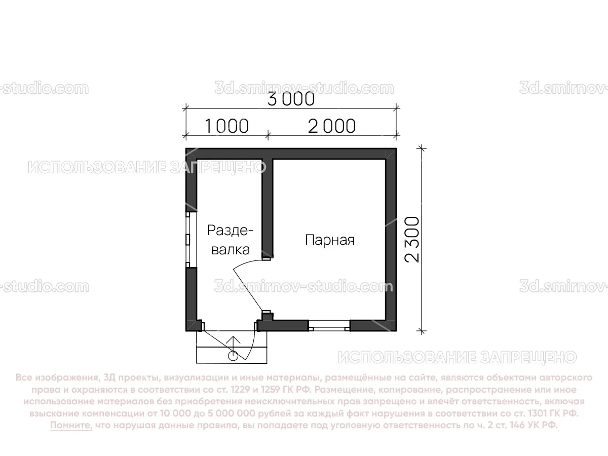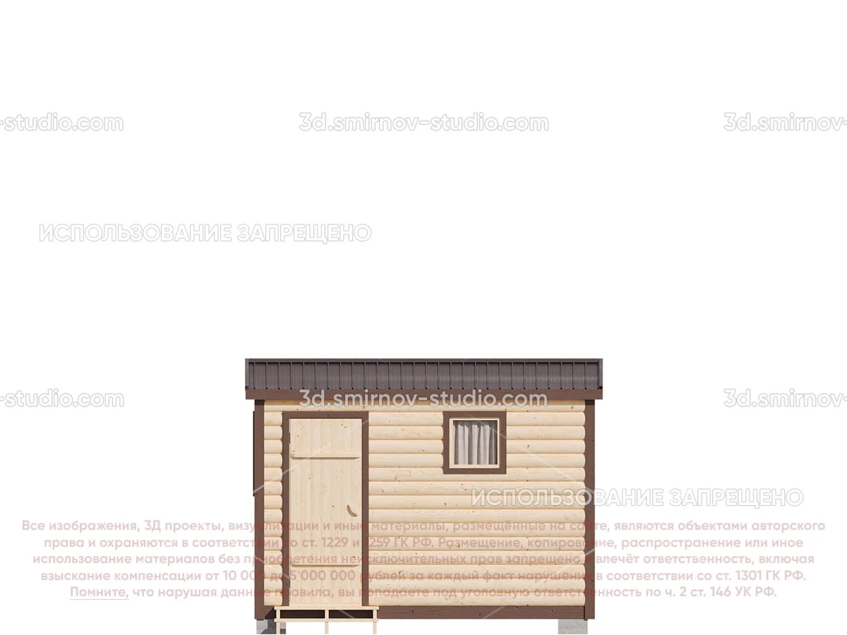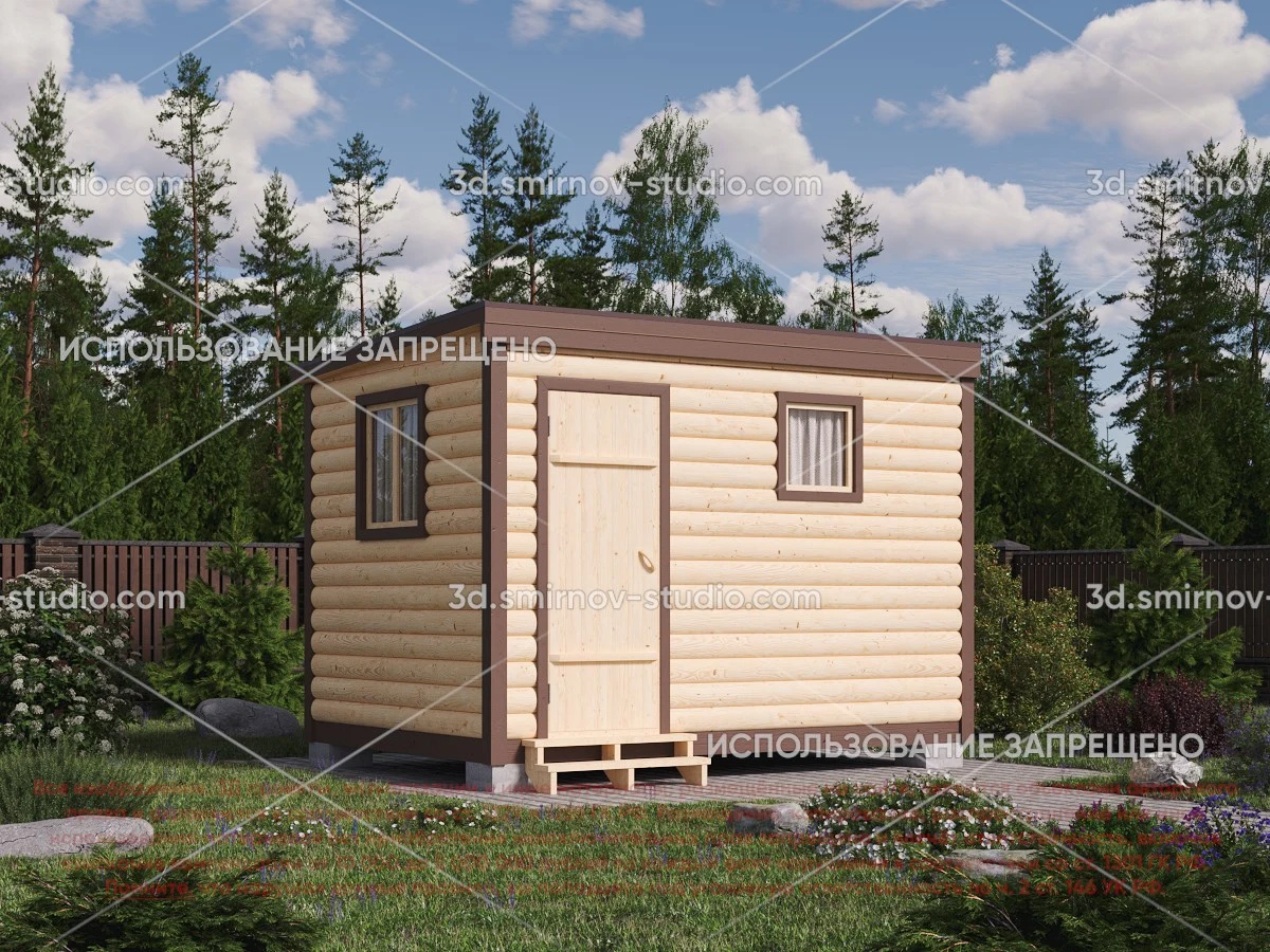 3Д проект мобильной бани из бруса 3 на 2.3 метра, площадью 5,20 м², с раздевалкой, двускатной и односкатной крышей