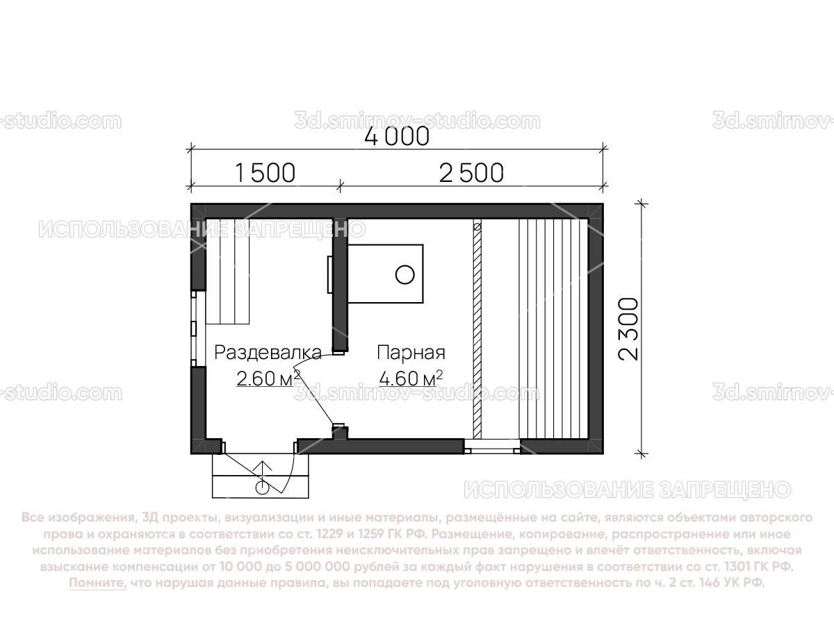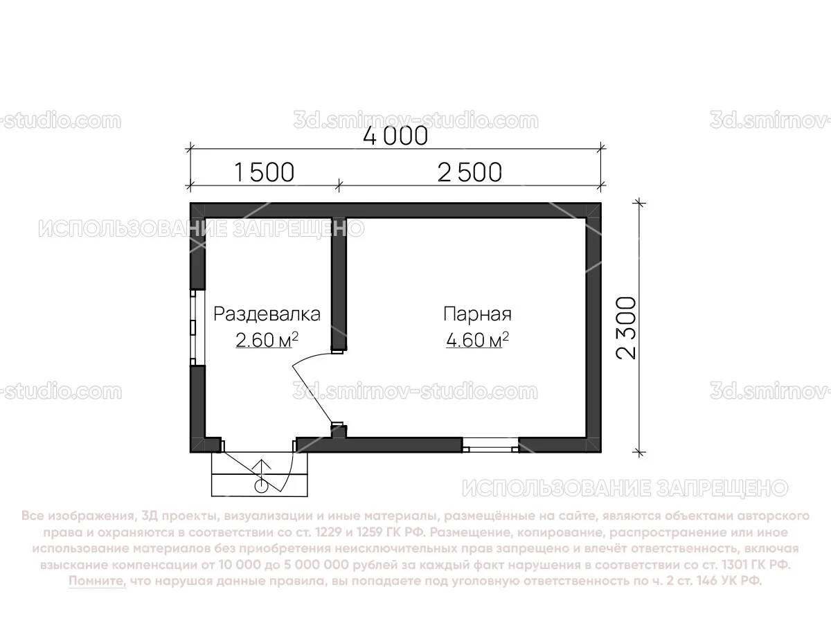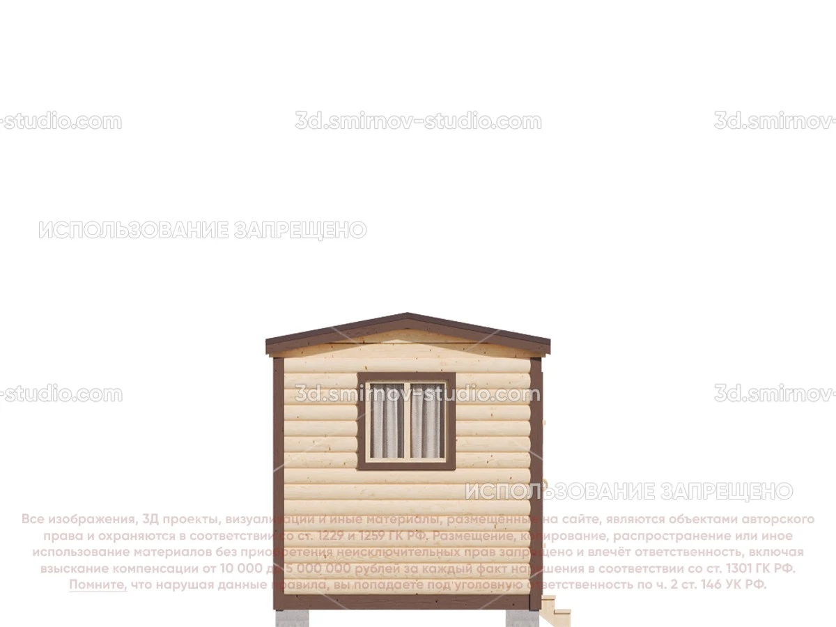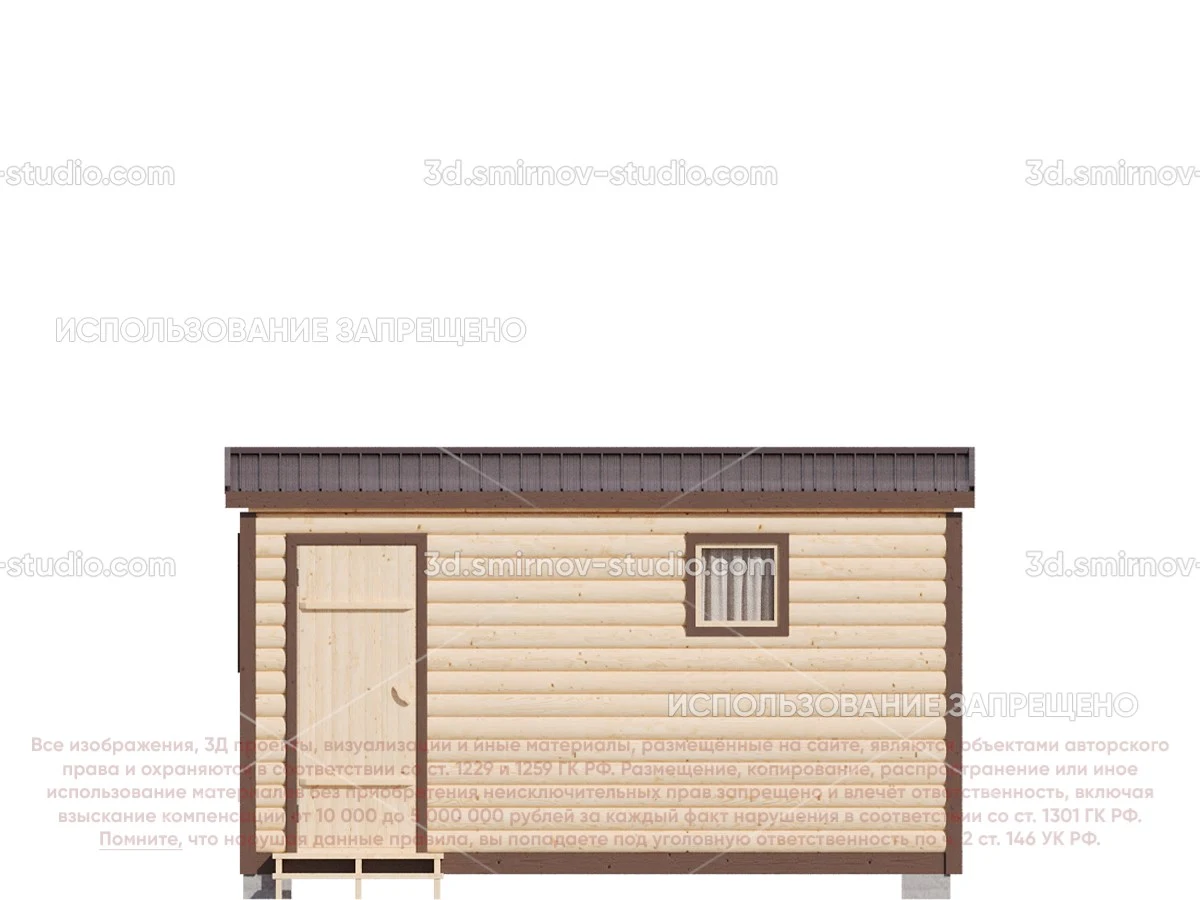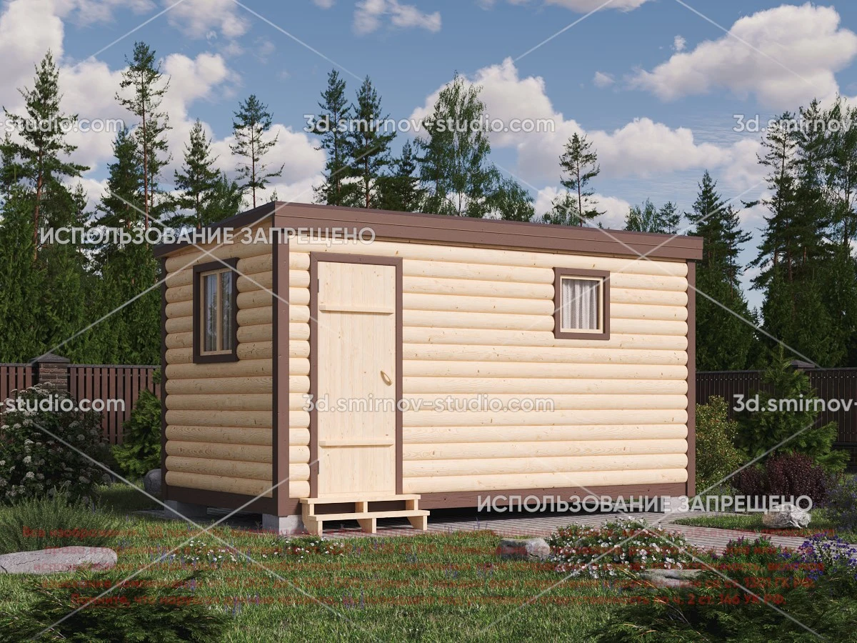 3Д проект мобильной бани из бруса 4 на 2.3 метра, площадью 7,20 м², с раздевалкой, двускатной и односкатной крышей