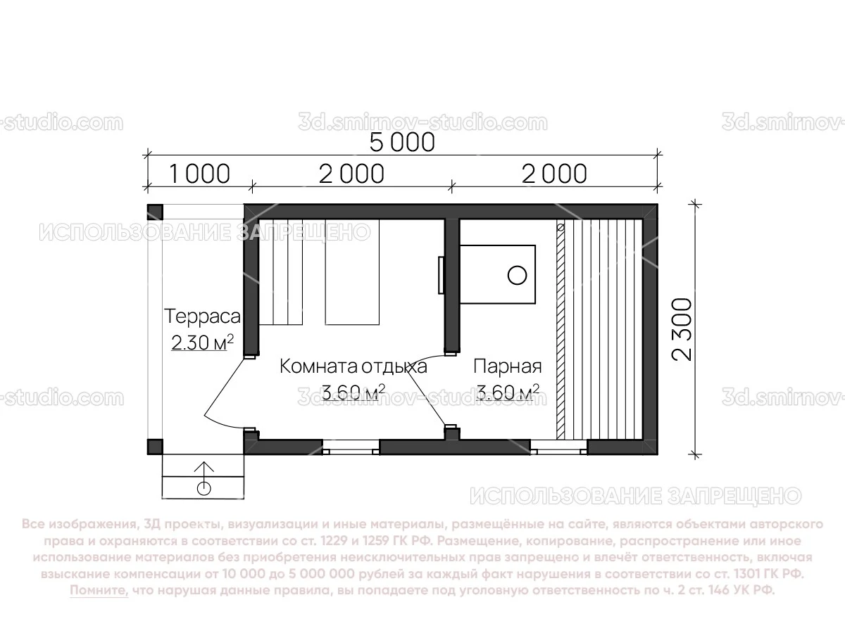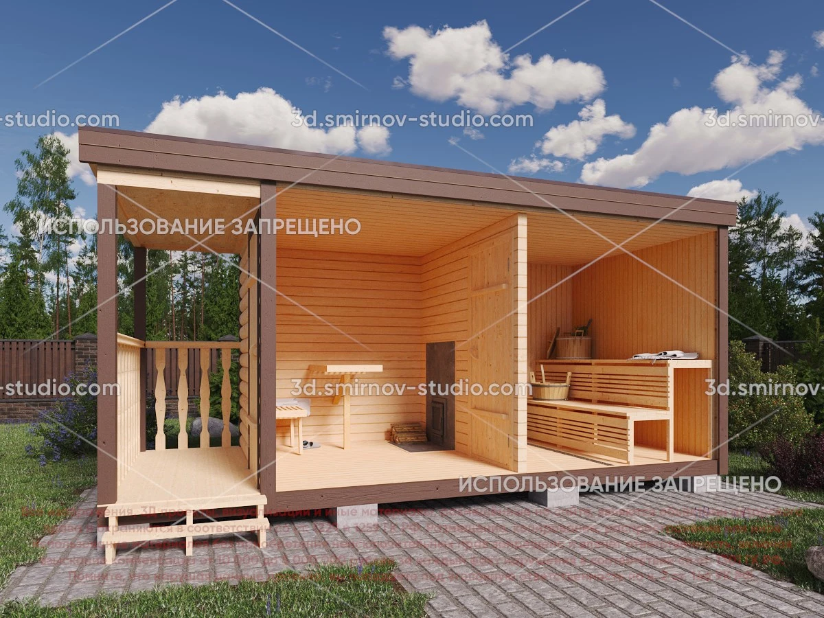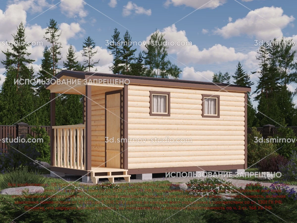 3Д проект мобильной бани из бруса 5 на 2.3 метра, площадью 9,50 м², с террасой и комнатой отдыха, двускатной и односкатной крышей