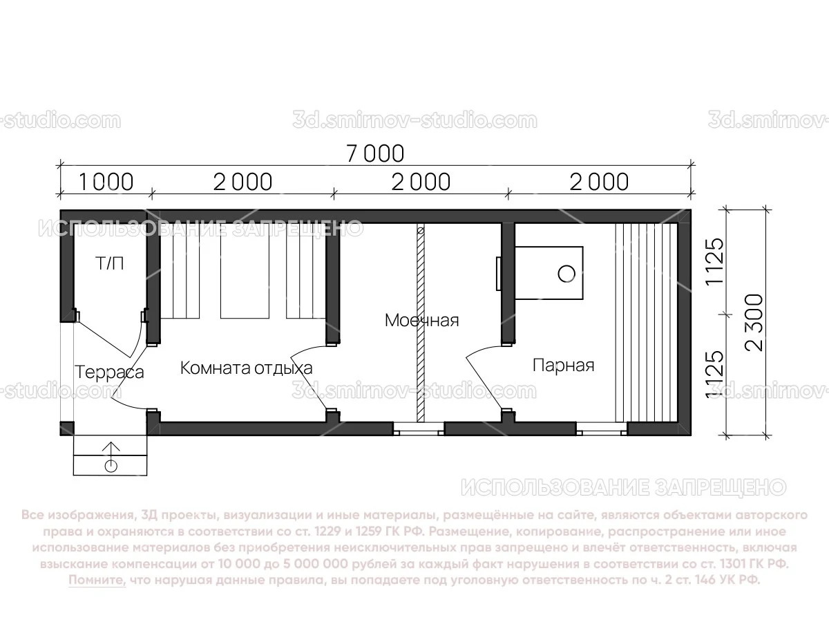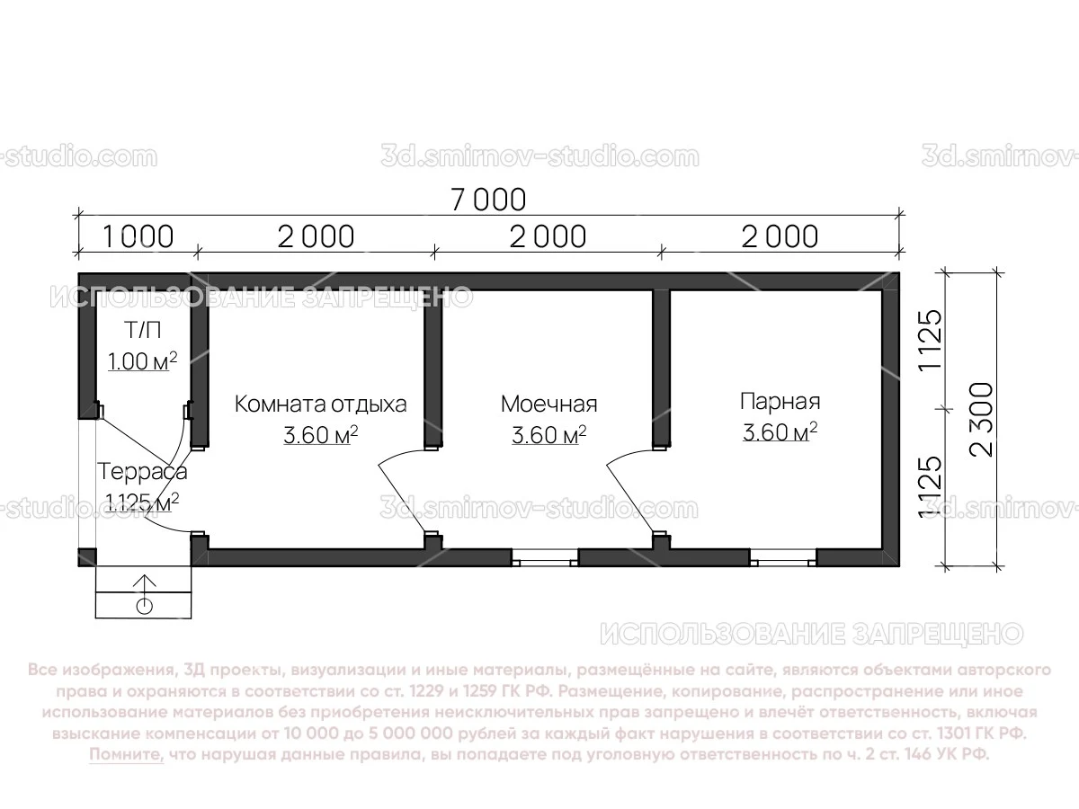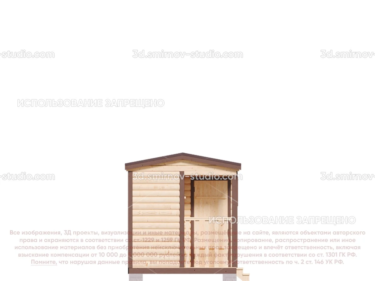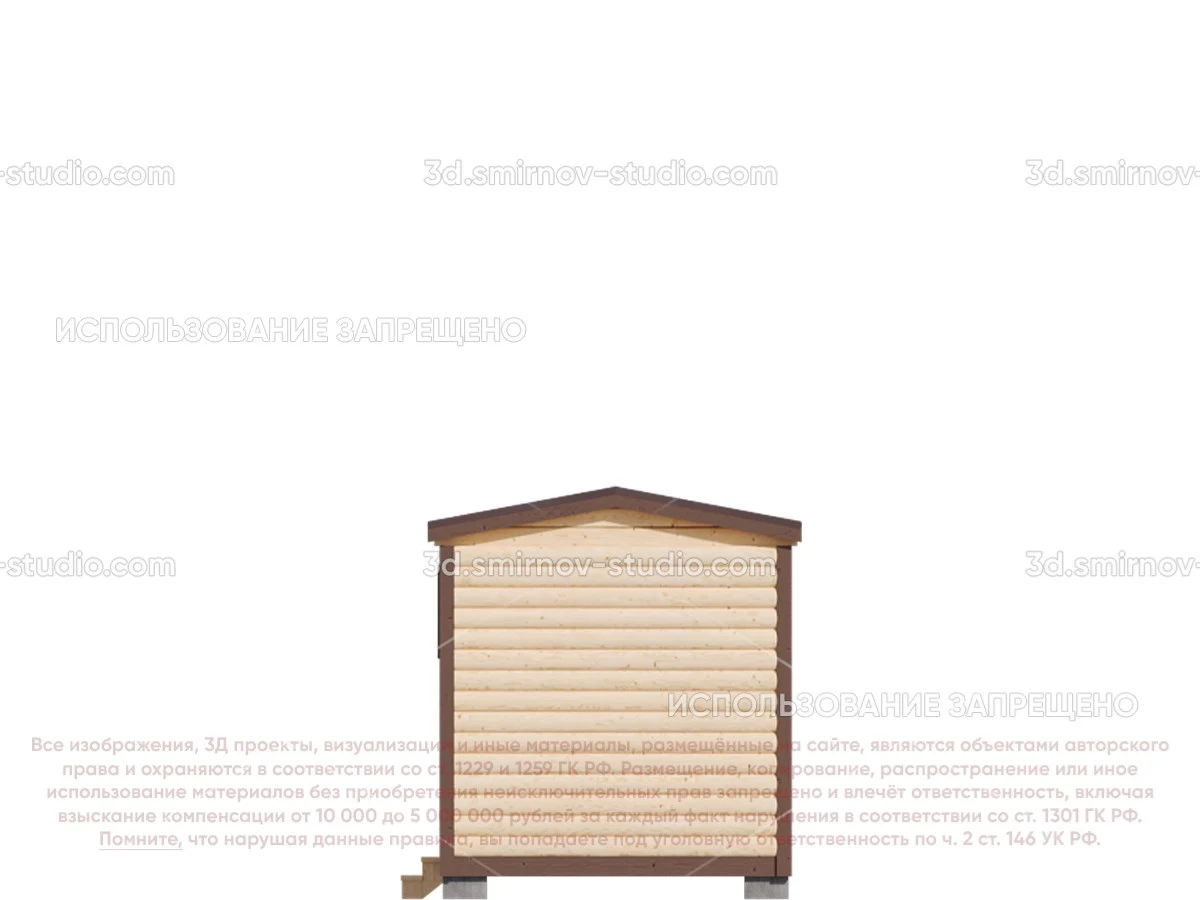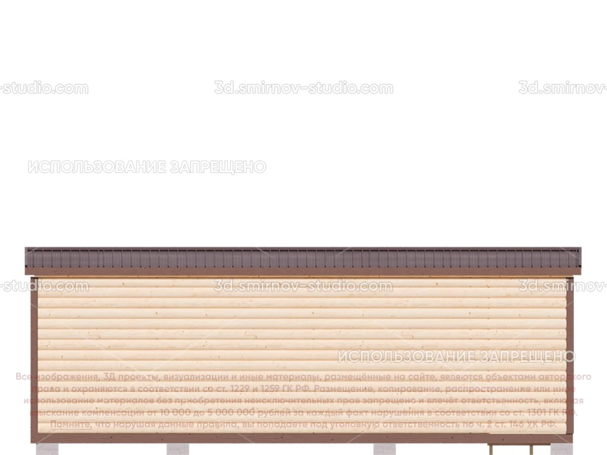 3Д проект мобильной бани из бруса 7 на 2.3 метра, площадью 12,90 м², с террасой, комнатой отдыха, тех. помещением и моечной, двускатной и односкатной крышей