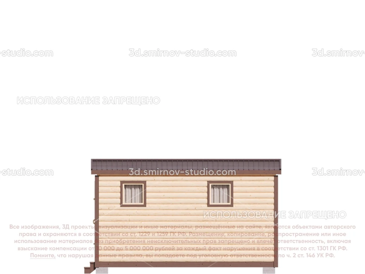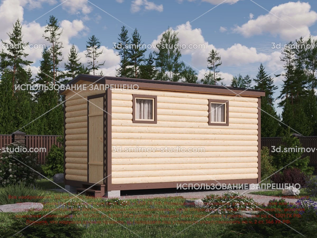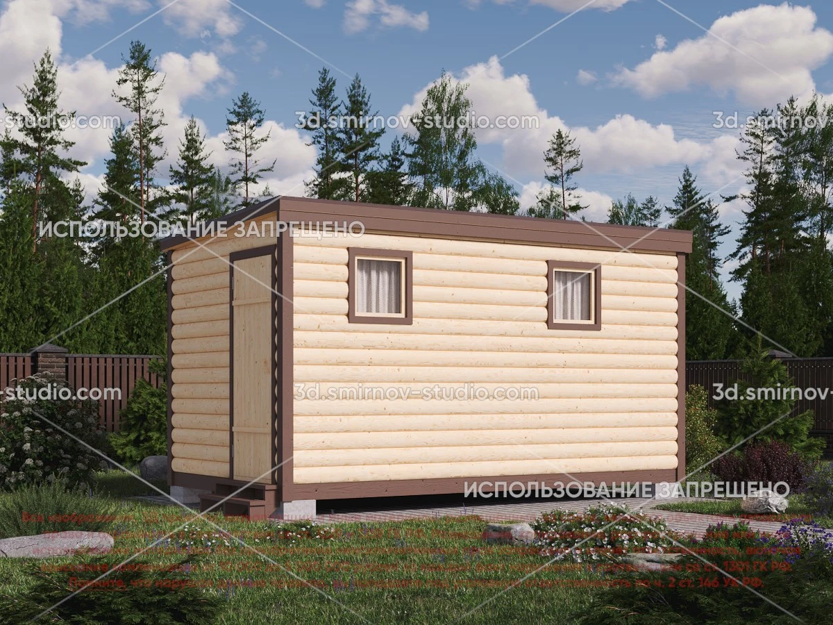 3Д проект мобильной бани из бруса 4 на 2.3 метра, площадью 7,20 м², с раздевалкой, двускатной и односкатной крышей