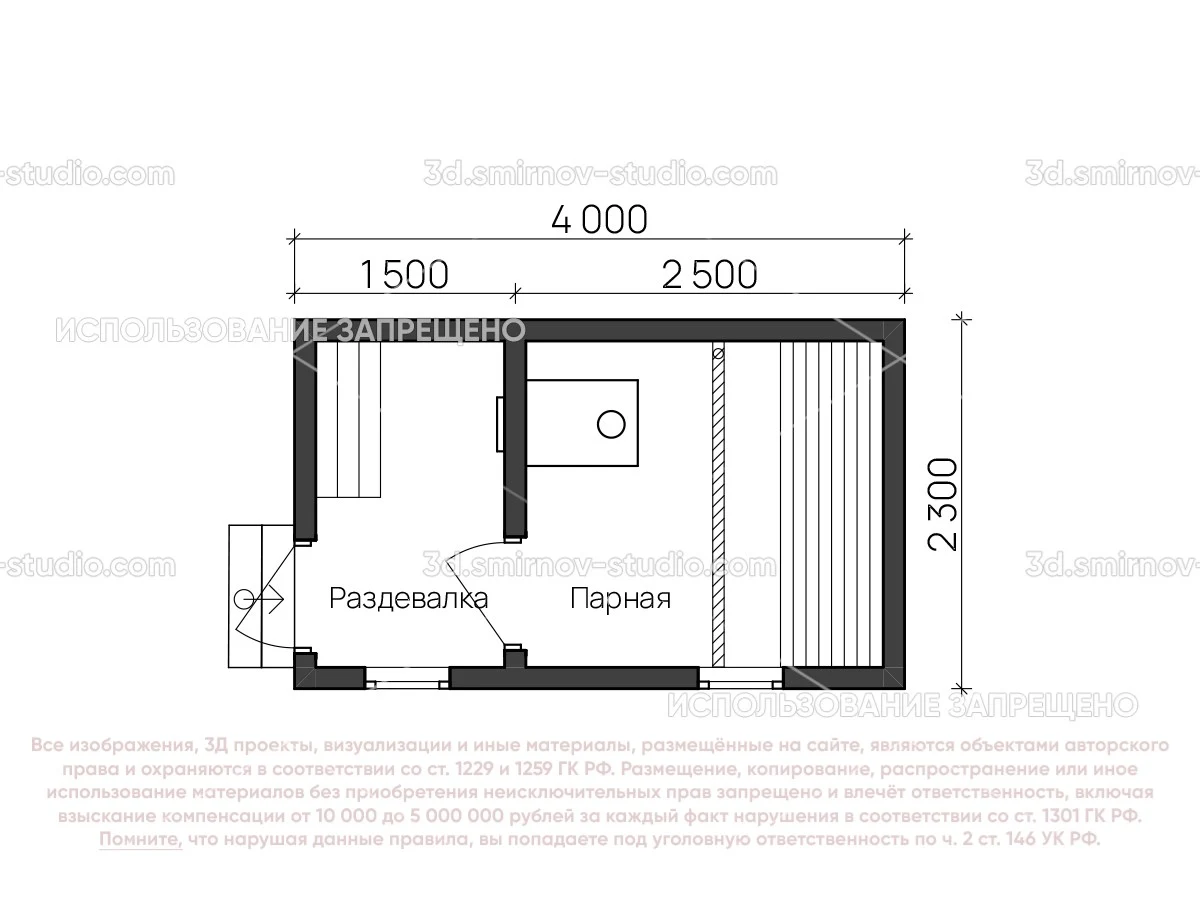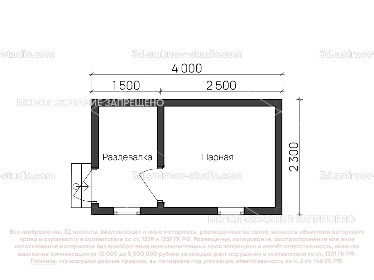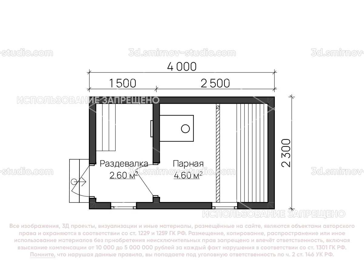 3Д проект мобильной бани из бруса 4 на 2.3 метра, площадью 7,20 м², с раздевалкой, двускатной и односкатной крышей