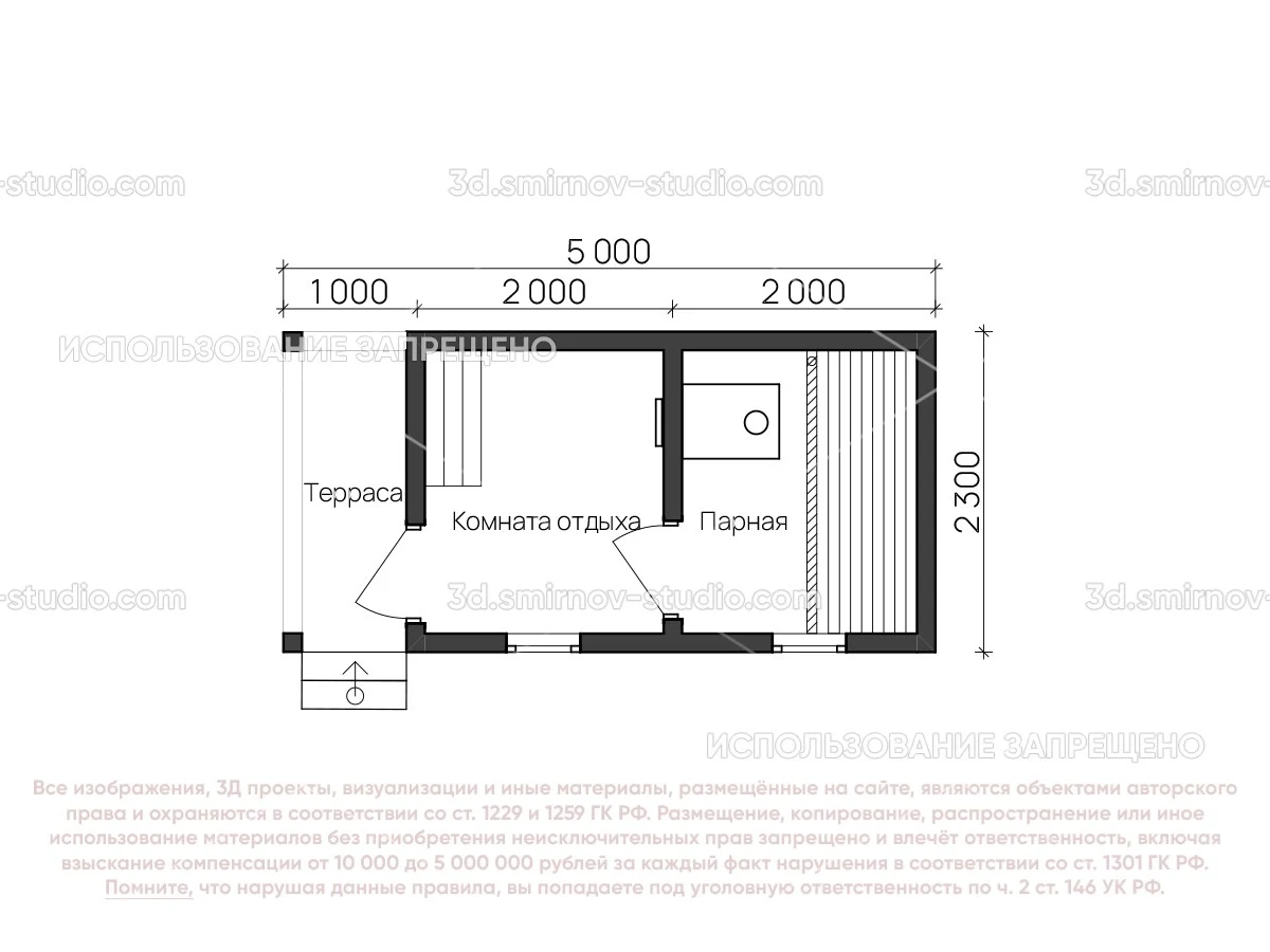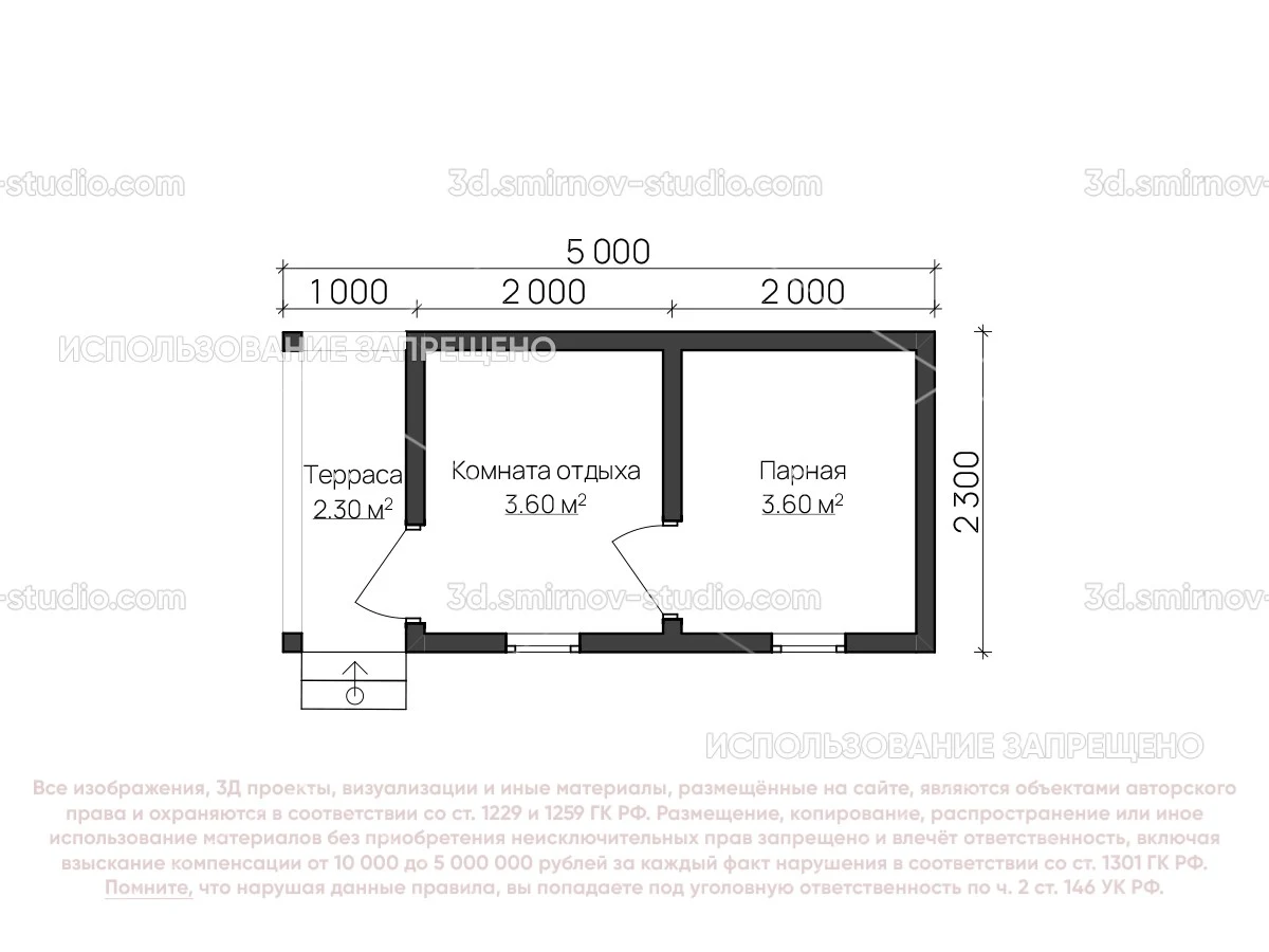 3Д проект мобильной бани из бруса 5 на 2.3 метра, площадью 9,50 м², с террасой и комнатой отдыха, двускатной и односкатной крышей