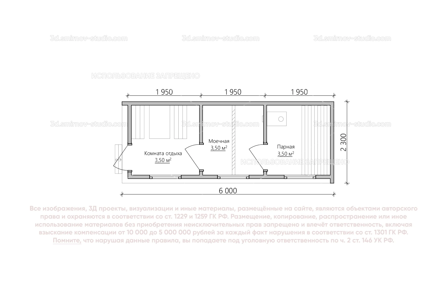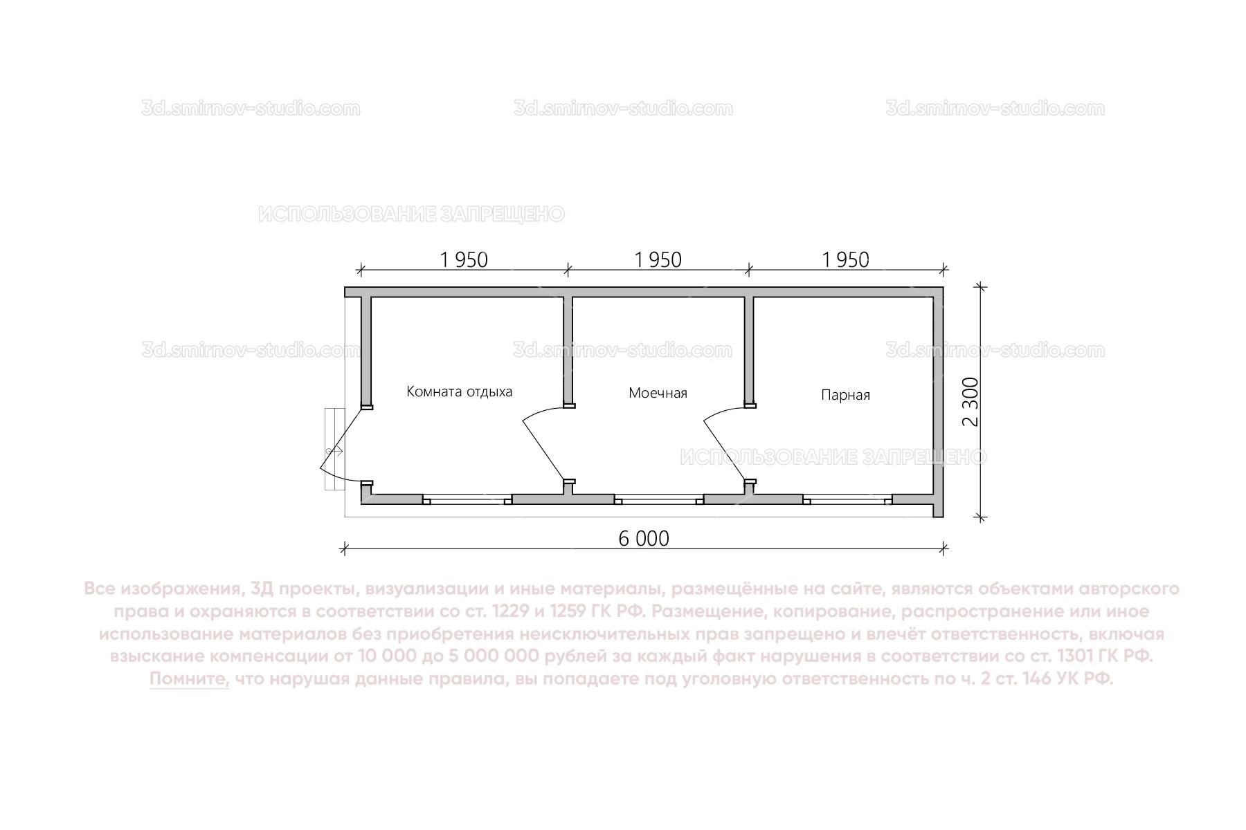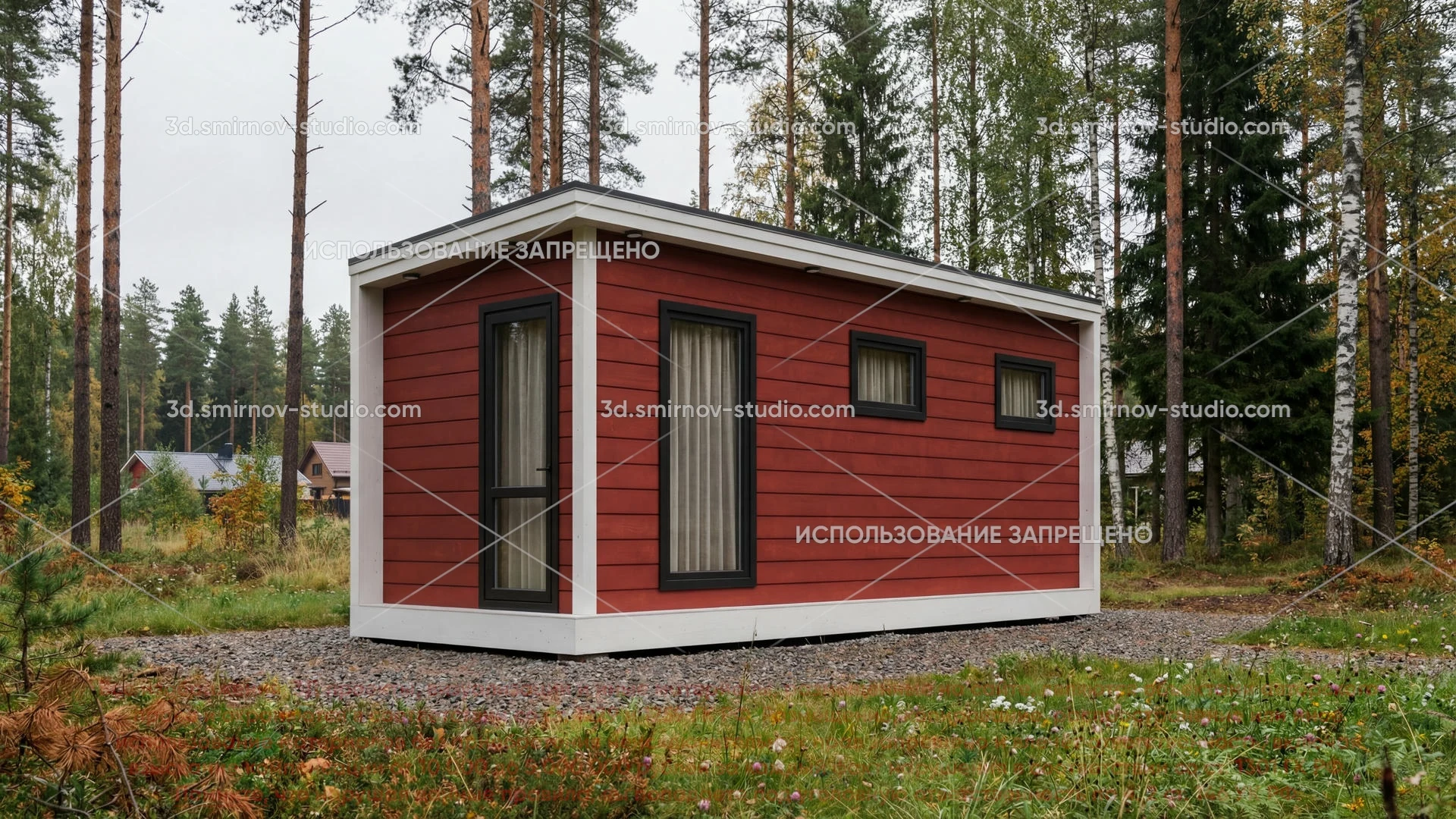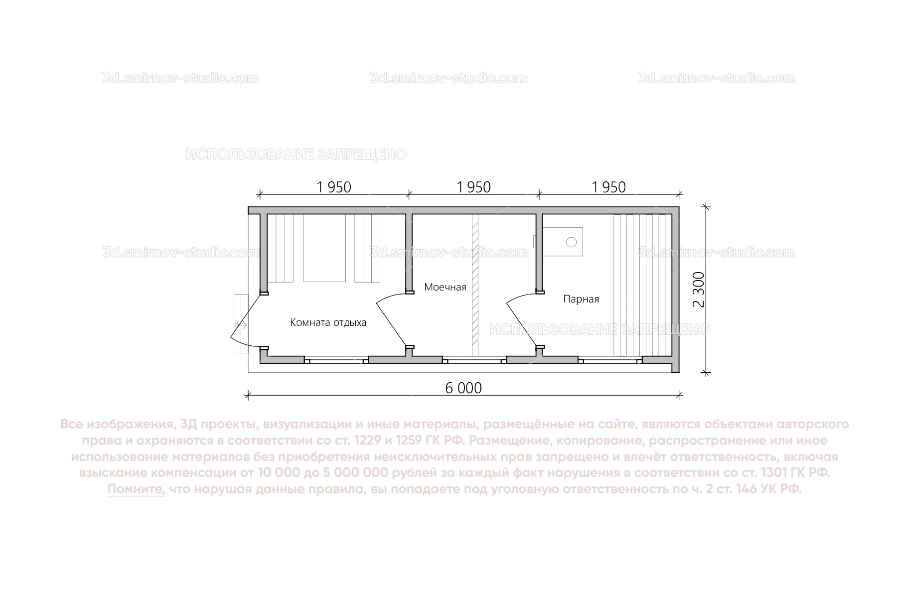 3Д проект мобильной бани в скандинавском стиле 6 на 2.3 метра, площадью 10,5 м², с односкатной крышей, моечной и комнатой отдыха