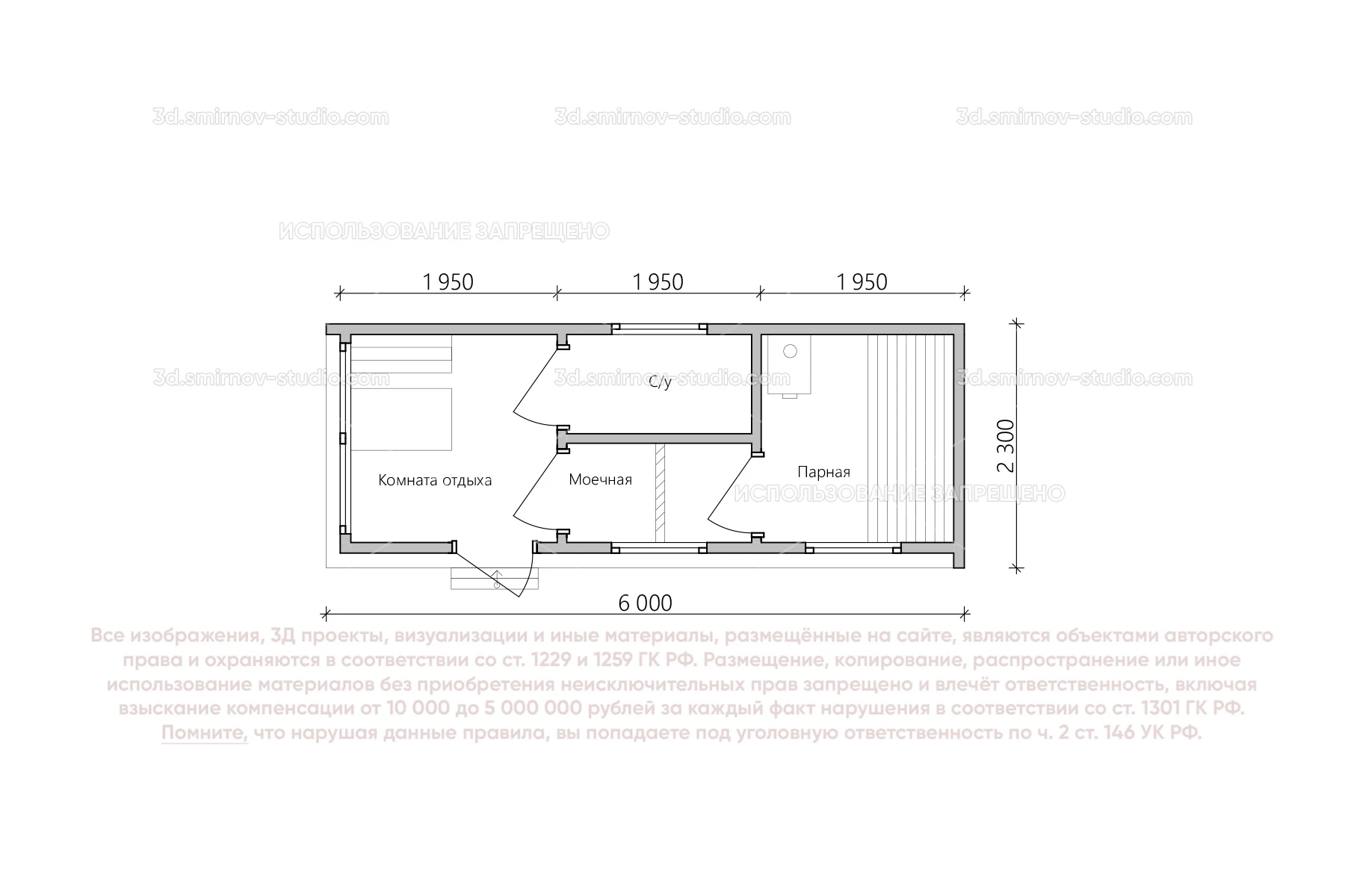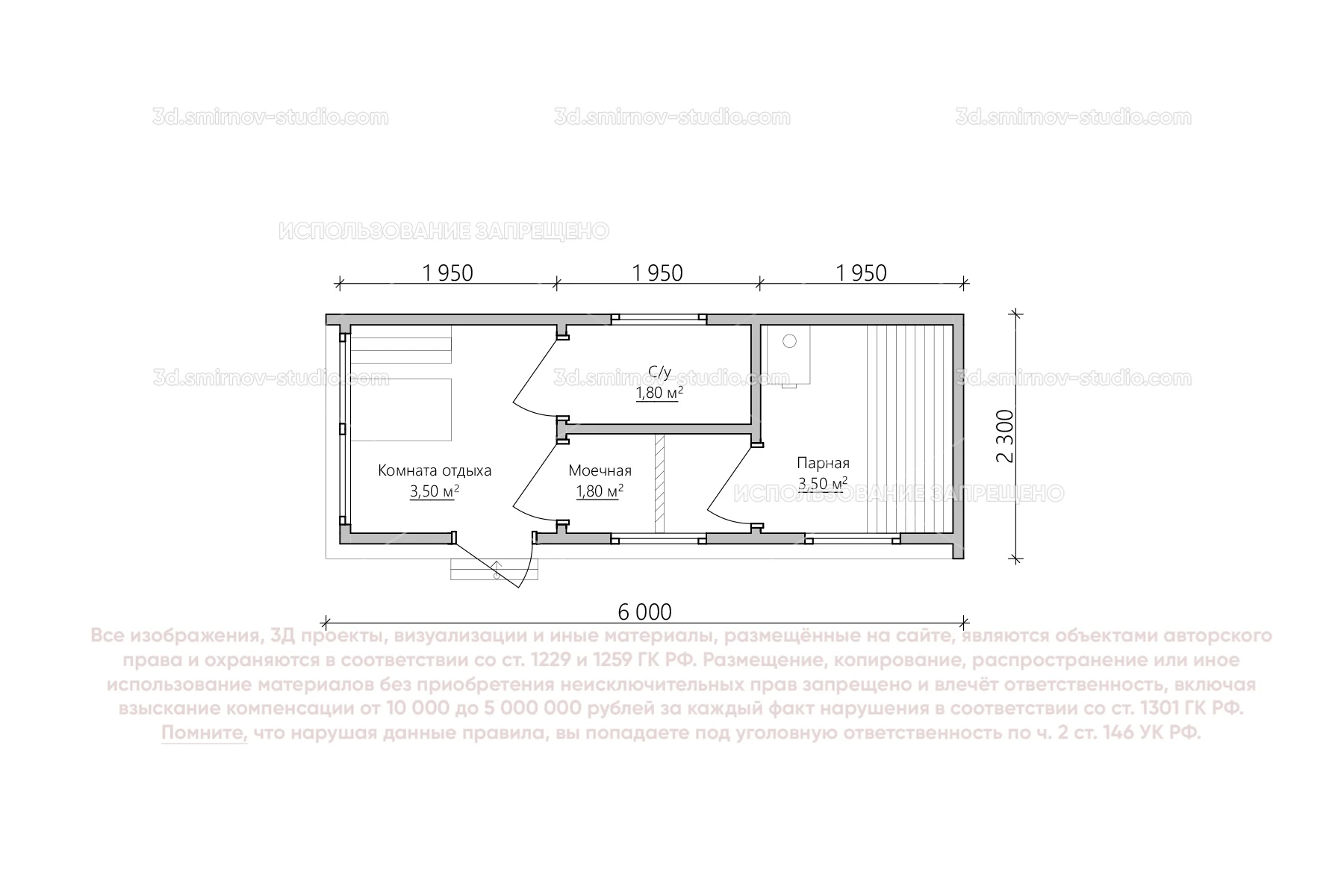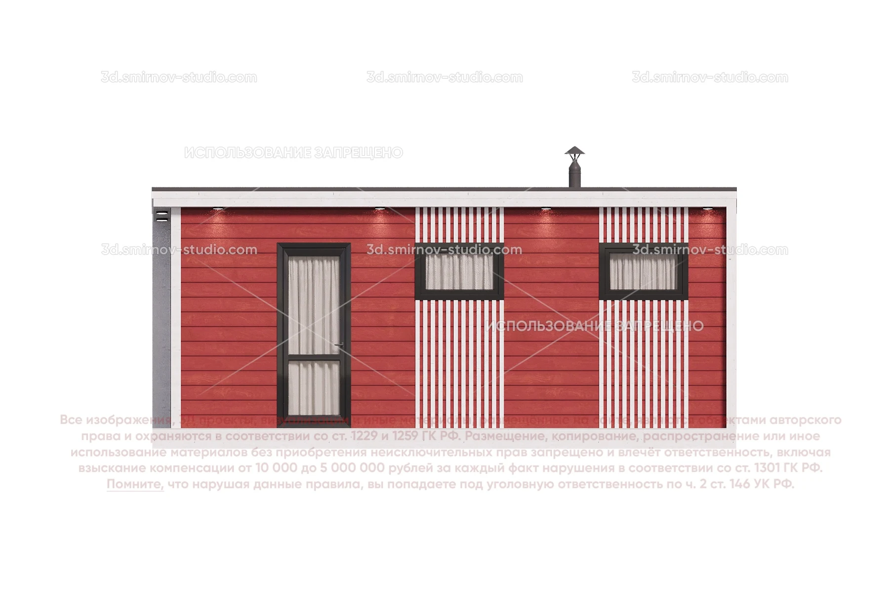 3Д проект мобильной бани в скандинавском стиле 6 на 2.3 метра, площадью 12,2 м², с односкатной крышей, санузлом, моечной и комнатой отдыха