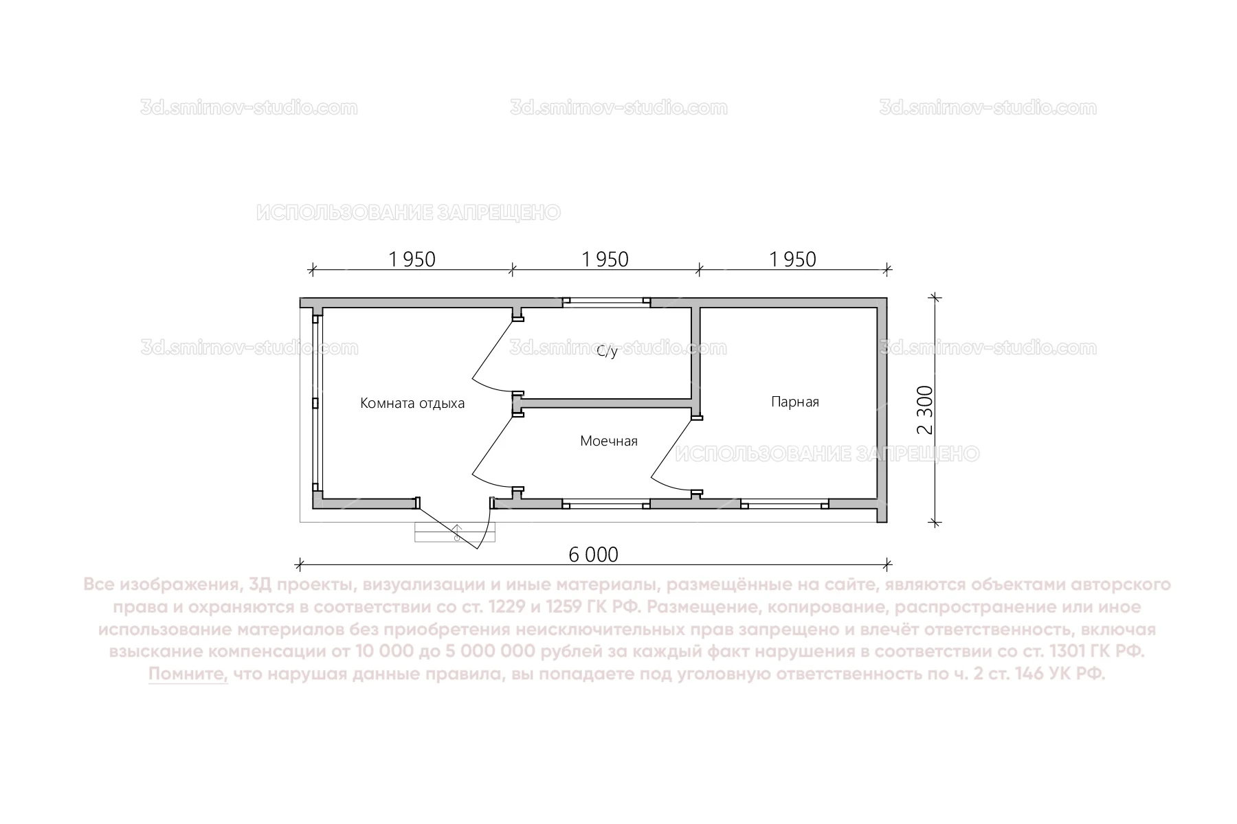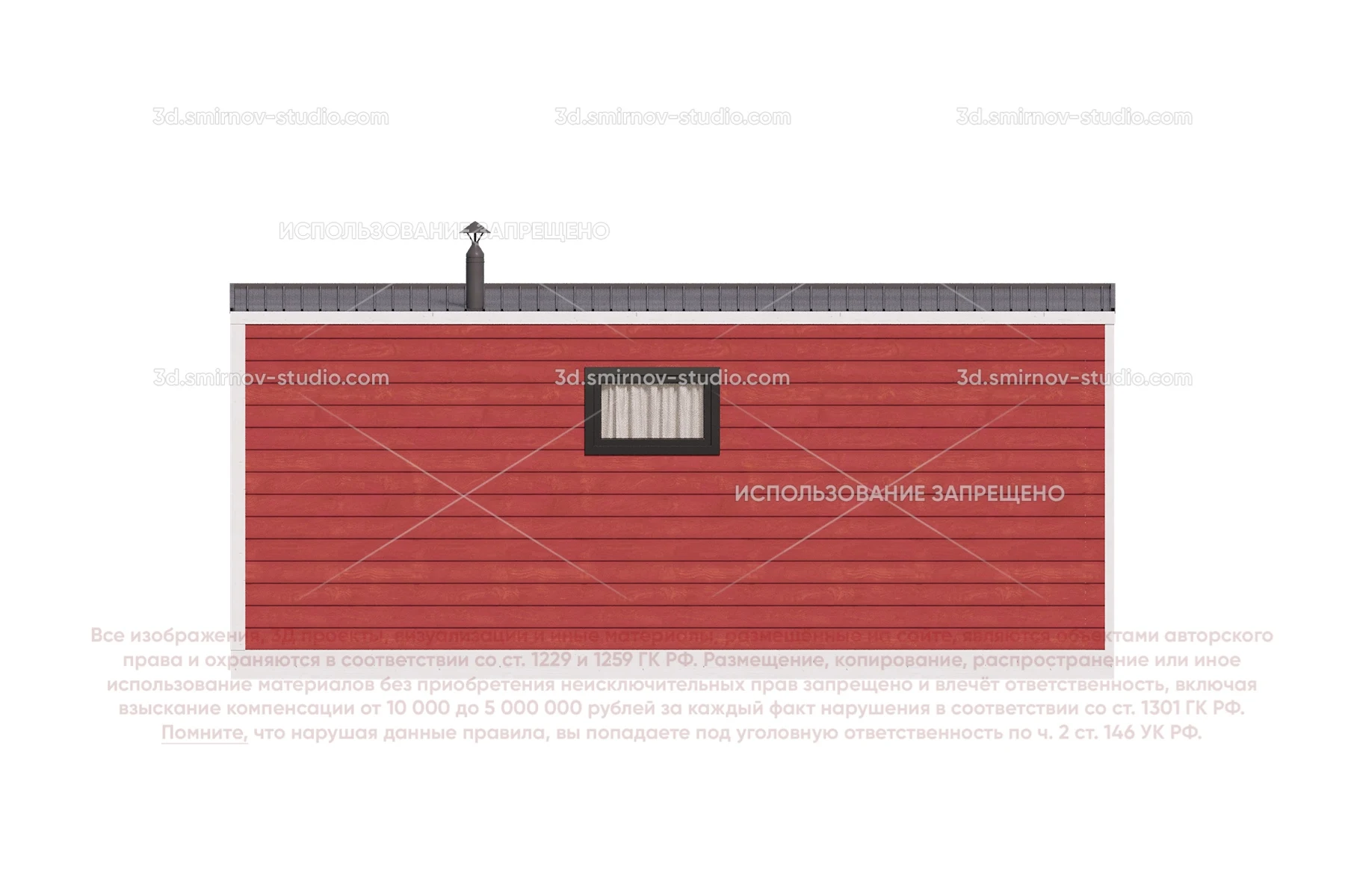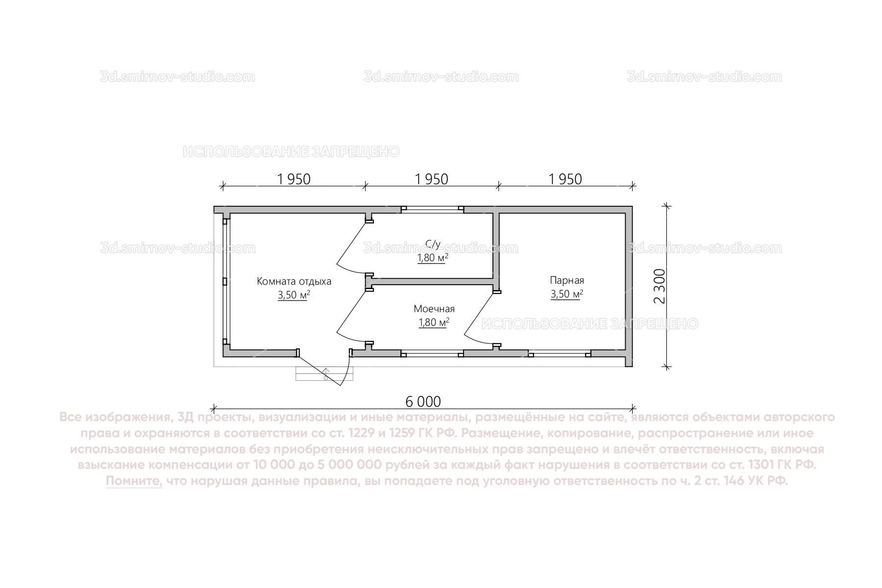 3Д проект мобильной бани в скандинавском стиле 6 на 2.3 метра, площадью 12,2 м², с односкатной крышей, санузлом, моечной и комнатой отдыха