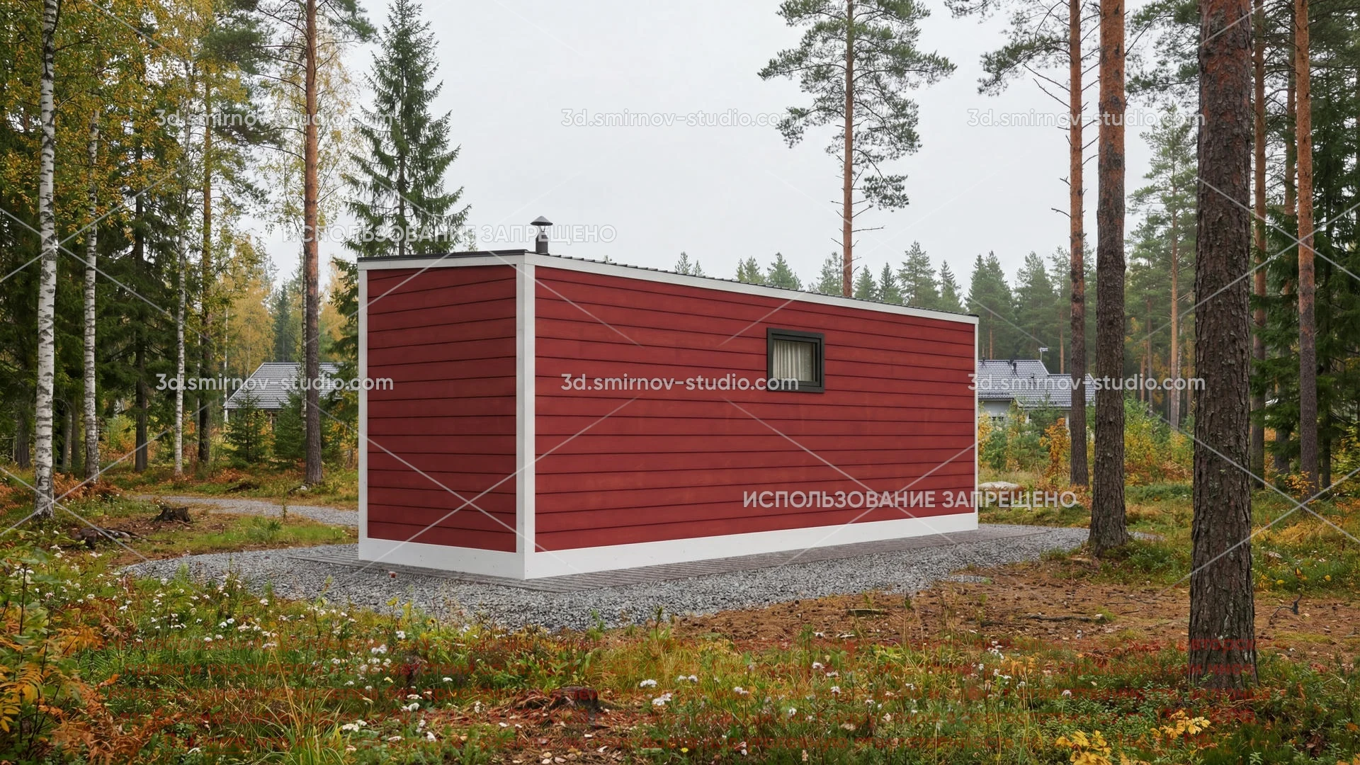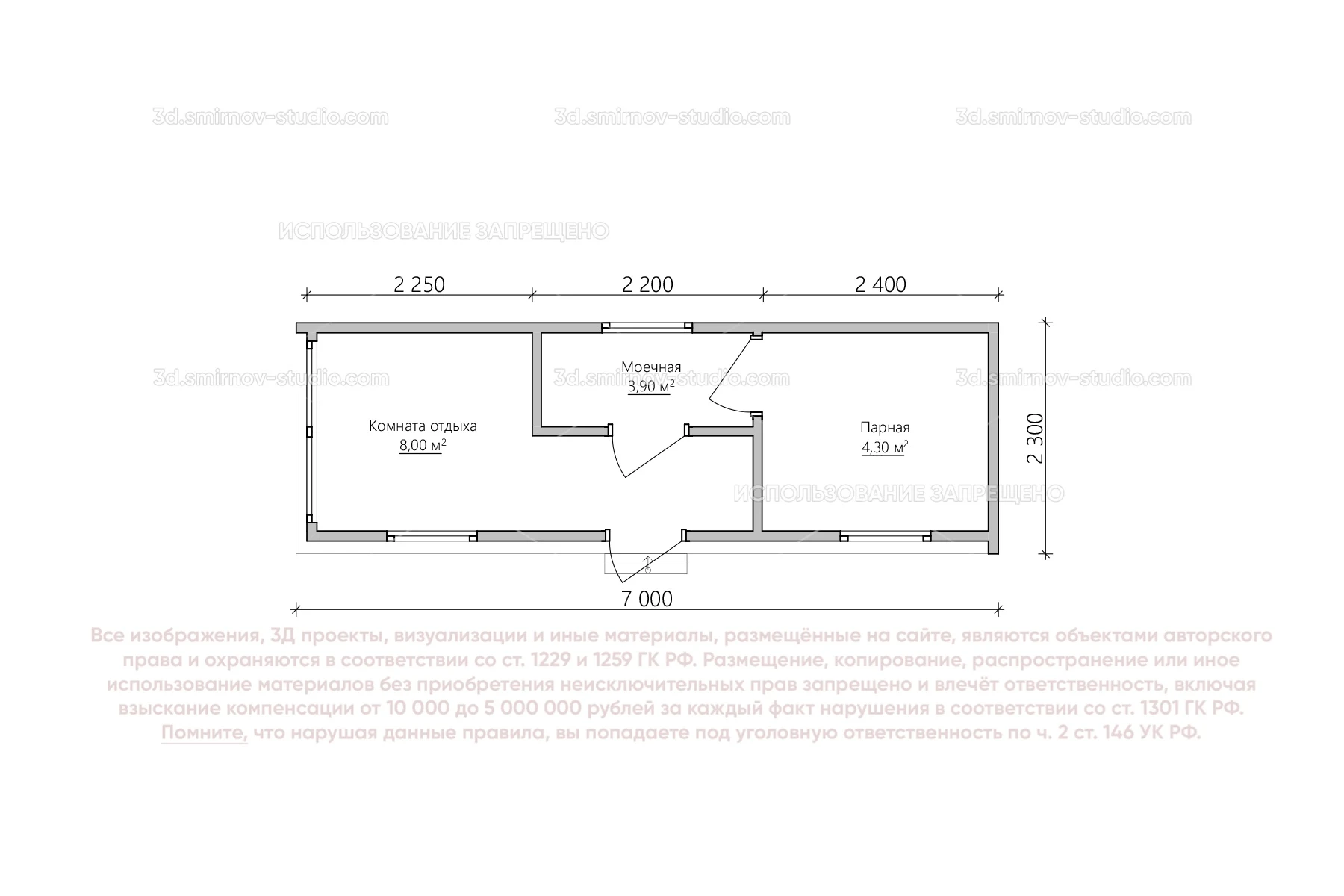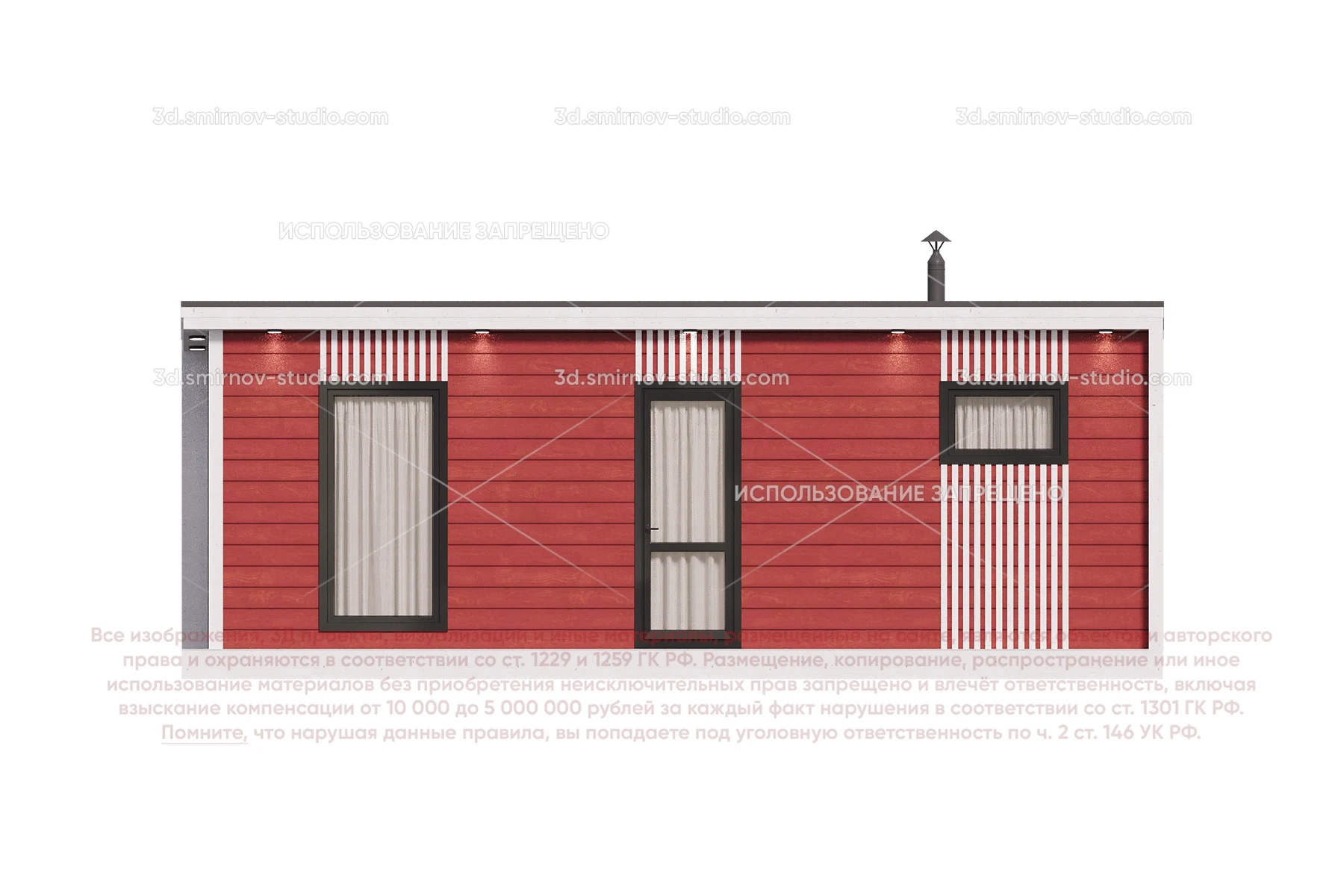 3Д проект мобильной бани в скандинавском стиле 7 на 2.3 метра, площадью 16,2 м², с односкатной крышей, моечной и комнатой отдыха
