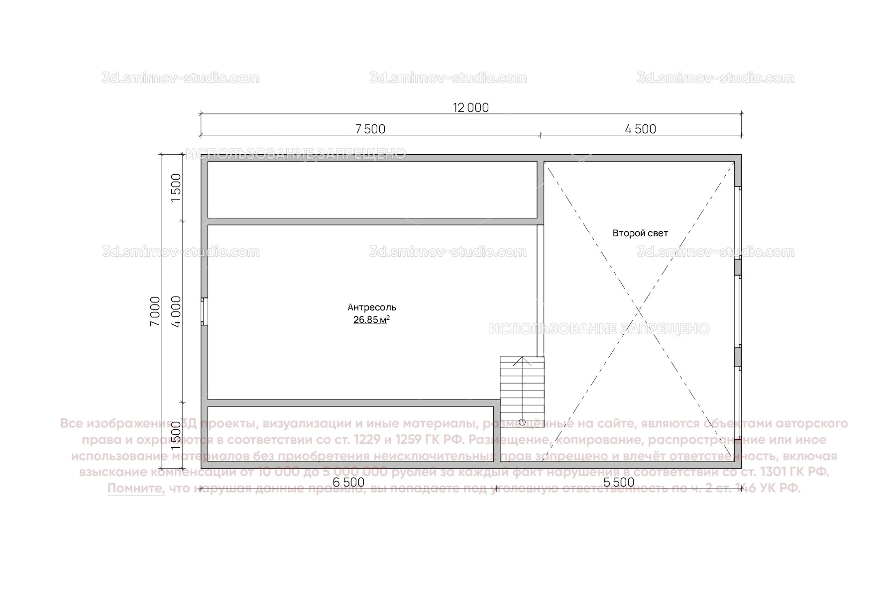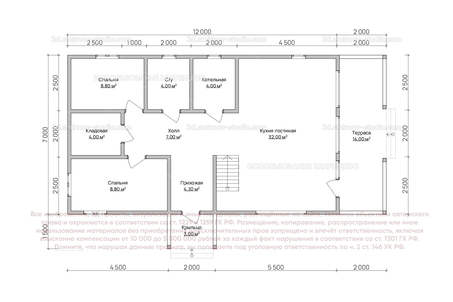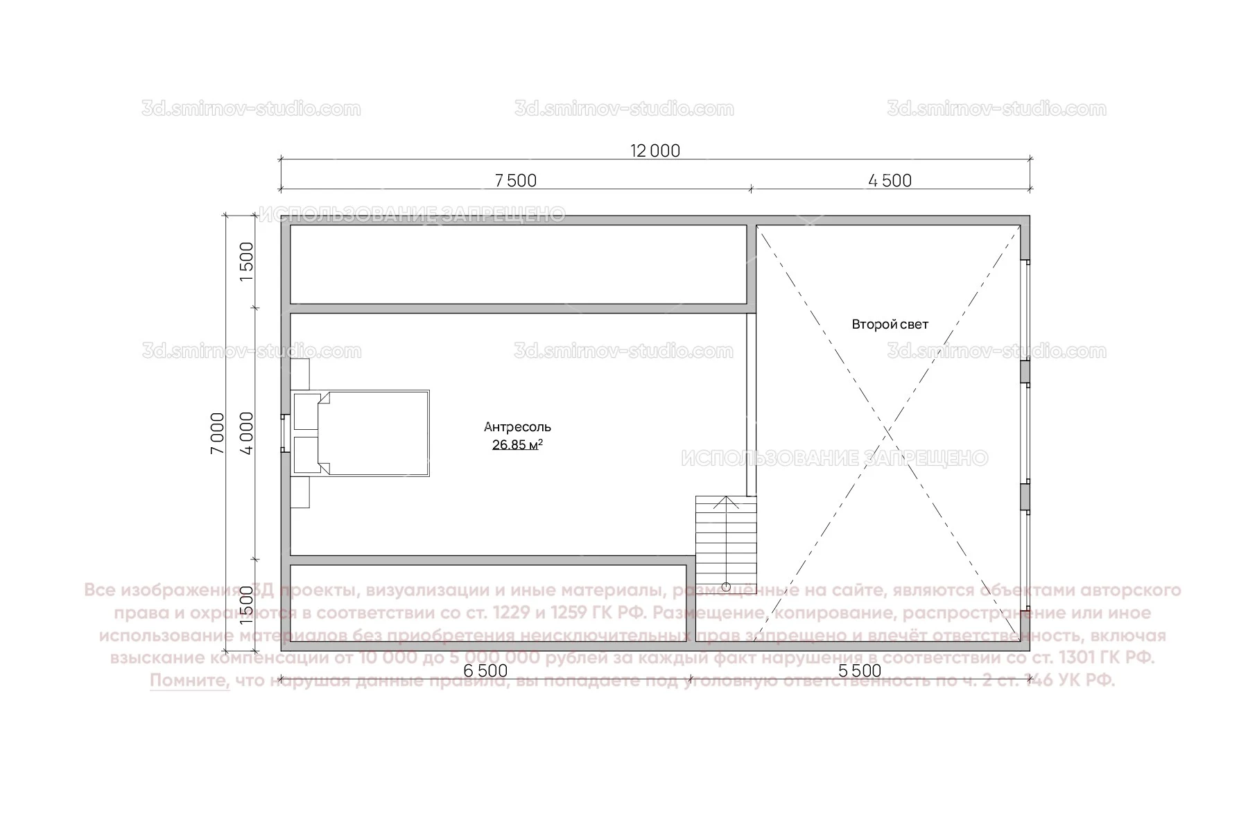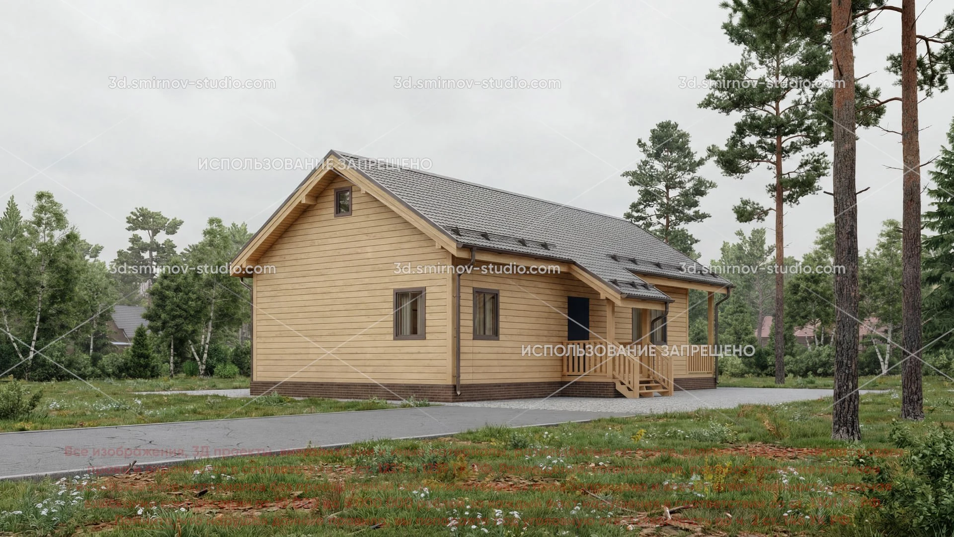 3Д проект дома из бруса 12 на 7 метров, площадью 116,75 м², с прямой крышей, террасой, крыльцом и антресолью