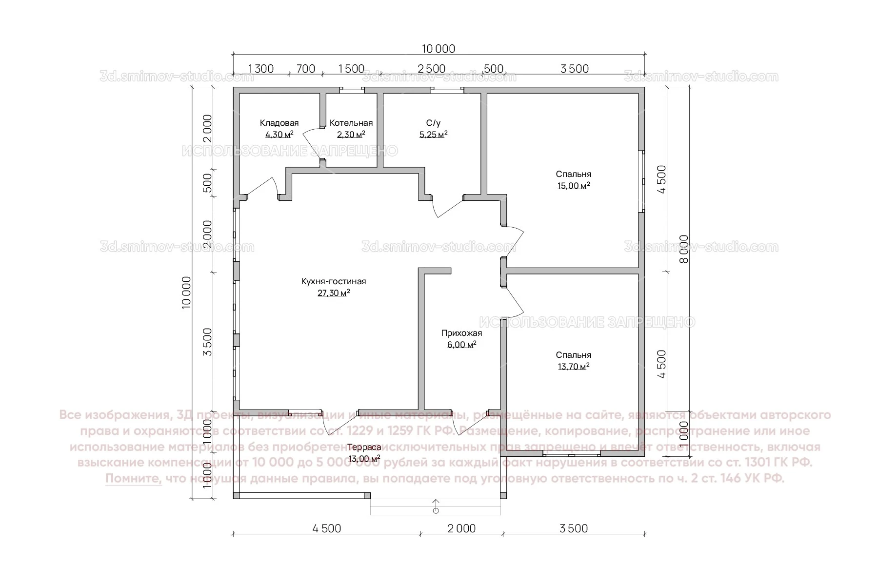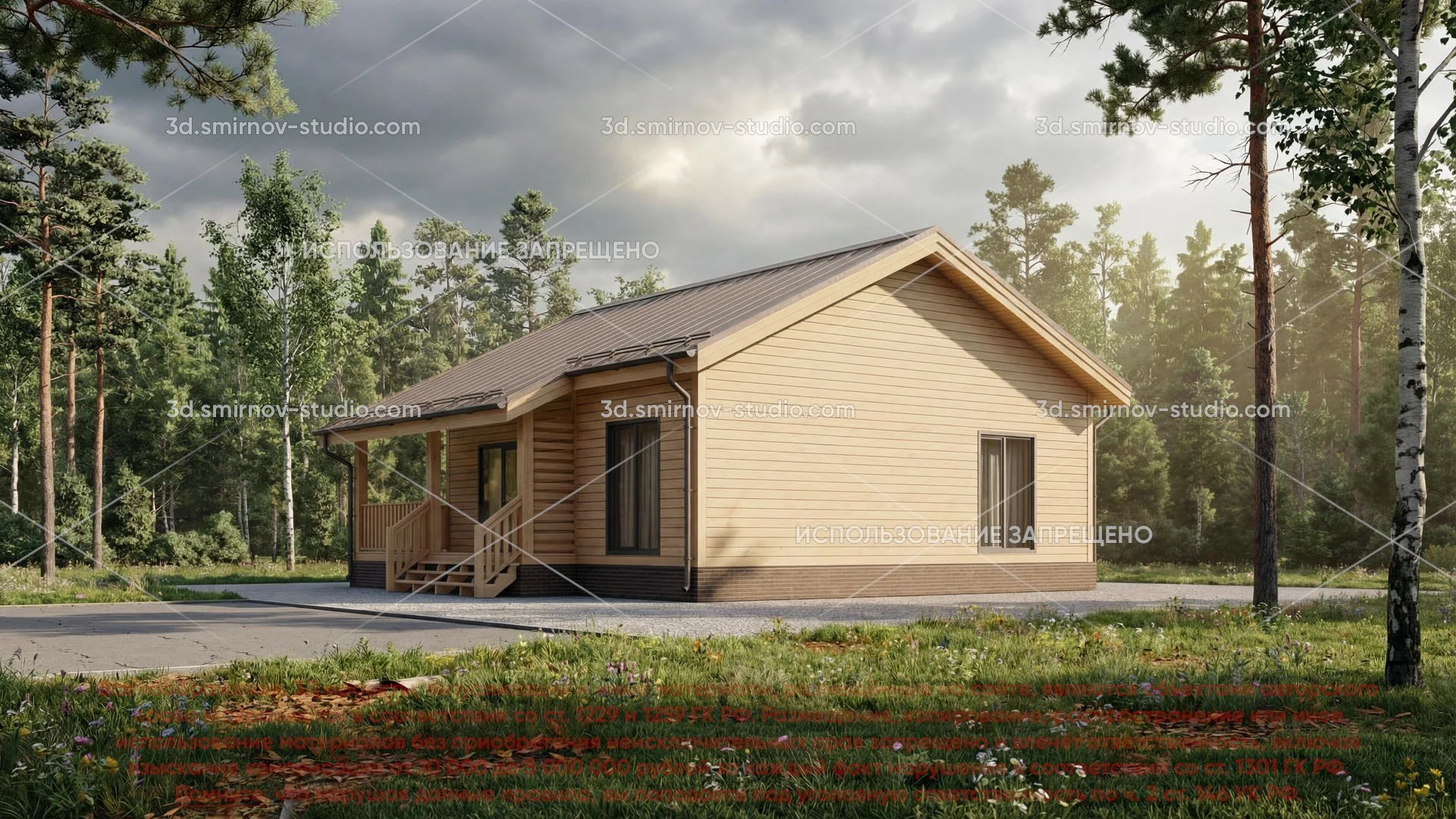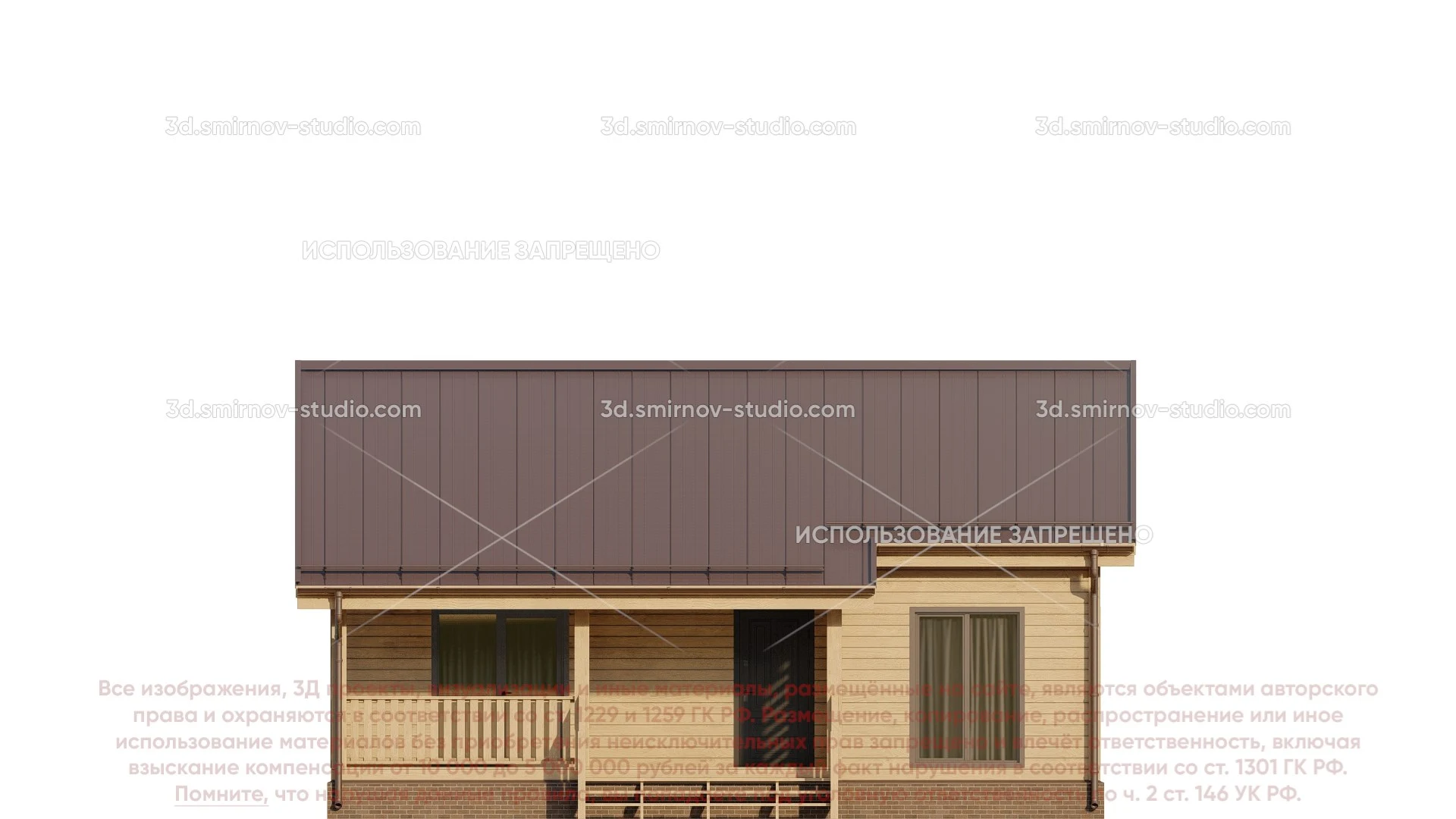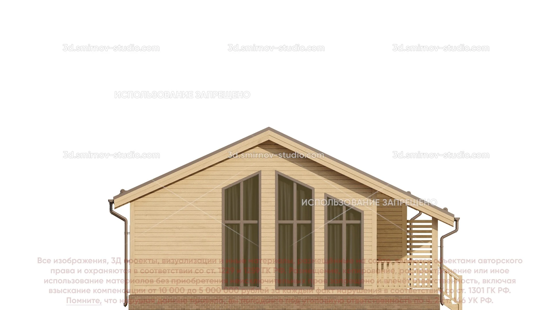 3Д проект дома из бруса 10 на 10 метров, площадью 86,85 м², с прямой крышей, террасой, котельной и санузлом
