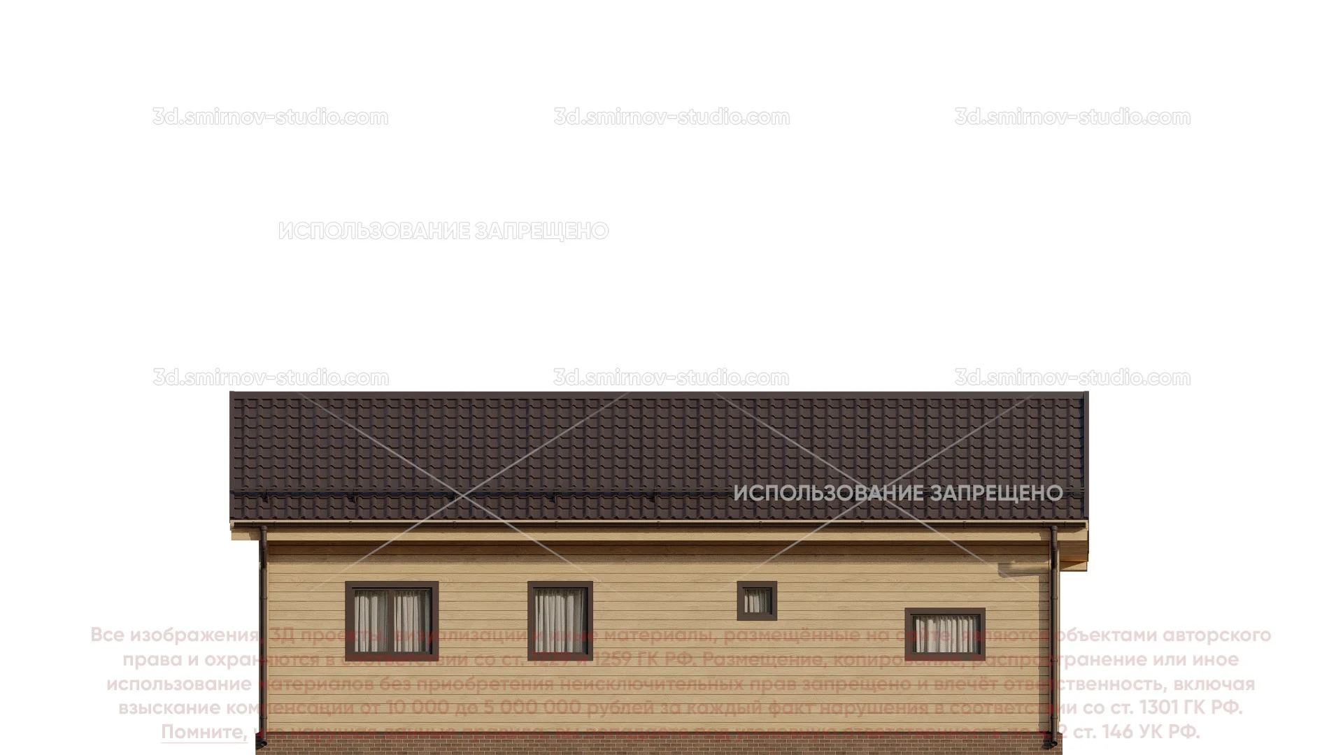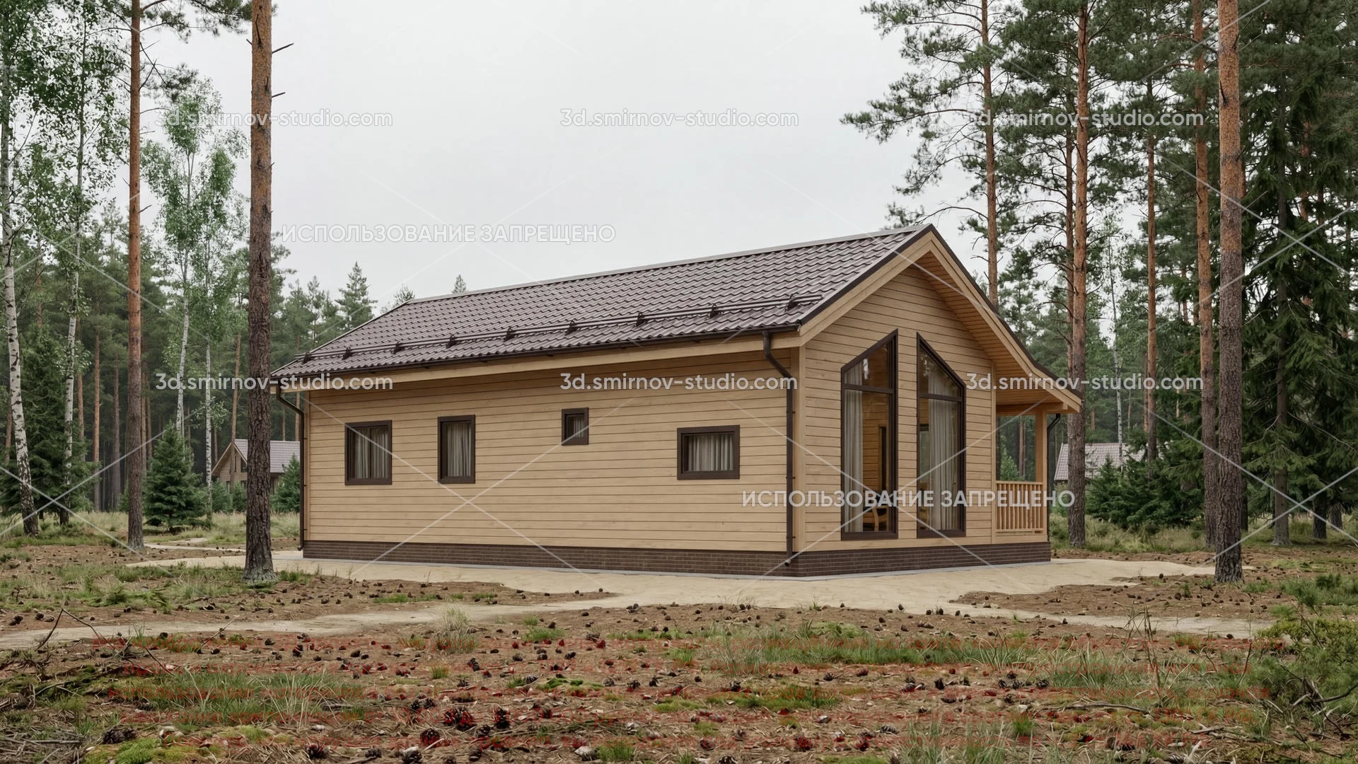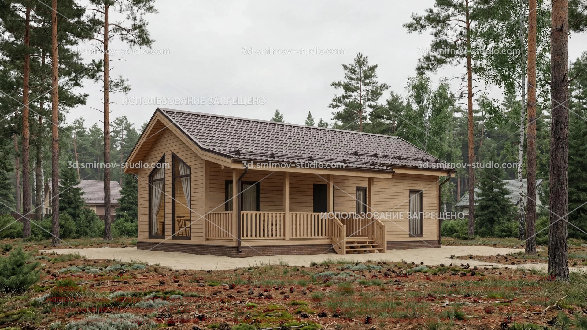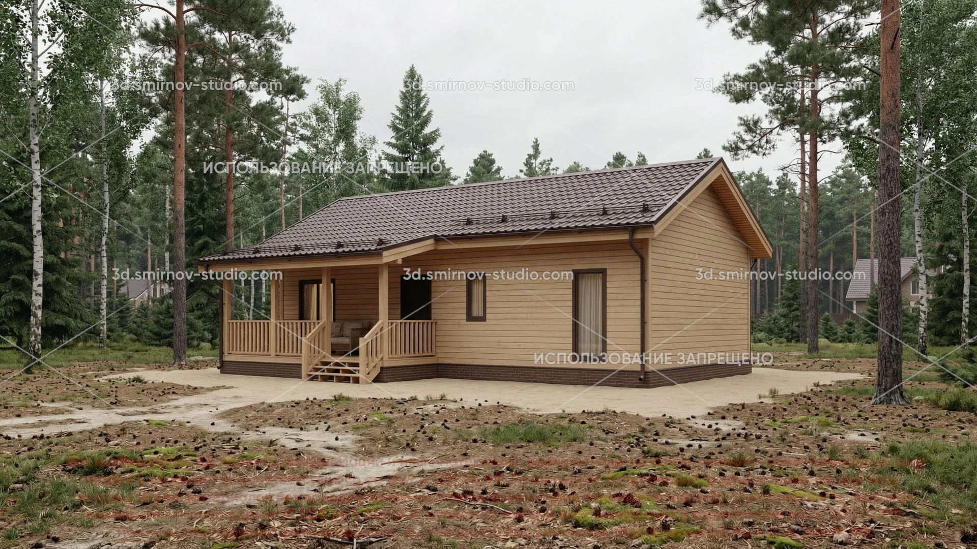 3Д проект дома из бруса 12 на 6 метров, площадью 74,7 м², с прямой крышей, террасой, котельной и санузлом