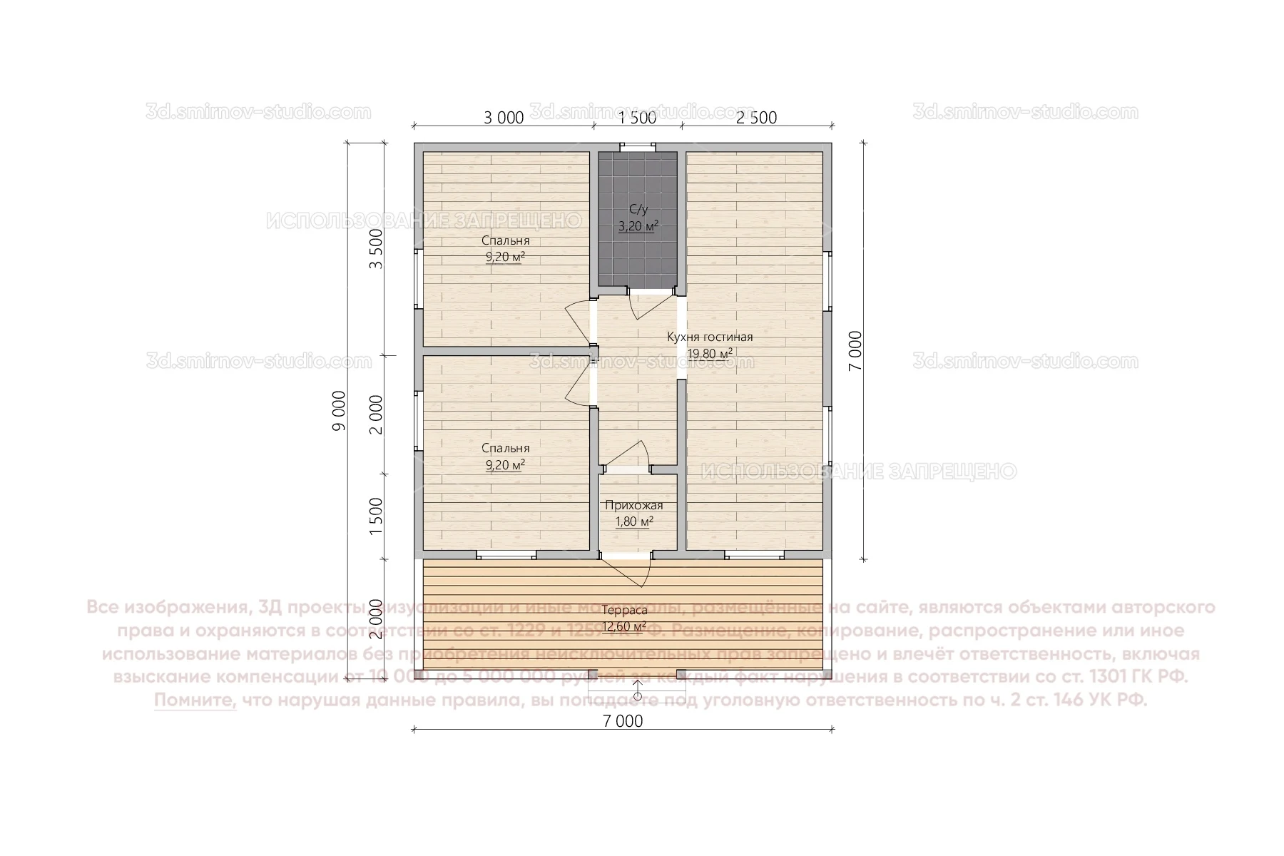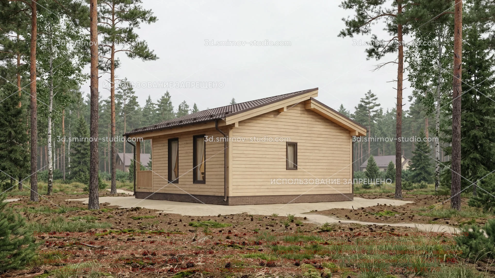 3Д проект дома из бруса 7 на 9 метров, площадью 55,8 м², с разноуровневой крышей, террасой и санузлом
