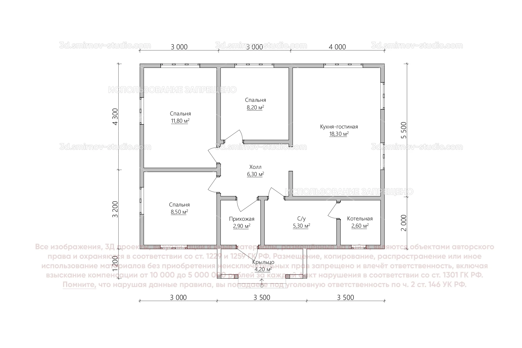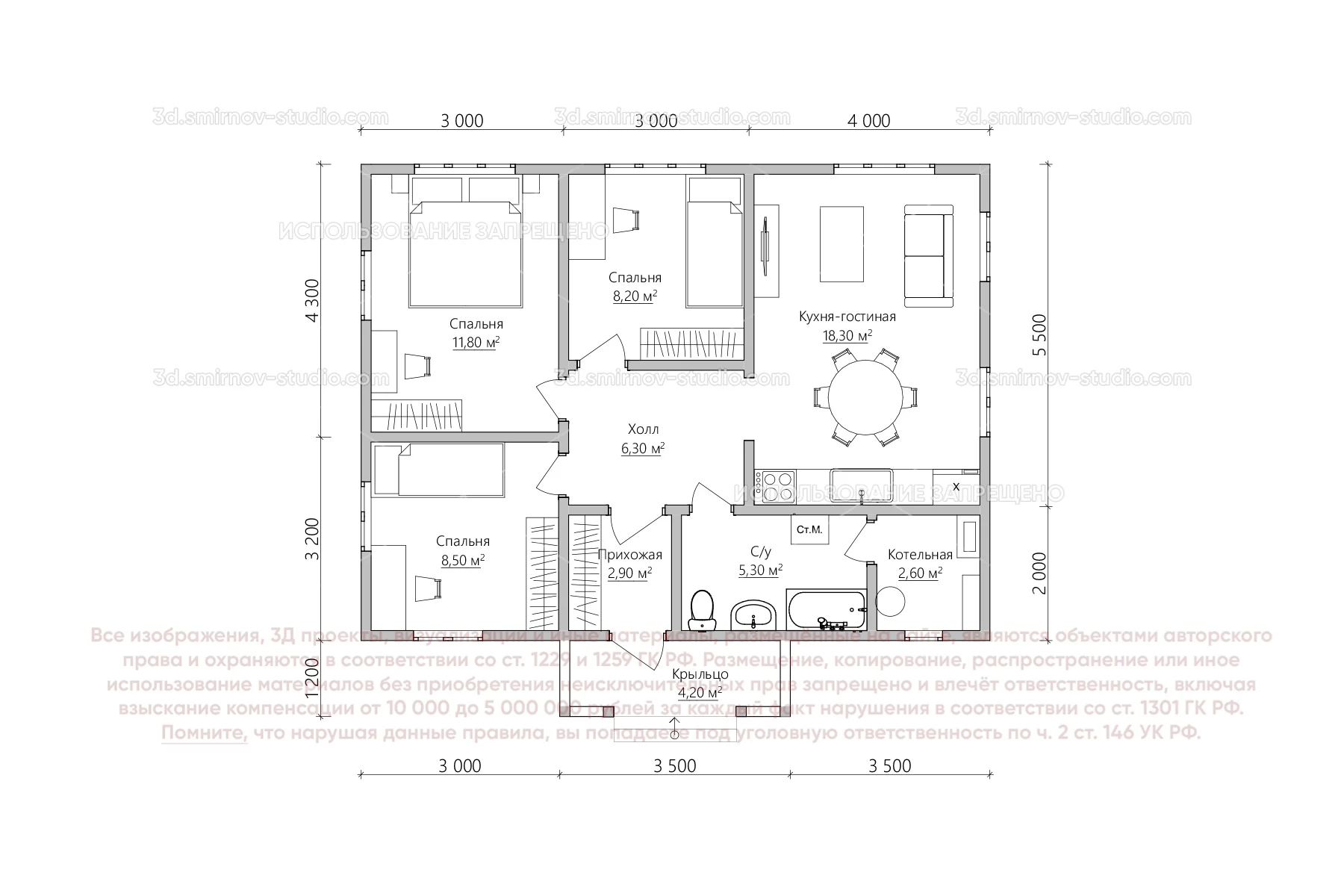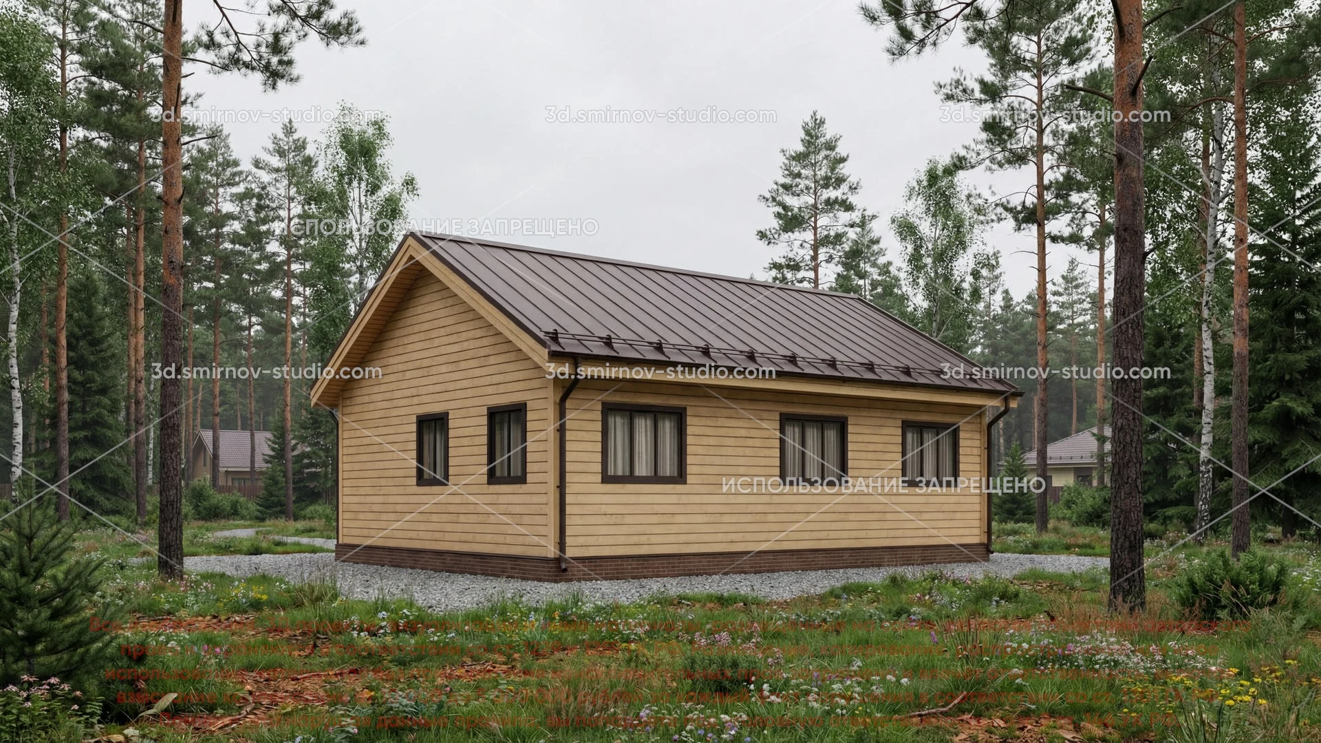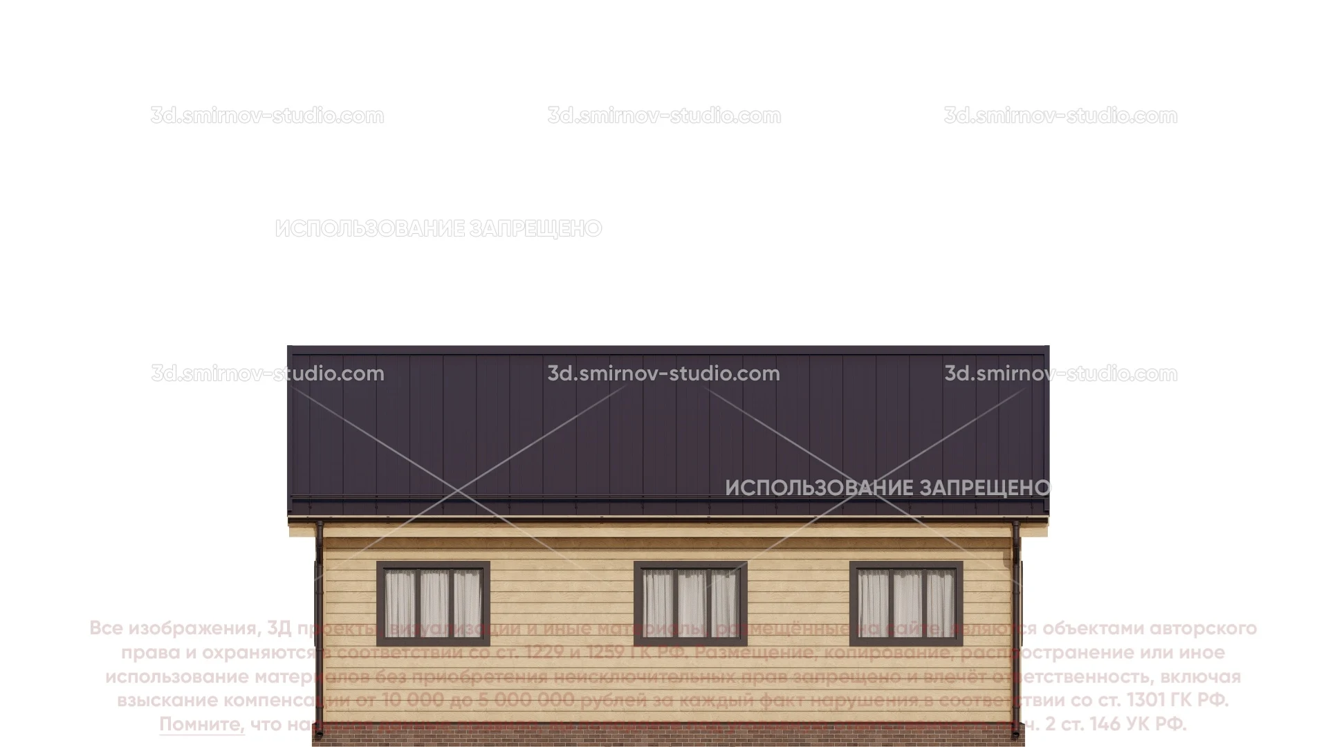 3Д проект дома из бруса 10 на 7.5 метров, площадью 68.1 м², с прямой крышей, крыльцом, котельной и санузлом