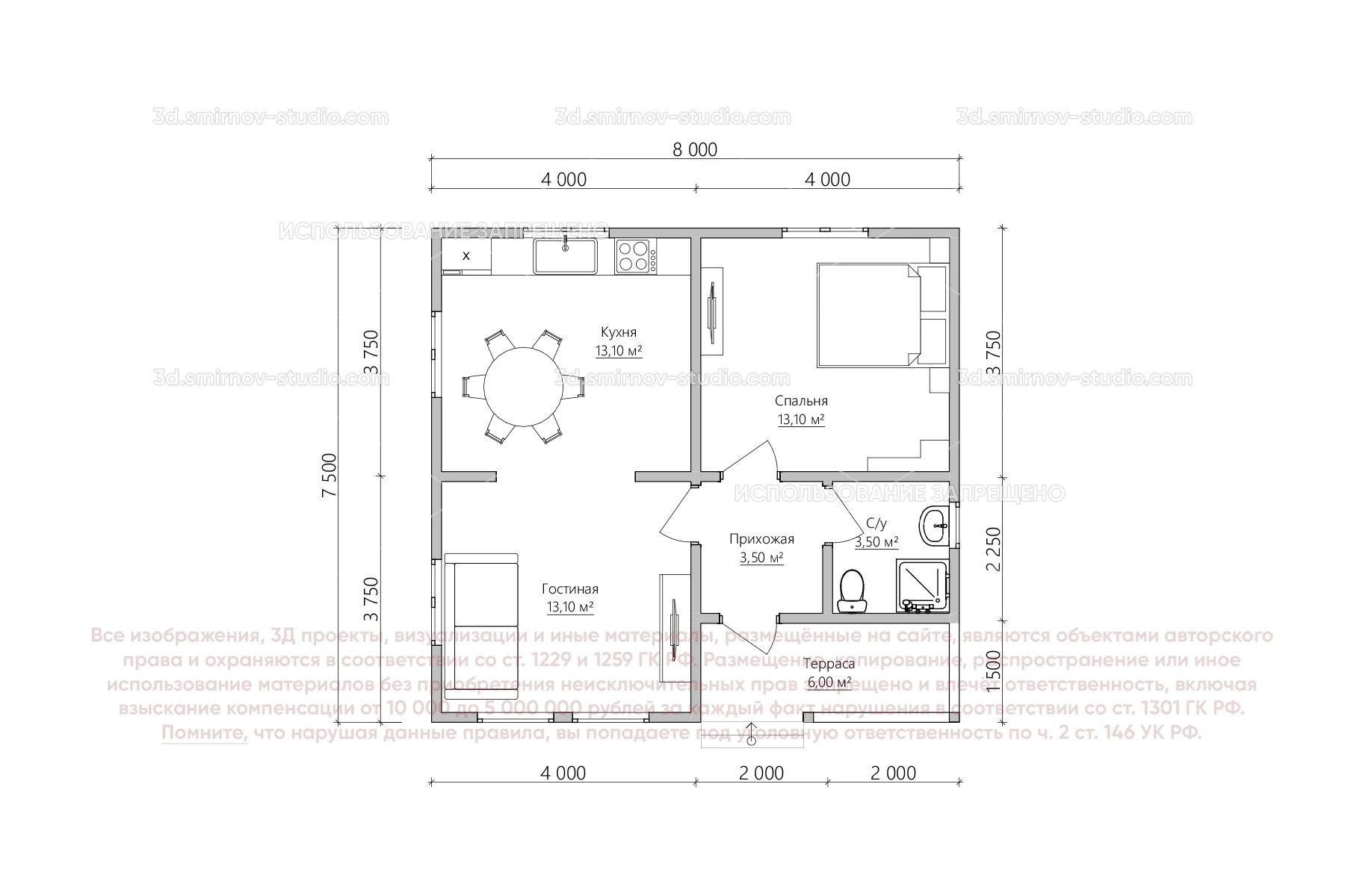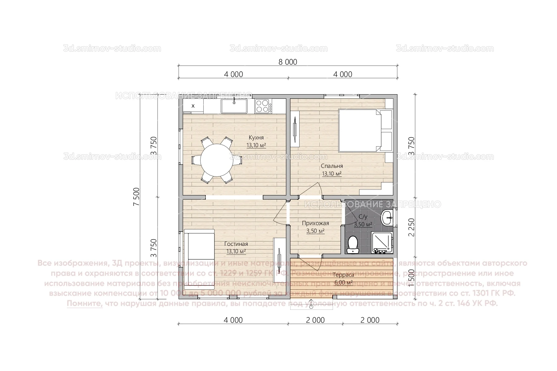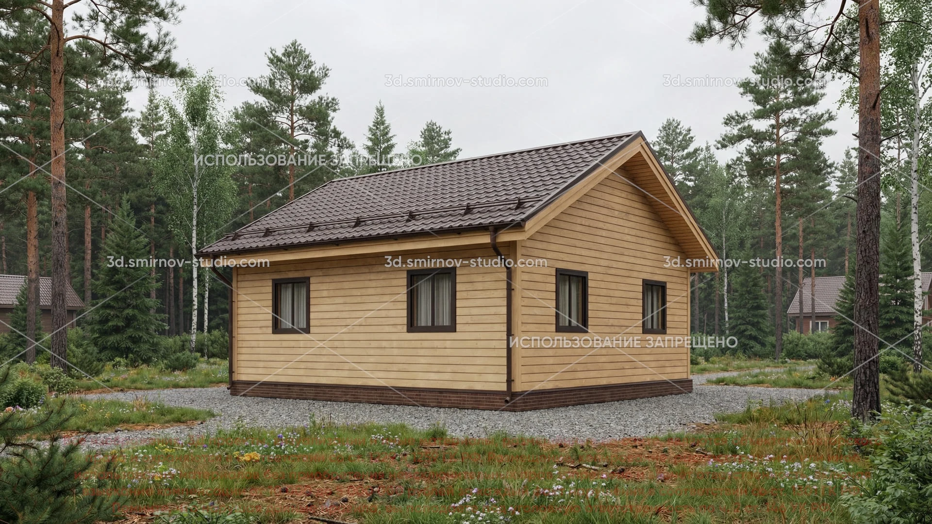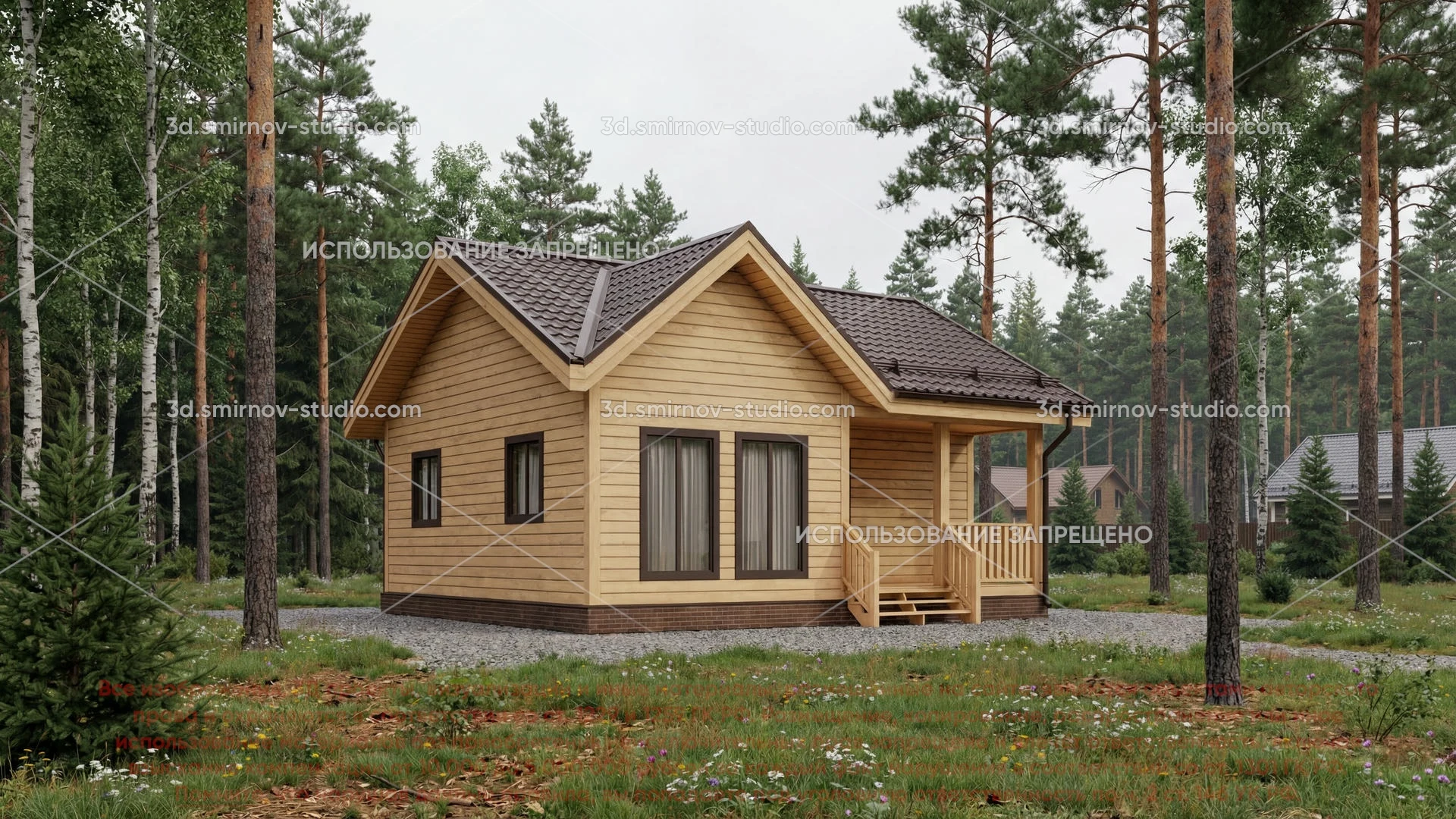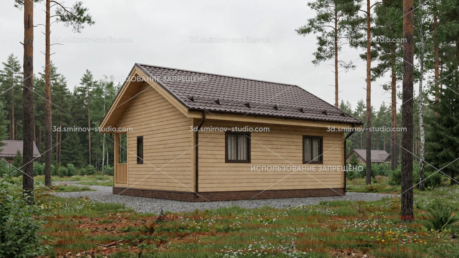 3Д проект дома из бруса 8 на 7.5 метров, площадью 52,3 м², с прямой крышей, террасой и санузлом