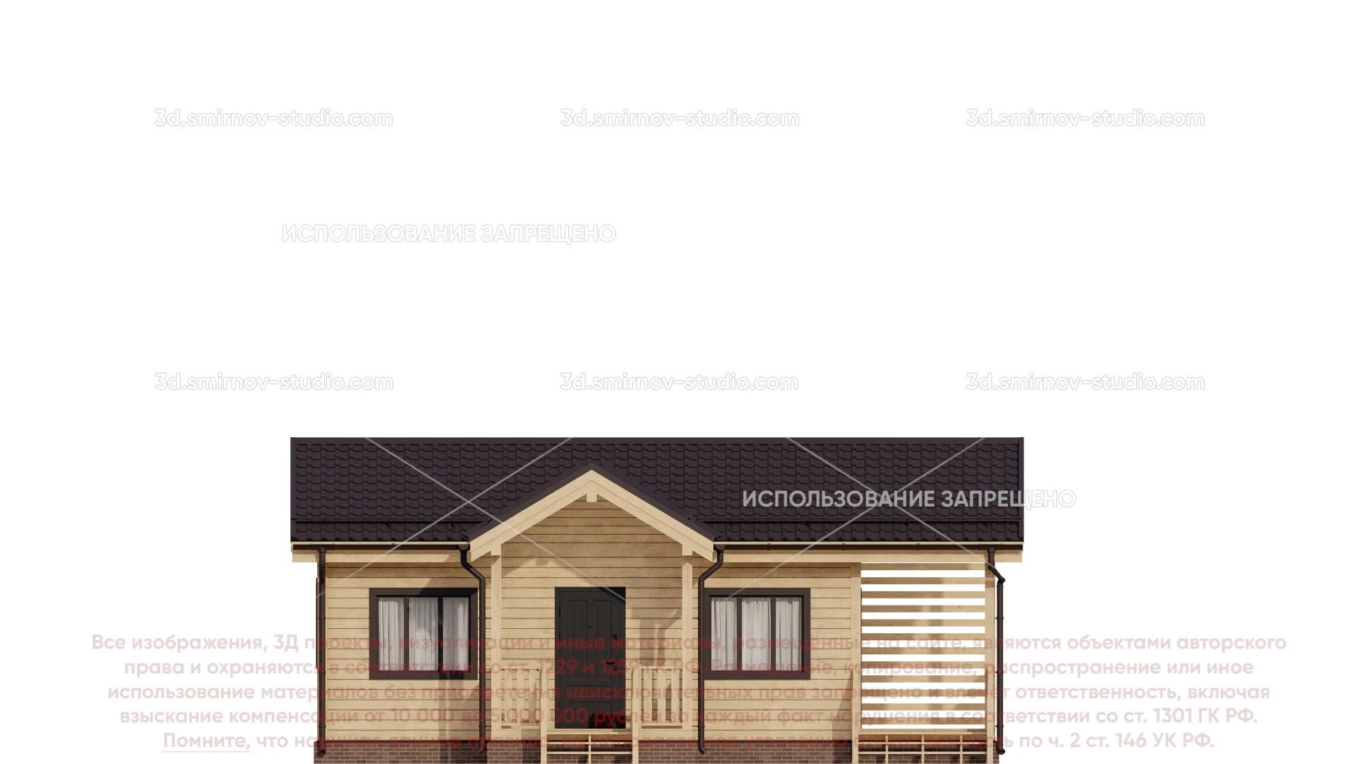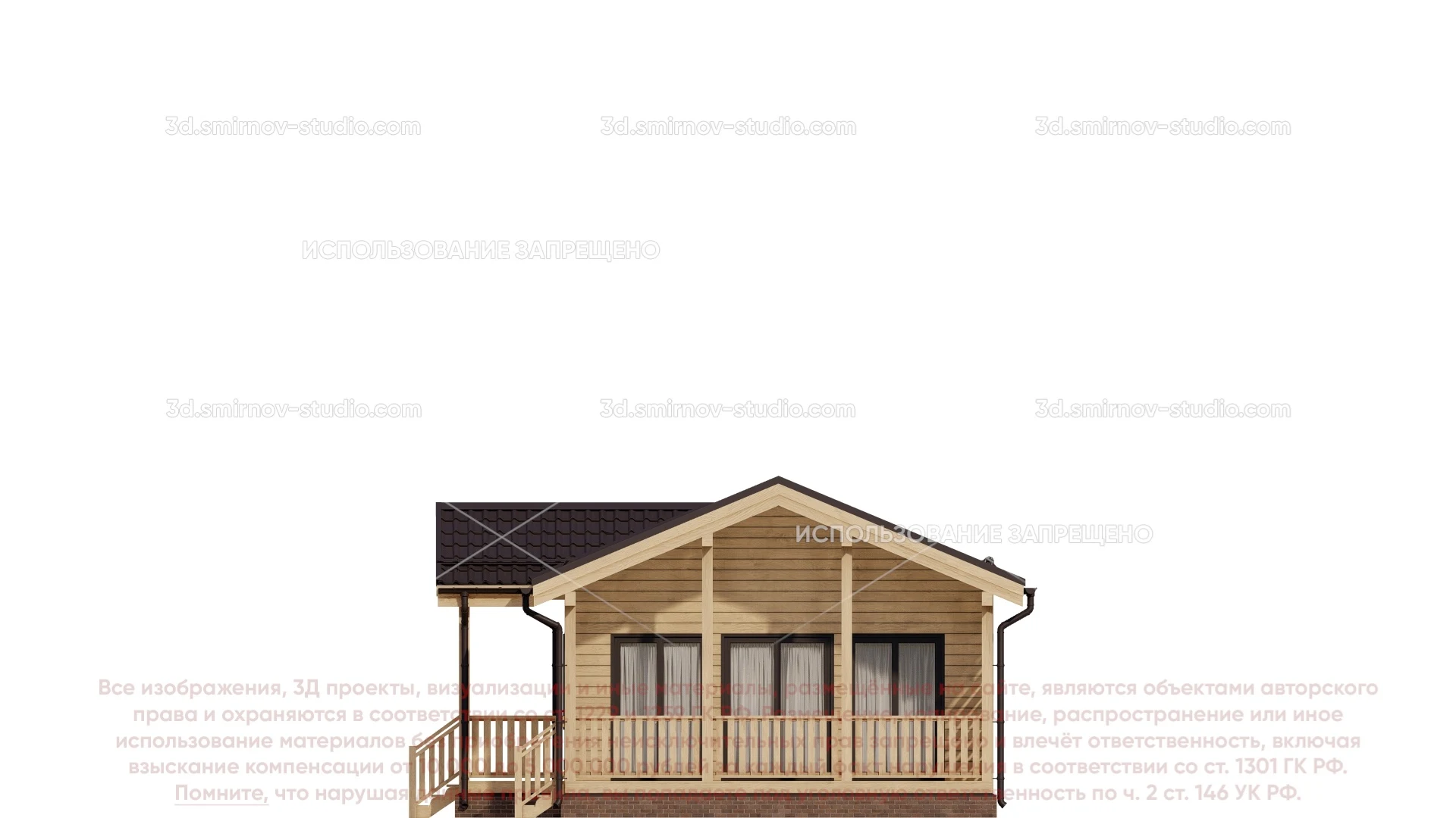 3Д проект дома из бруса 10 на 6метров, площадью 58,5 м², с прямой крышей, террасой и санузлом