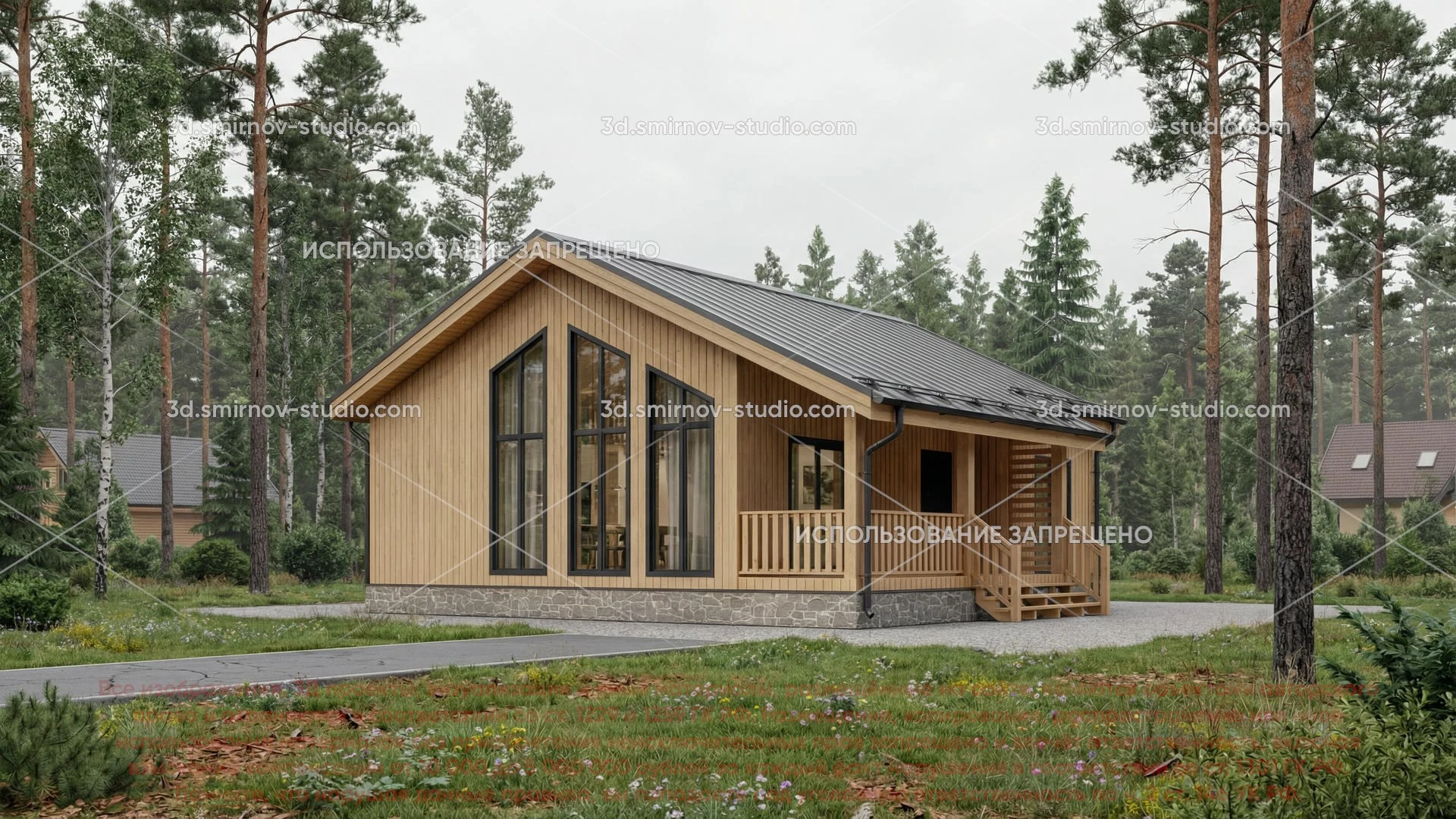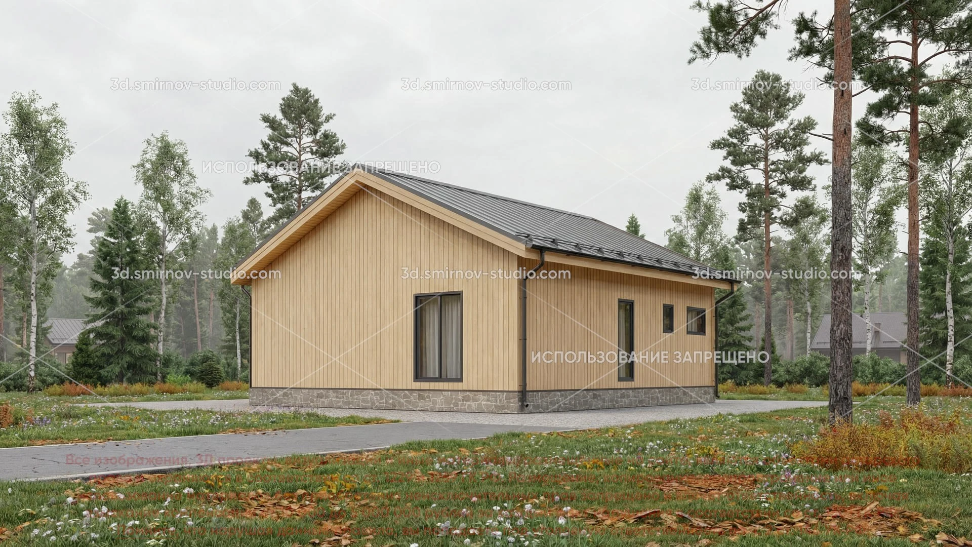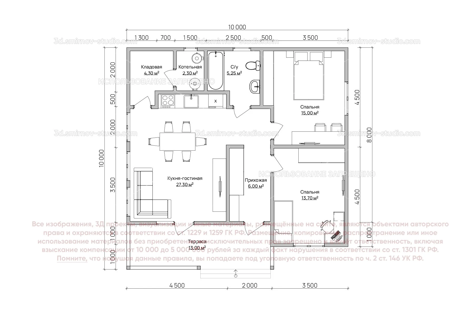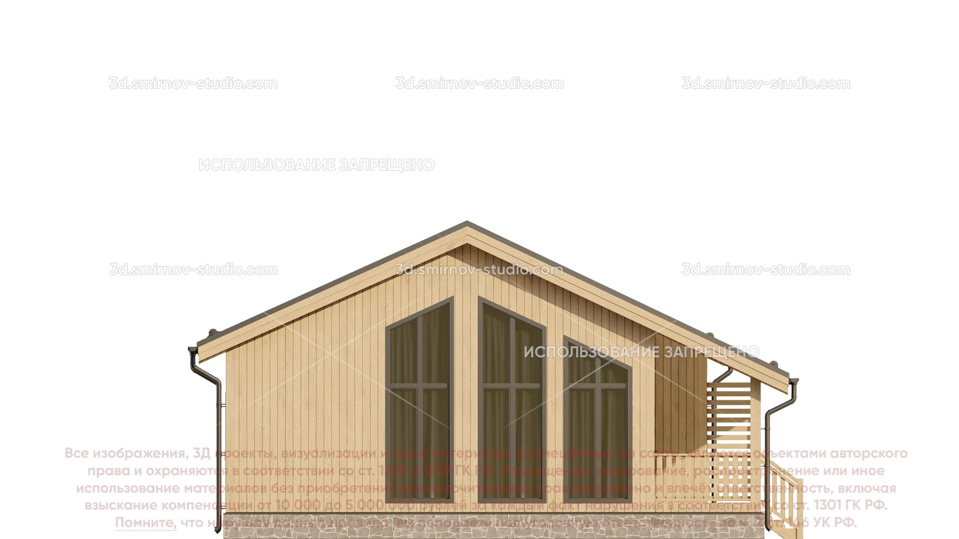 3Д проект каркасного дома 10 на 10 метров, площадью 86,85 м², с прямой крышей, террасой, котельной и санузлом