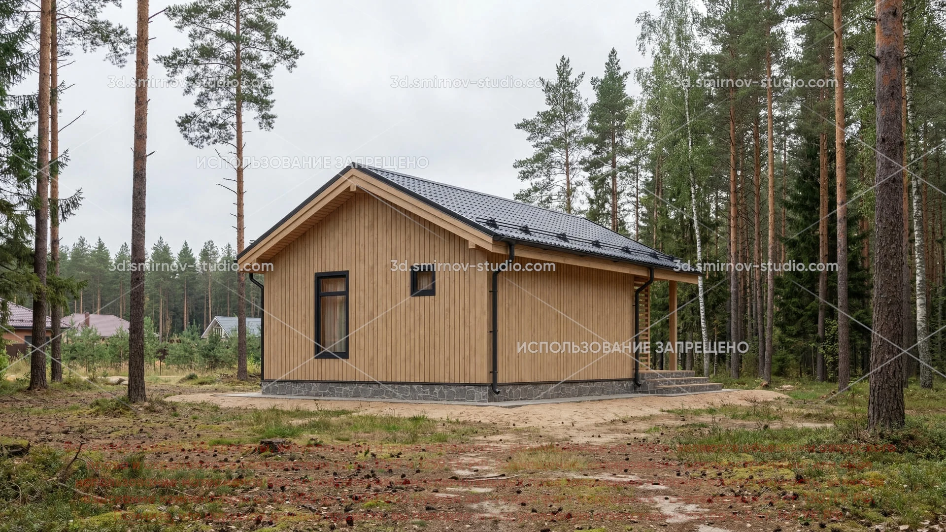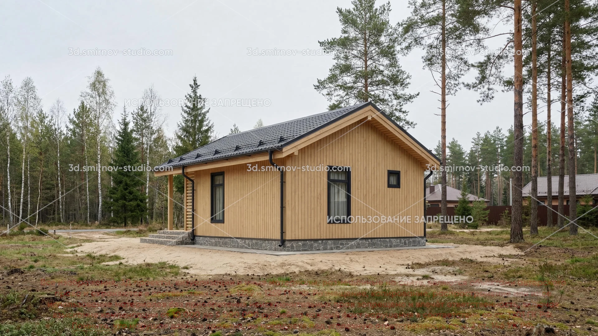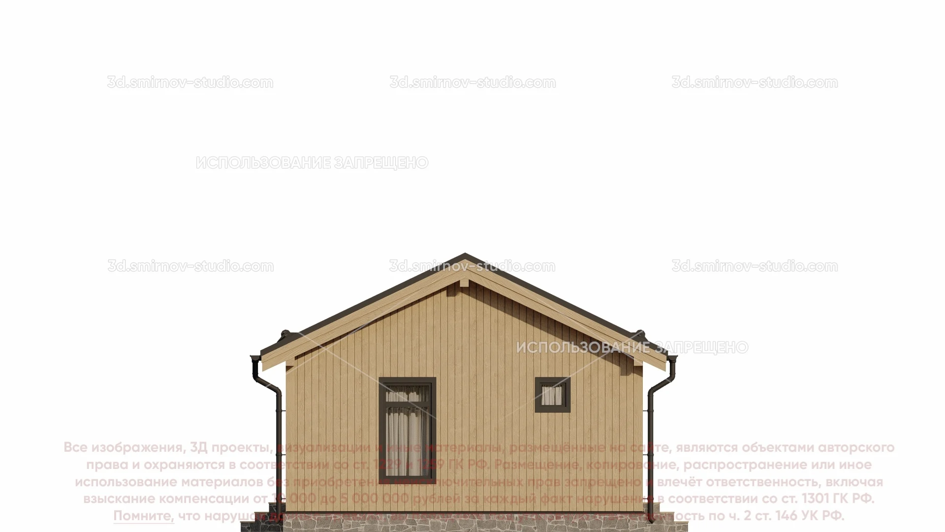 3Д проект каркасного дома 6,5 на 8 метров, площадью 46,7 м², с прямой крышей, террасой и санузлом