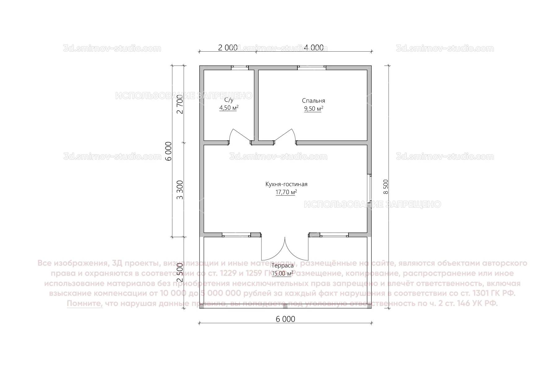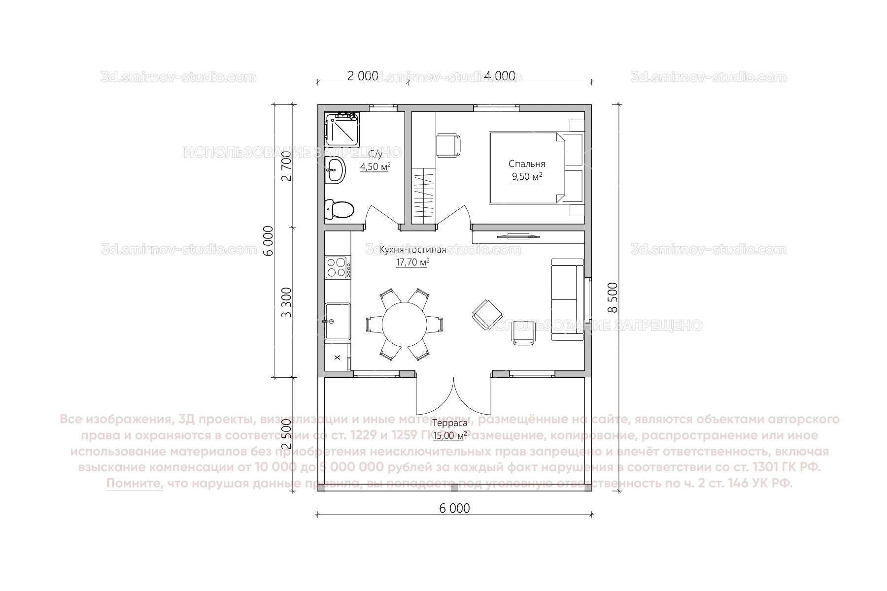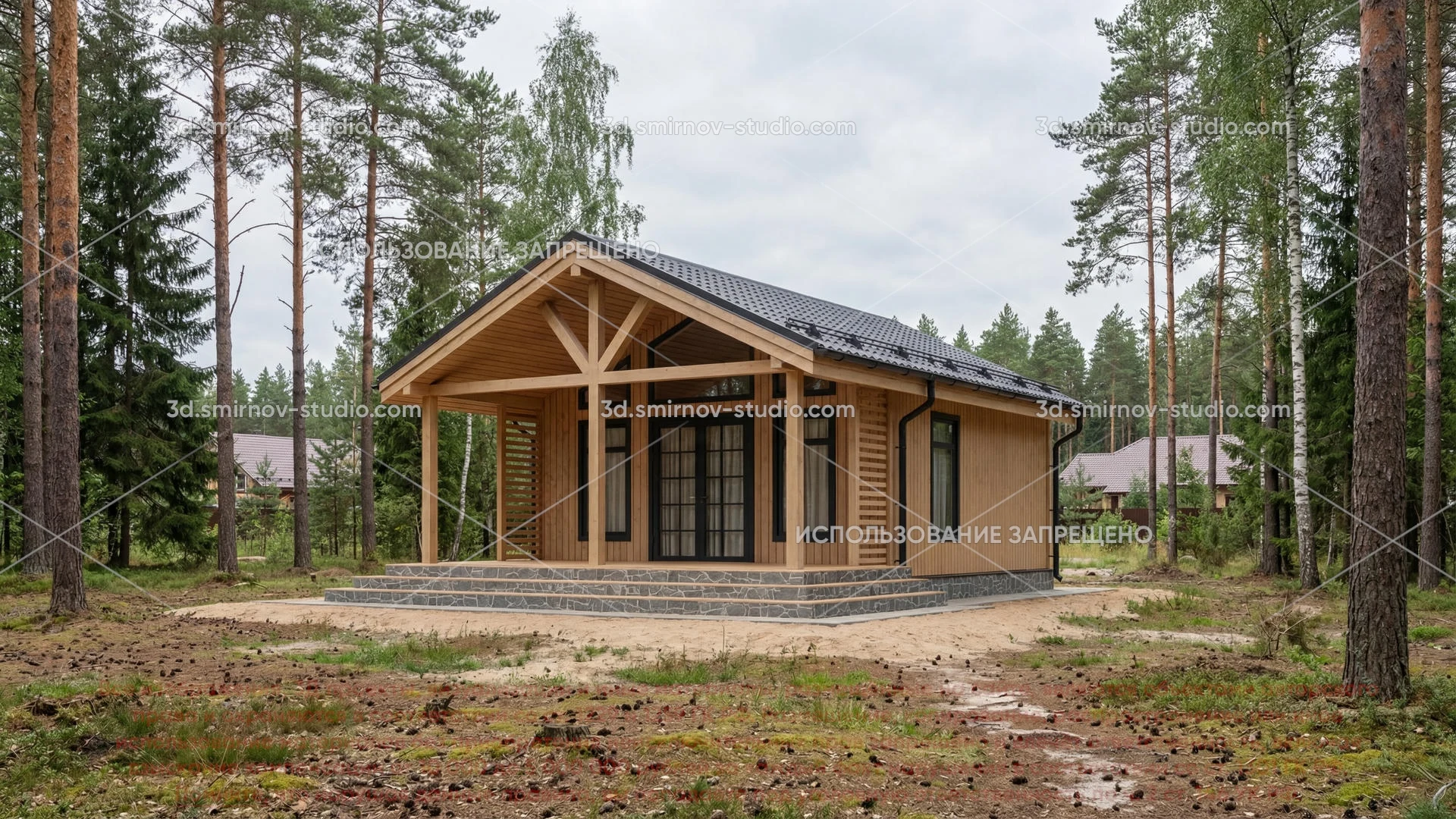 3Д проект каркасного дома 6,5 на 8 метров, площадью 46,7 м², с прямой крышей, террасой и санузлом