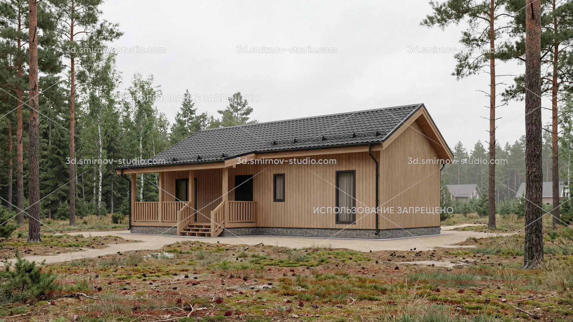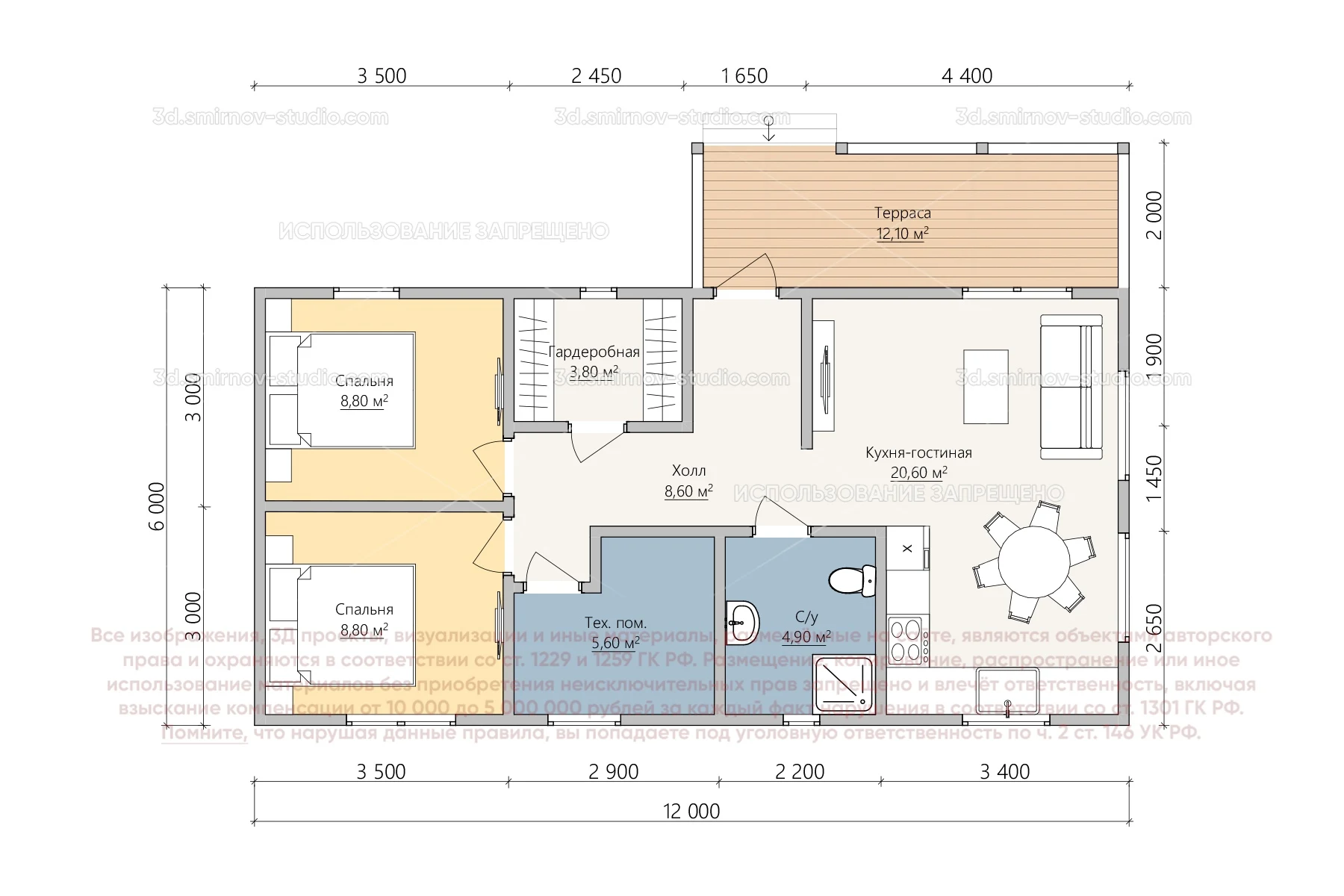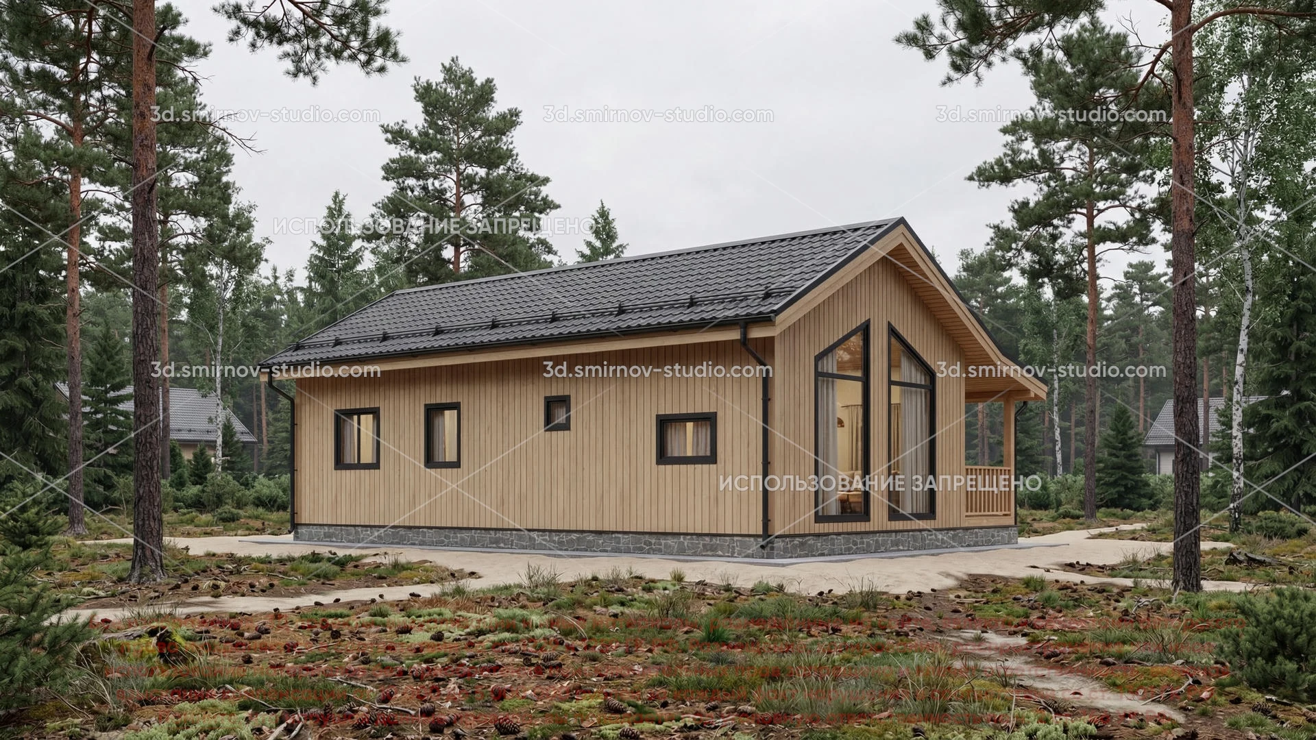 3Д проект каркасного дома 12 на 6 метров, площадью 74,7 м², с прямой крышей, террасой, котельной и санузлом
