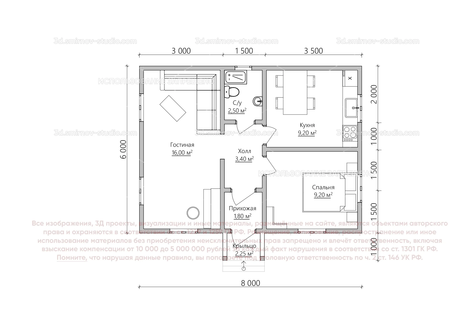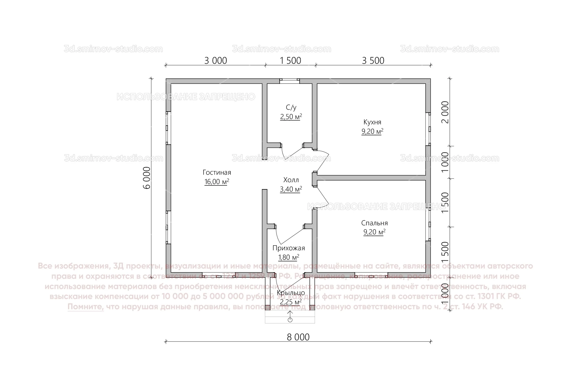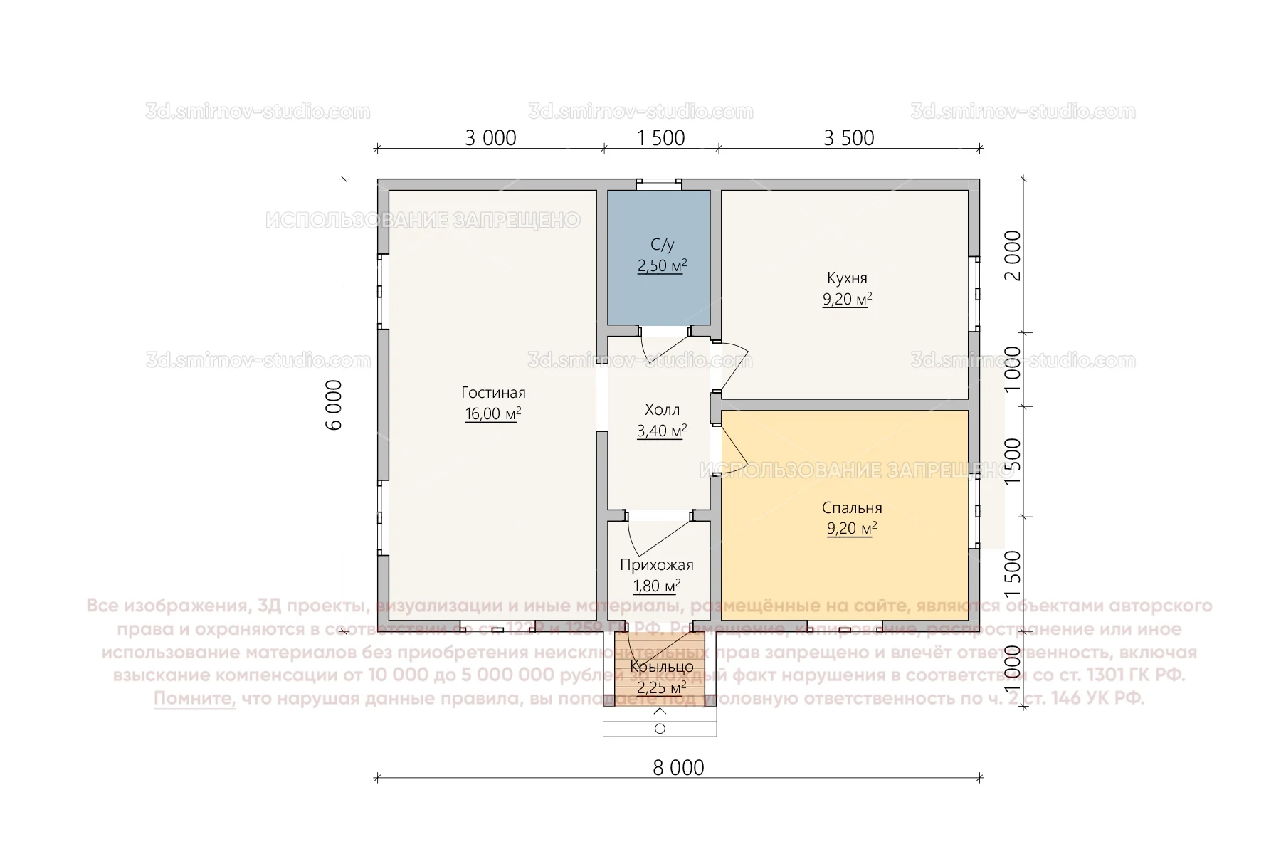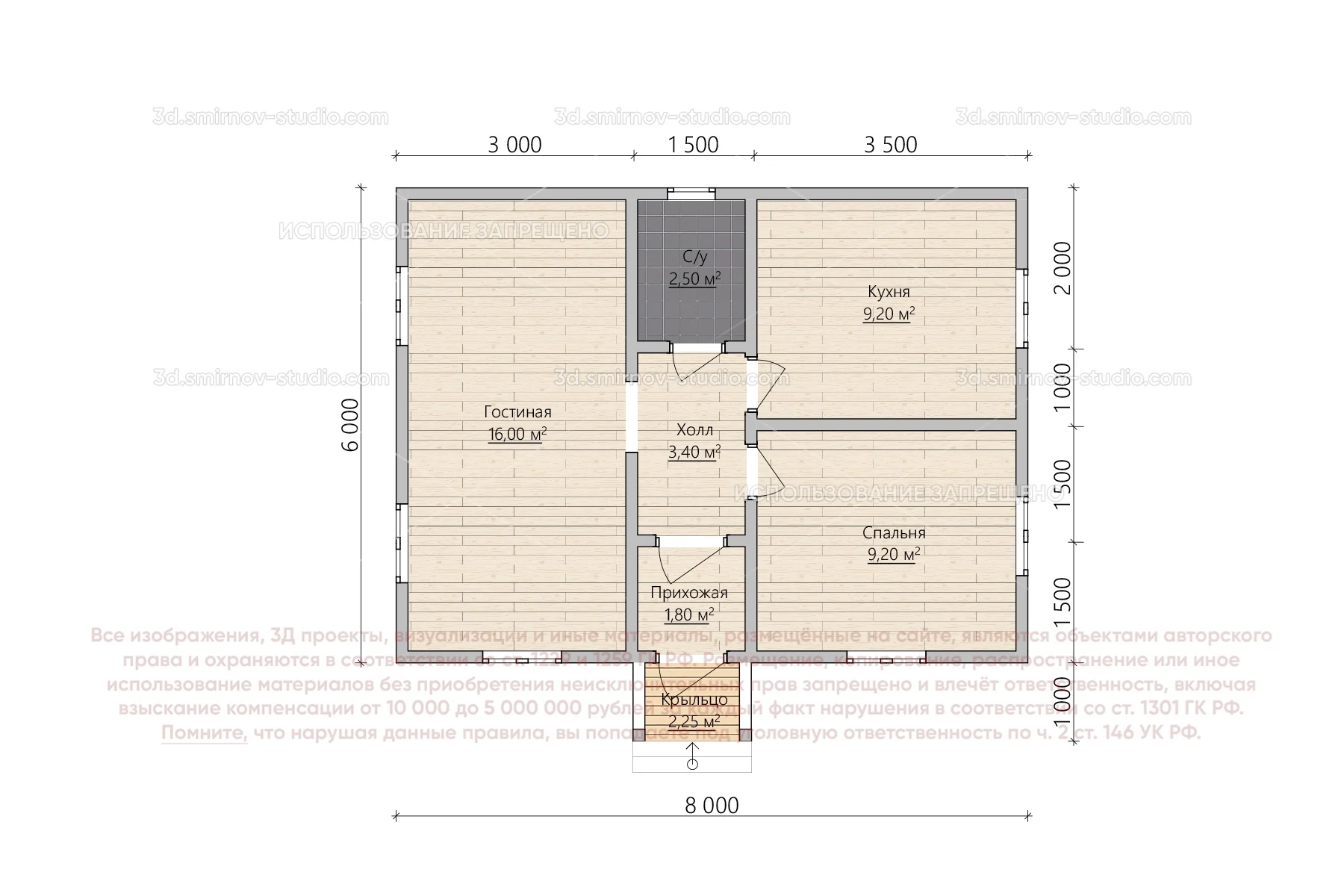 3Д проект каркасного дома 6 на 8 метров, площадью 44,35 м², с прямой крышей, крыльцом и санузлом