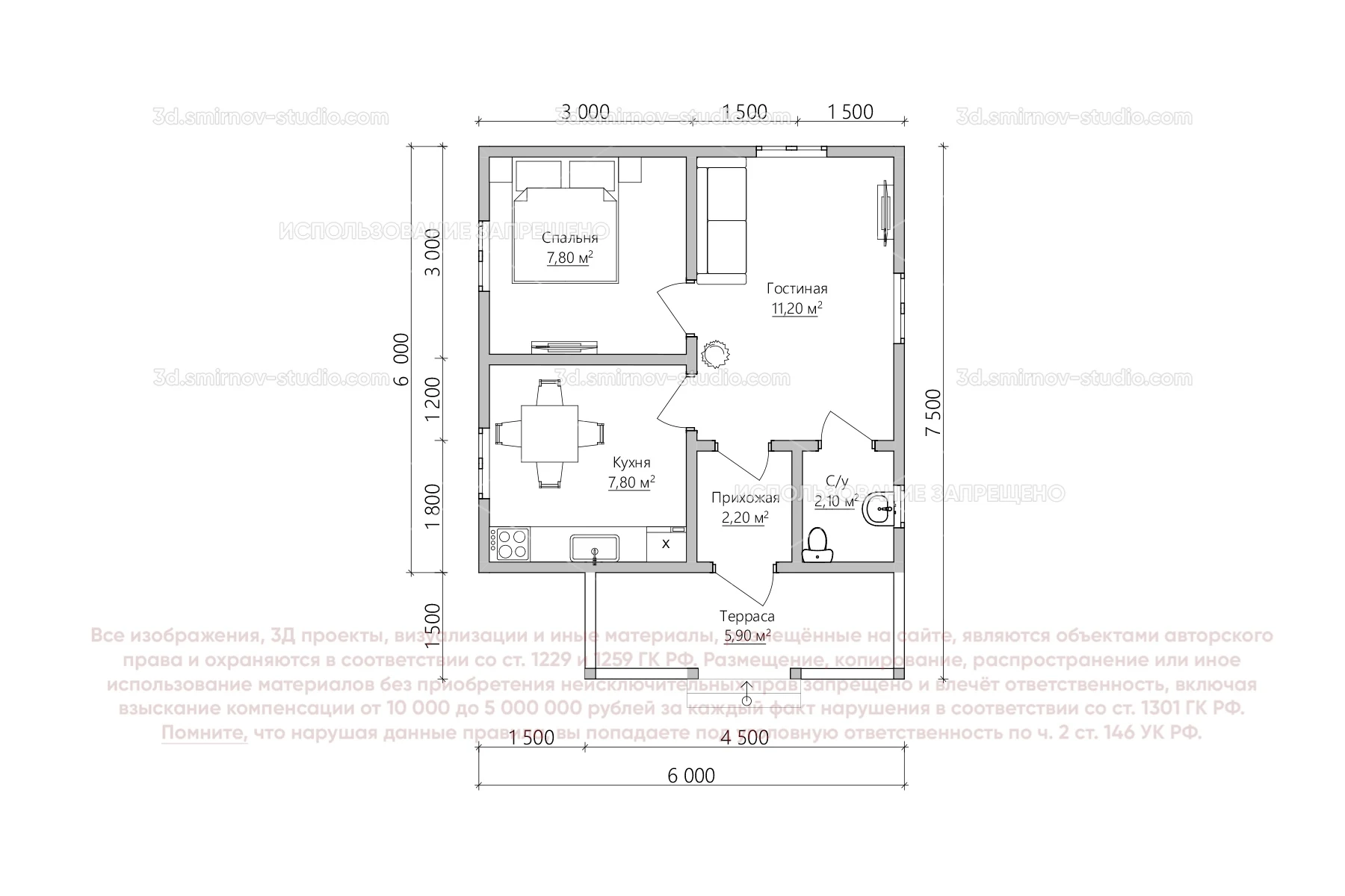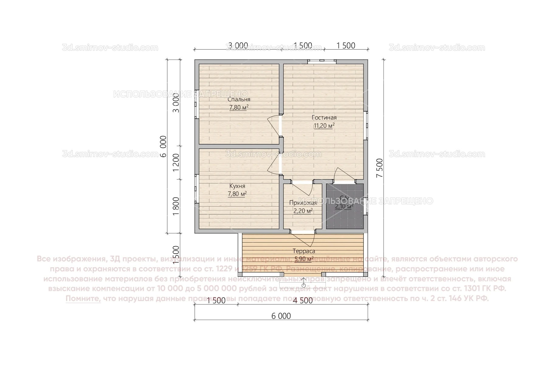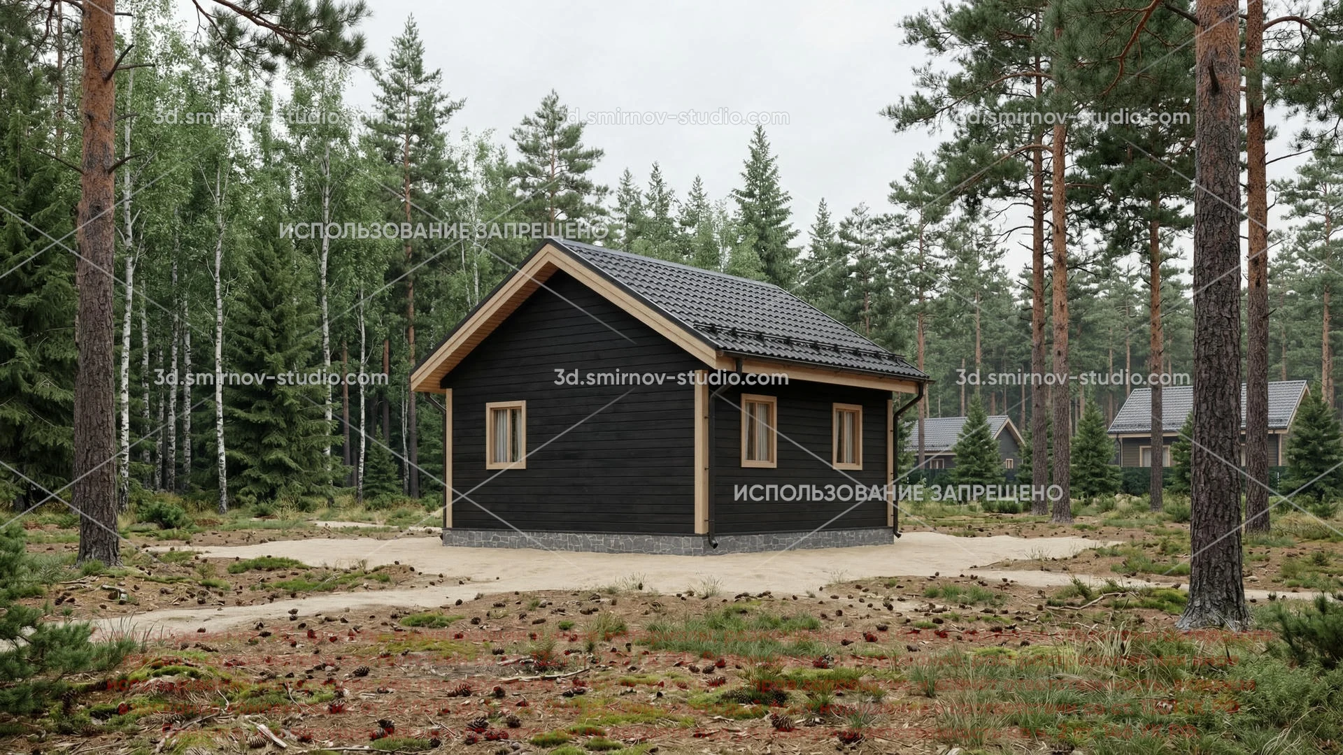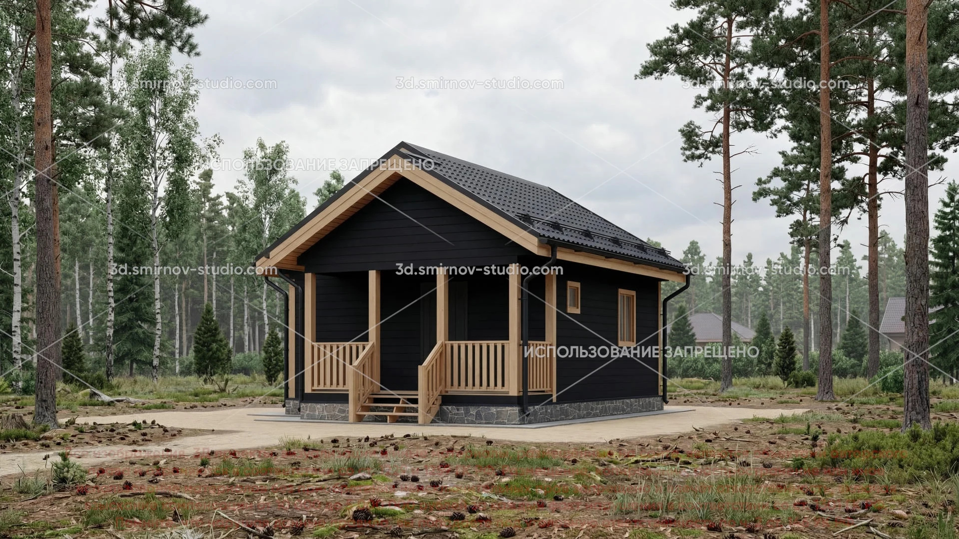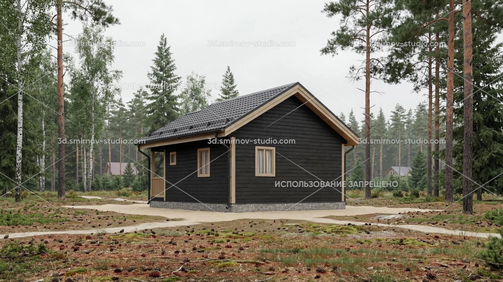 3Д проект каркасного дома 6 на 6 метров, площадью 37 м², с прямой крышей, террасой и санузлом