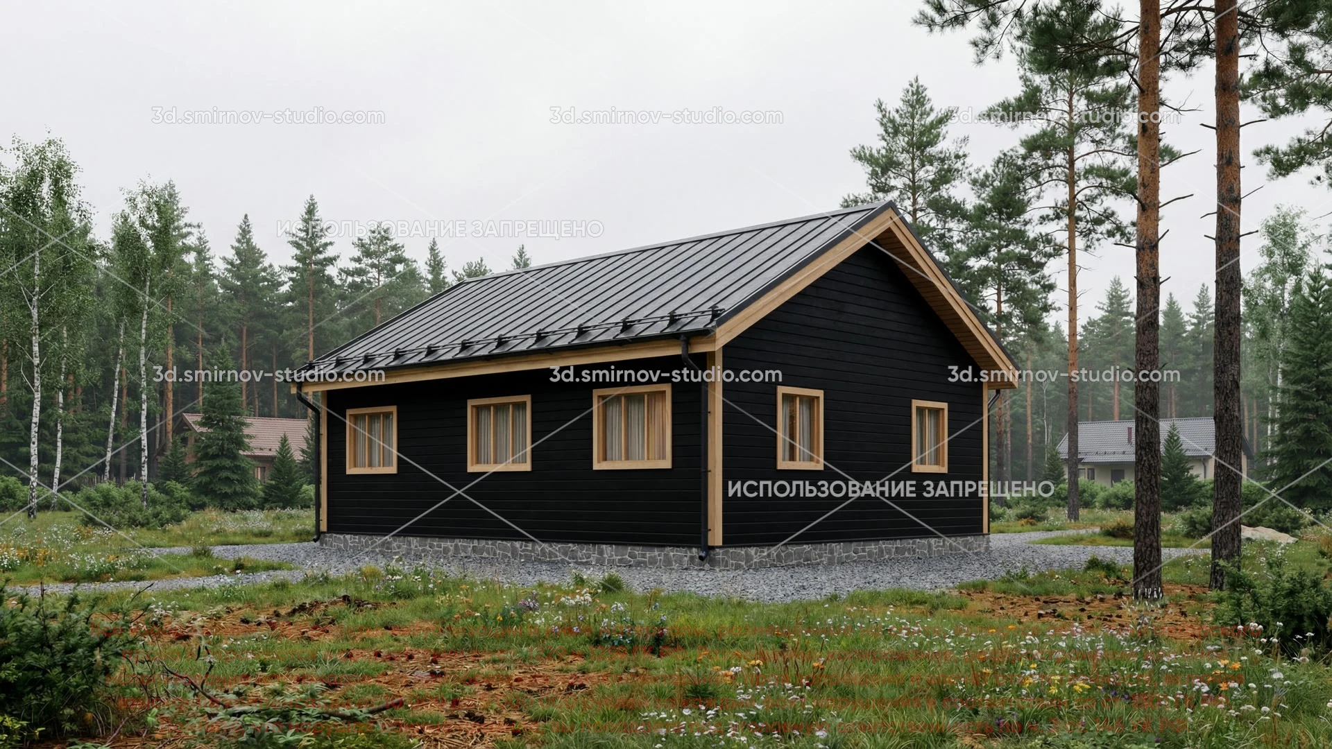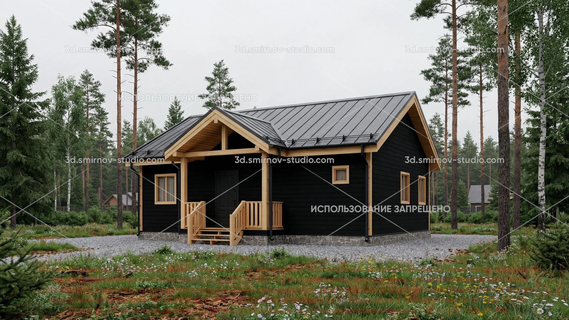 3Д проект каркасного дома 10 на 7.5 метров, площадью 68.1 м², с прямой крышей, крыльцом, котельной и санузлом