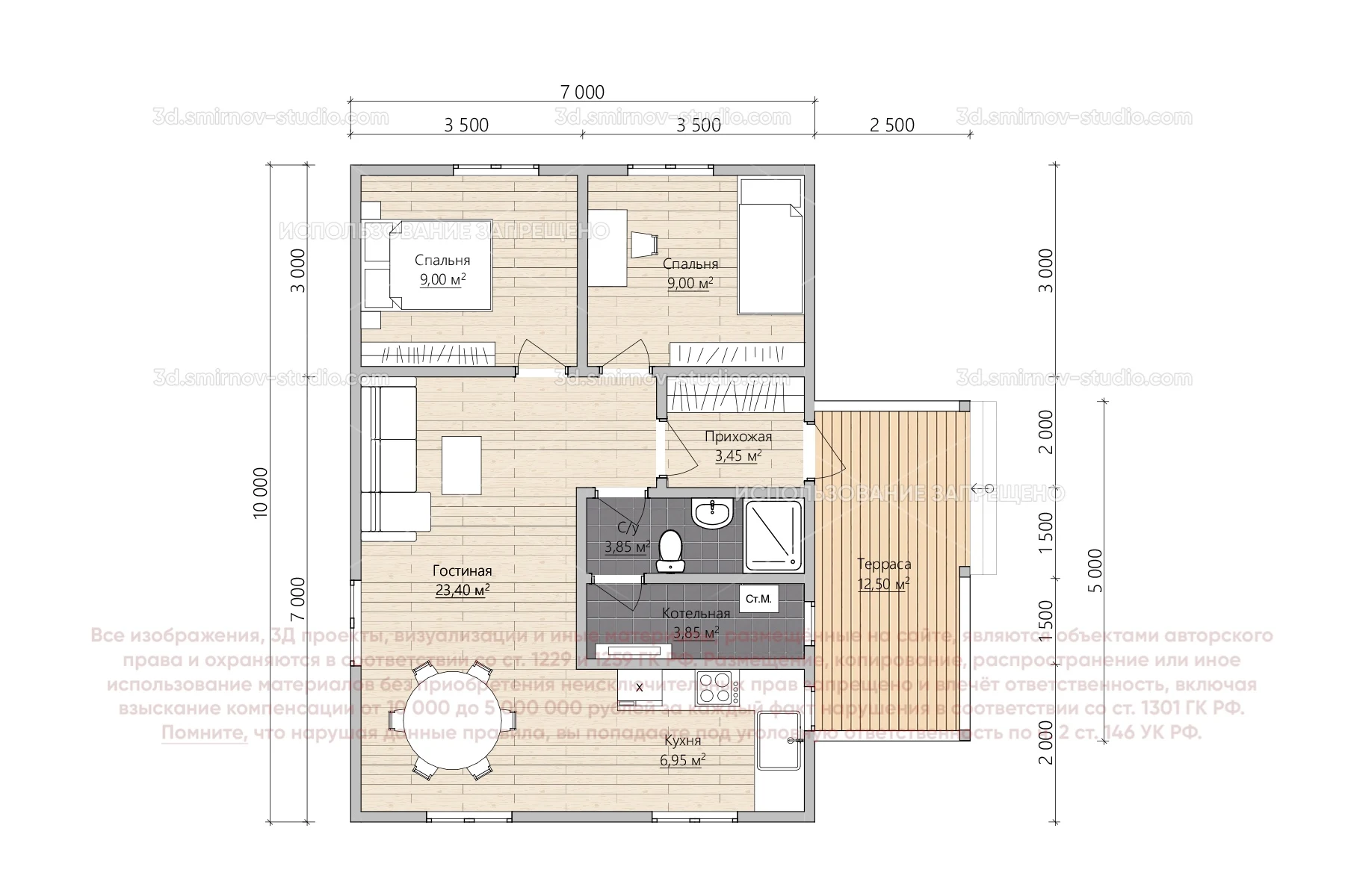 3Д проект каркасного дома 10 на 7 метров, площадью 72 м², с прямой крышей, крыльцом, котельной и санузлом