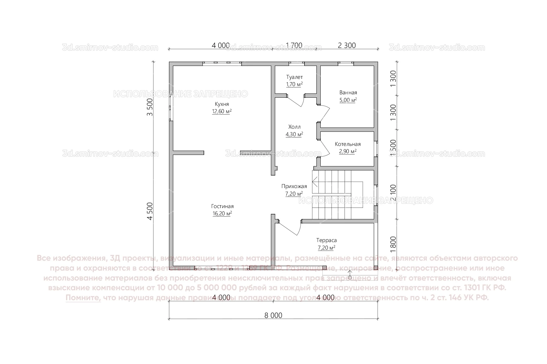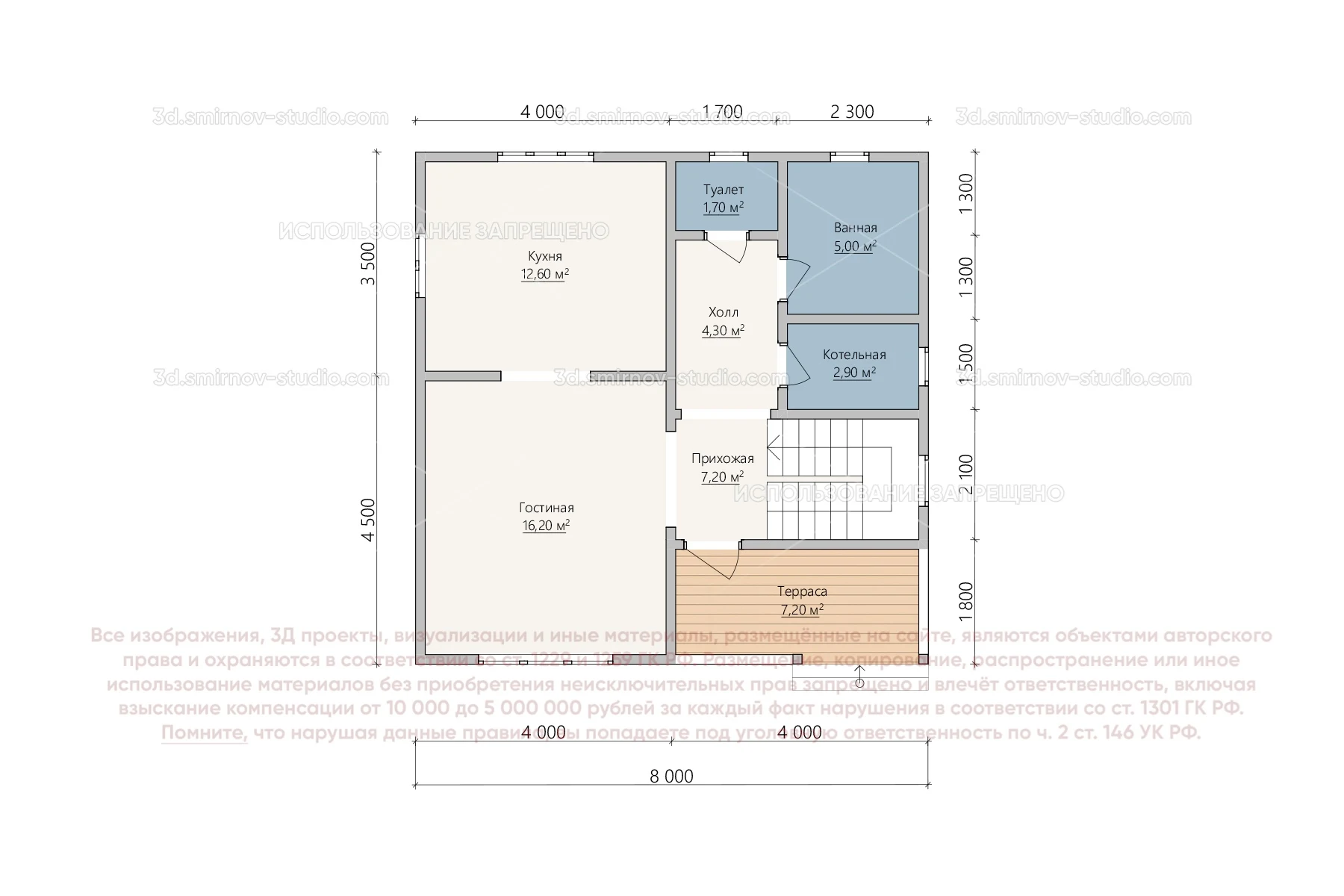 3Д проект каркасного дома 8 на 8 метров, площадью 109,9 м², с прямой крышей, террасой, котельной и 2 санузлами