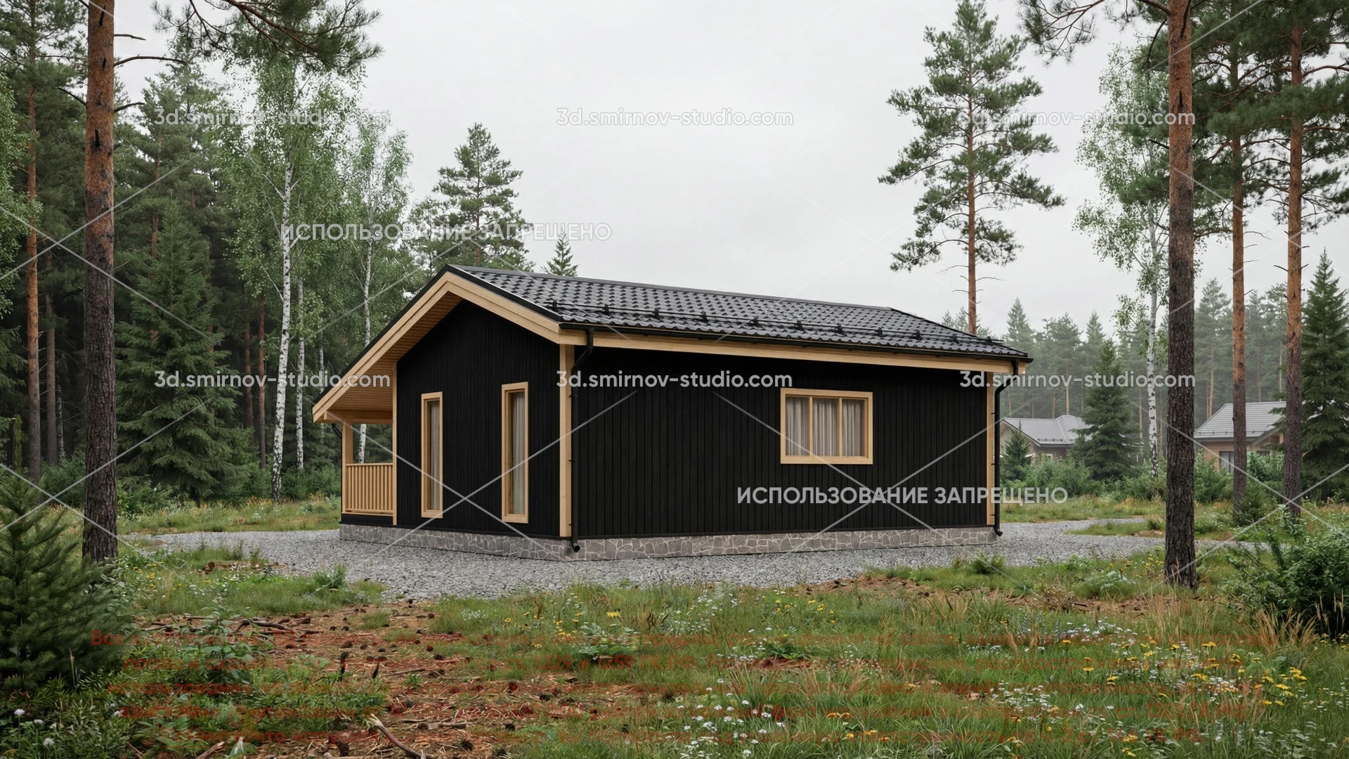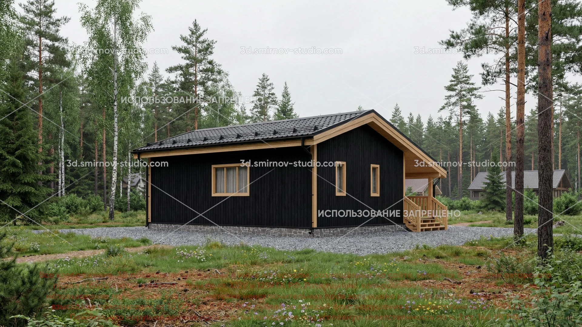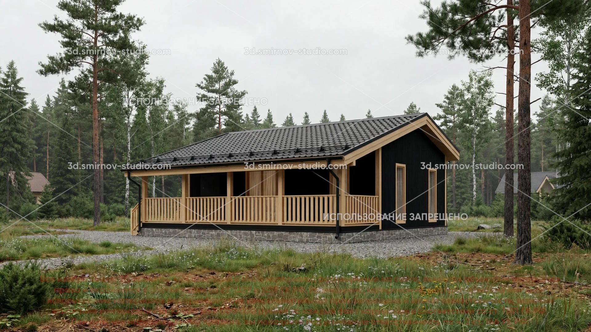 3Д проект каркасного дома 8.5 на 9 метров, площадью 69,9 м², с прямой крышей, террасой и санузлом