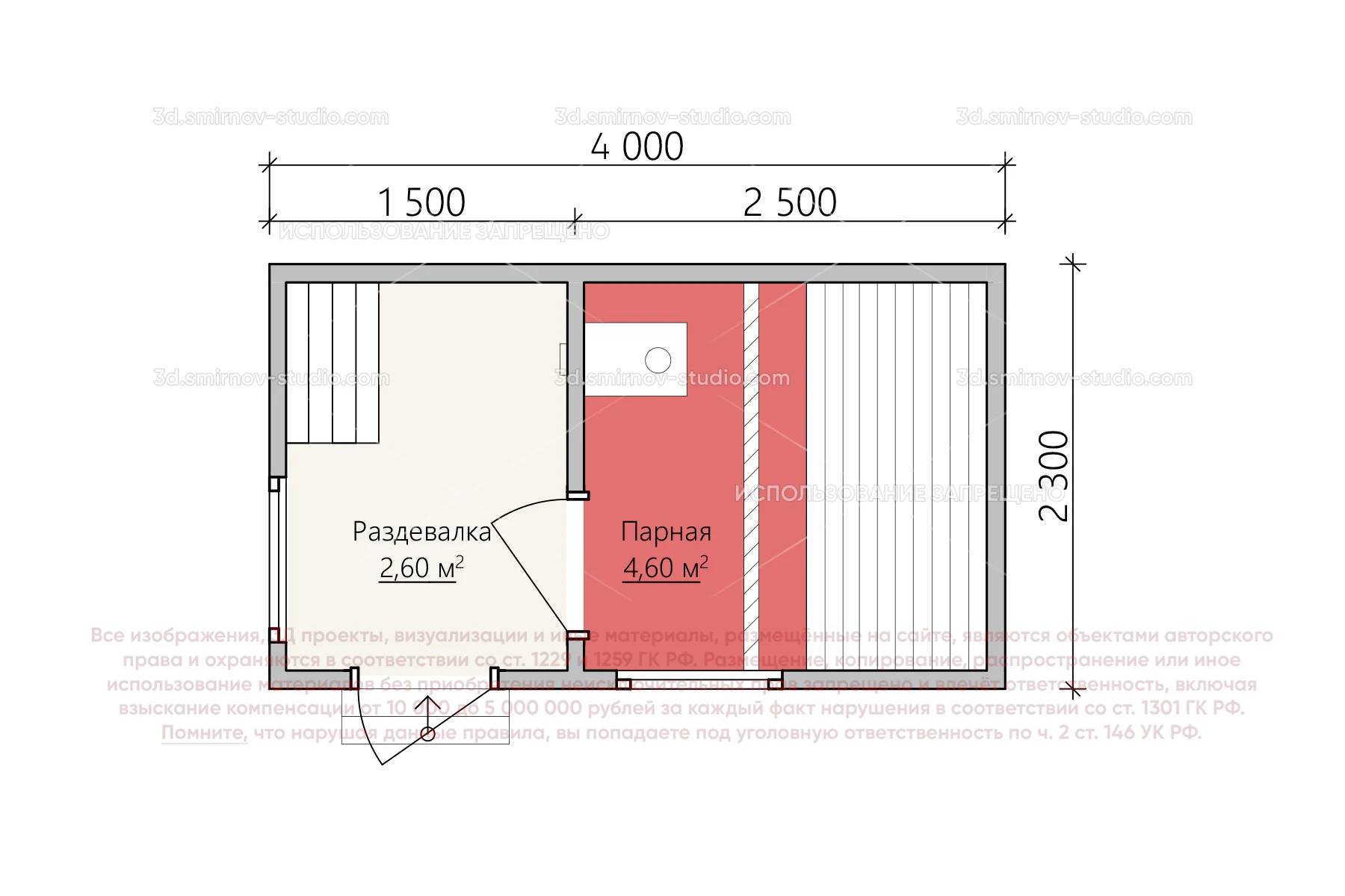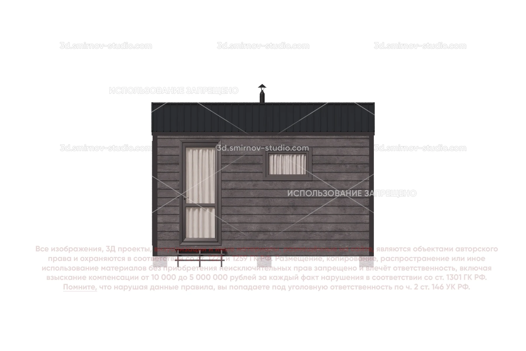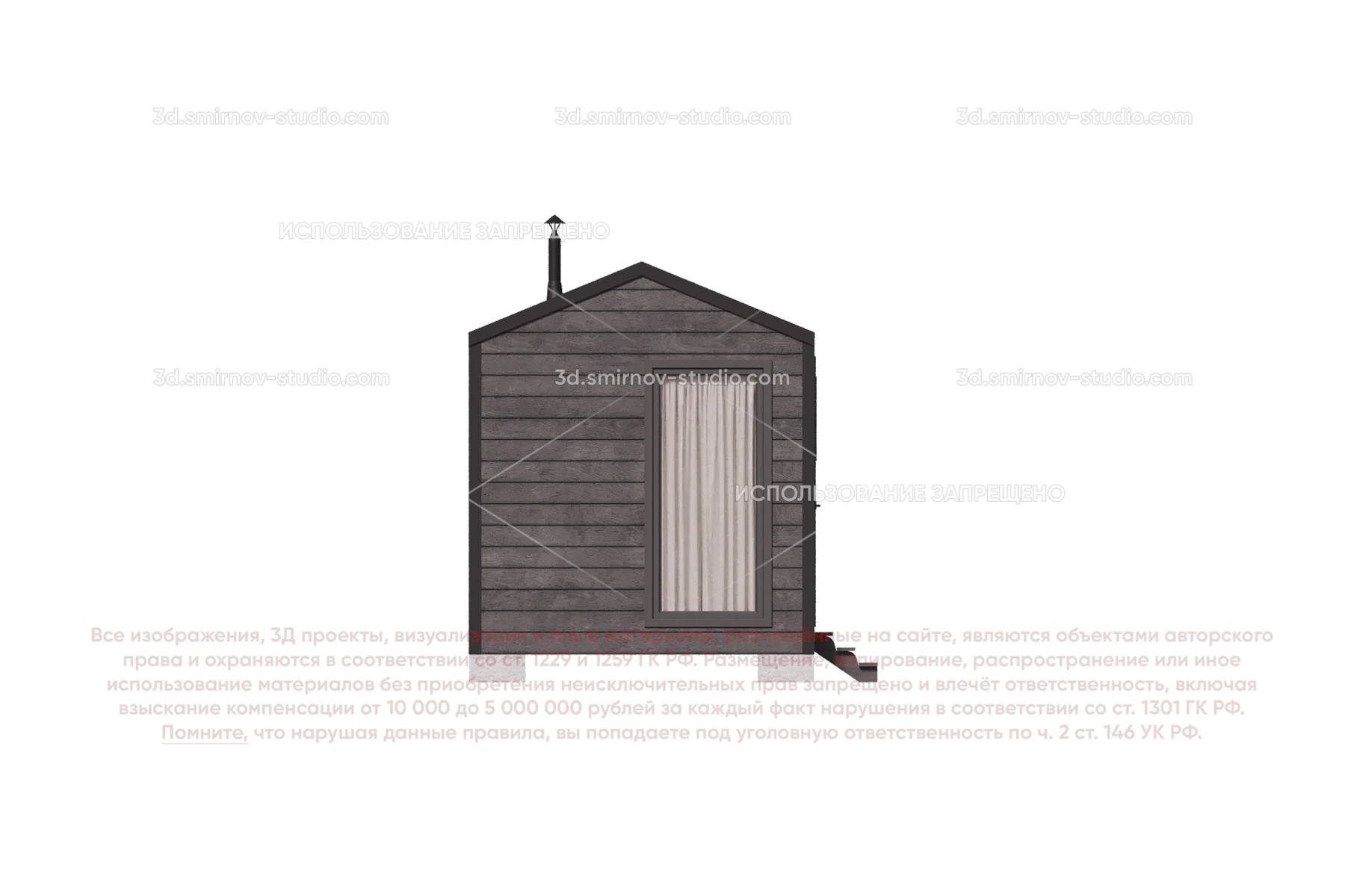 3Д проект мобильной бани в стиле барн 4 на 2.3 метра, площадью 7,20 м², с прямой крышей и раздевалкой