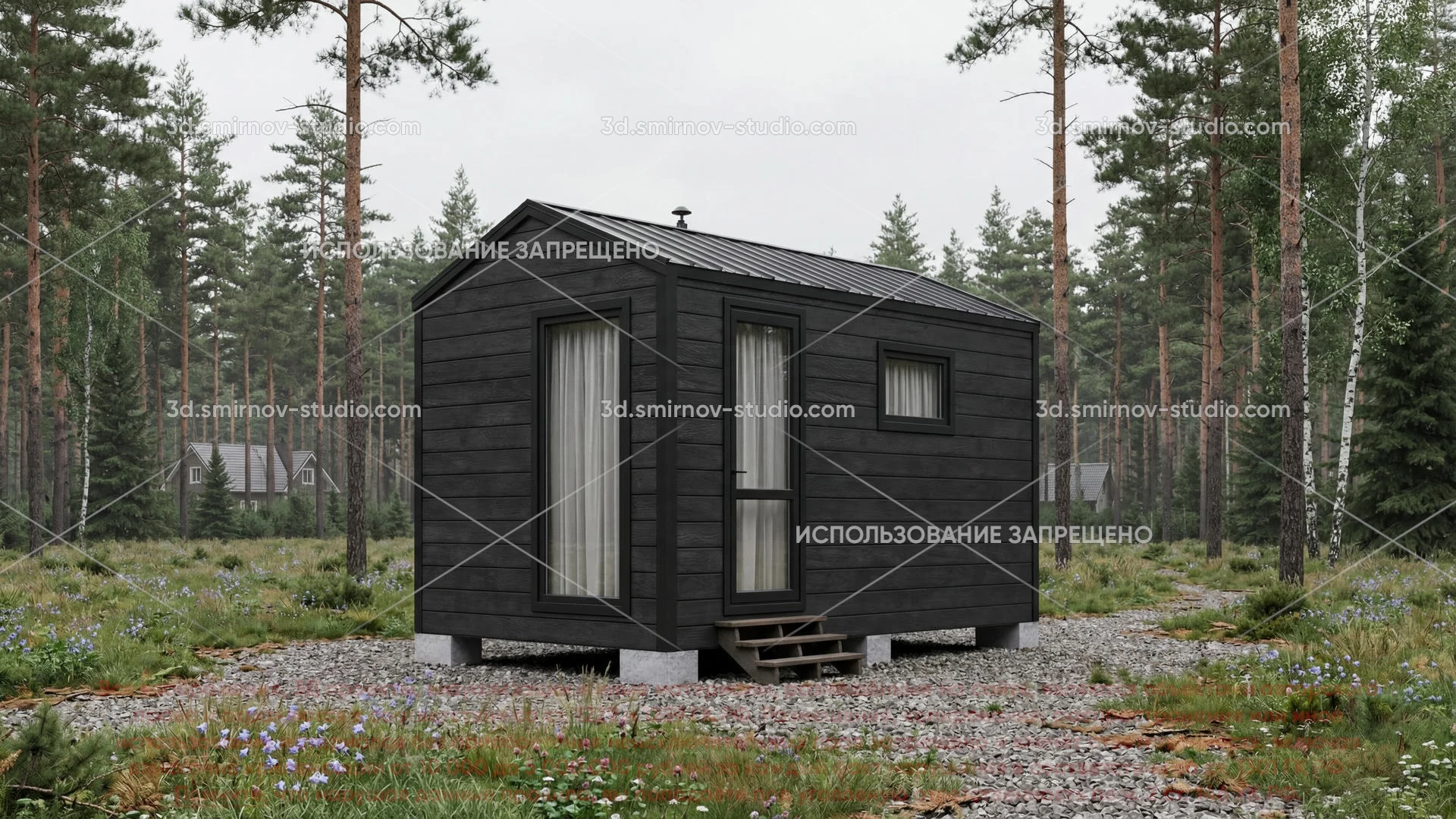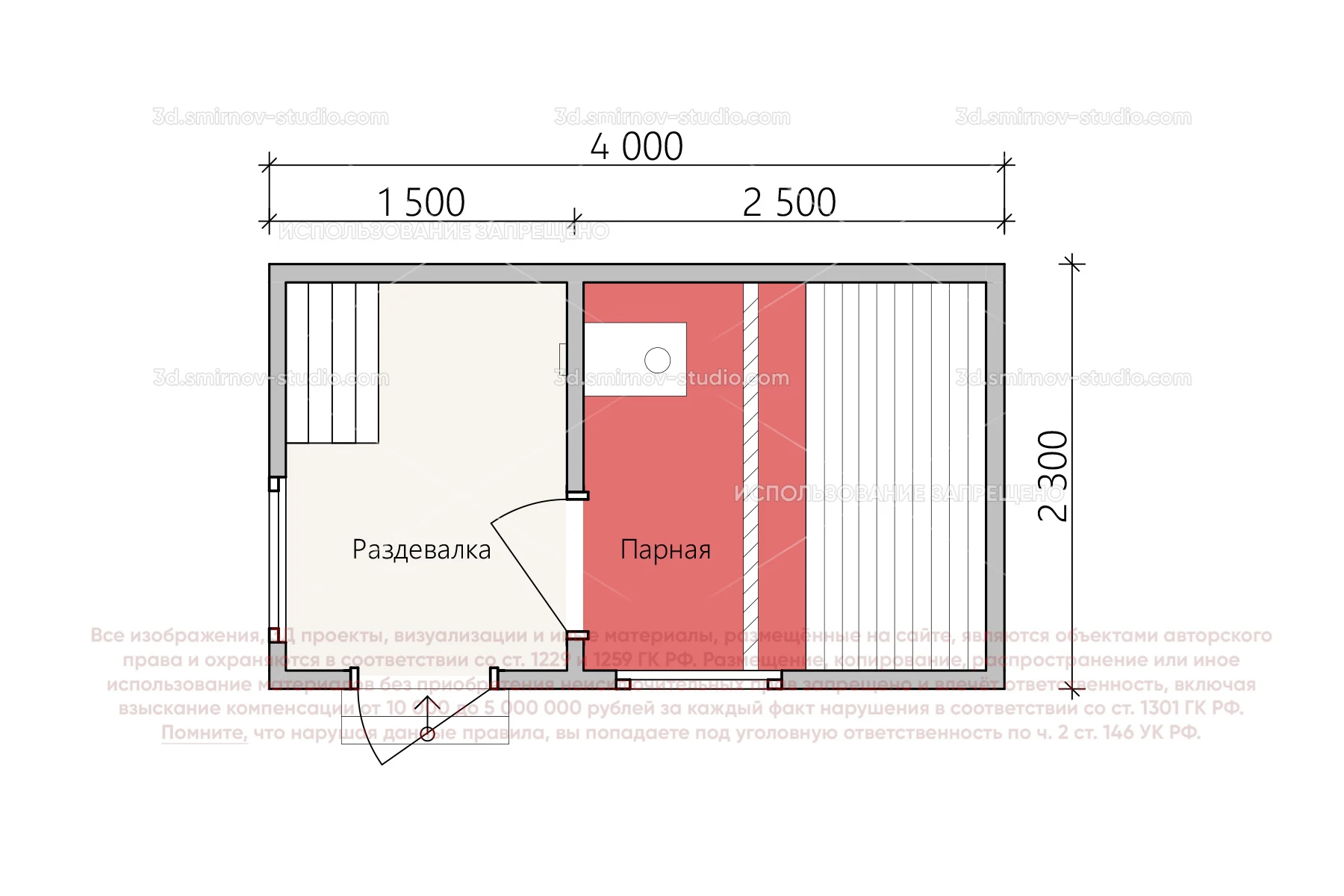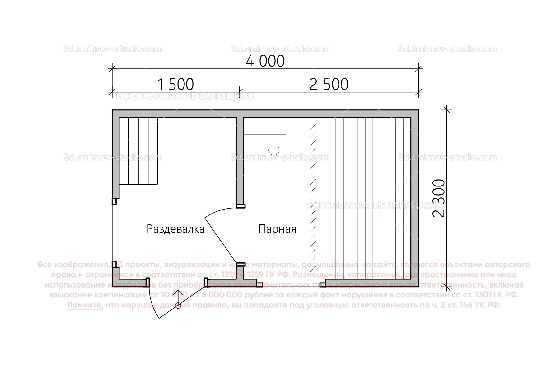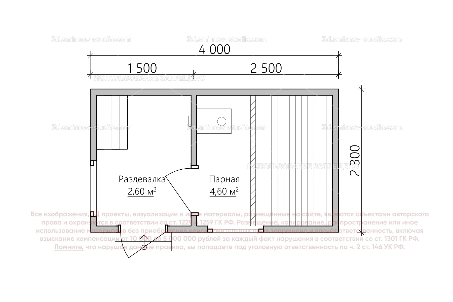 3Д проект мобильной бани в стиле барн 4 на 2.3 метра, площадью 7,20 м², с прямой крышей и раздевалкой