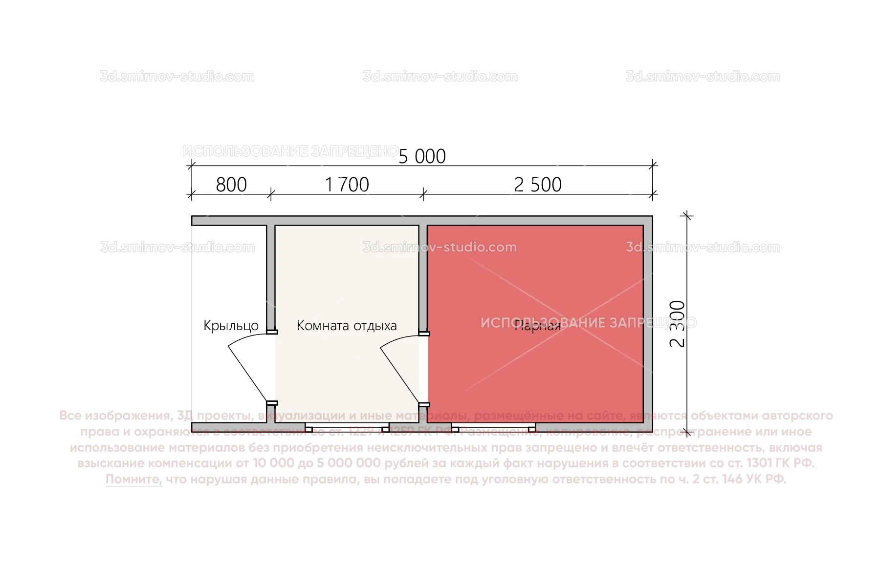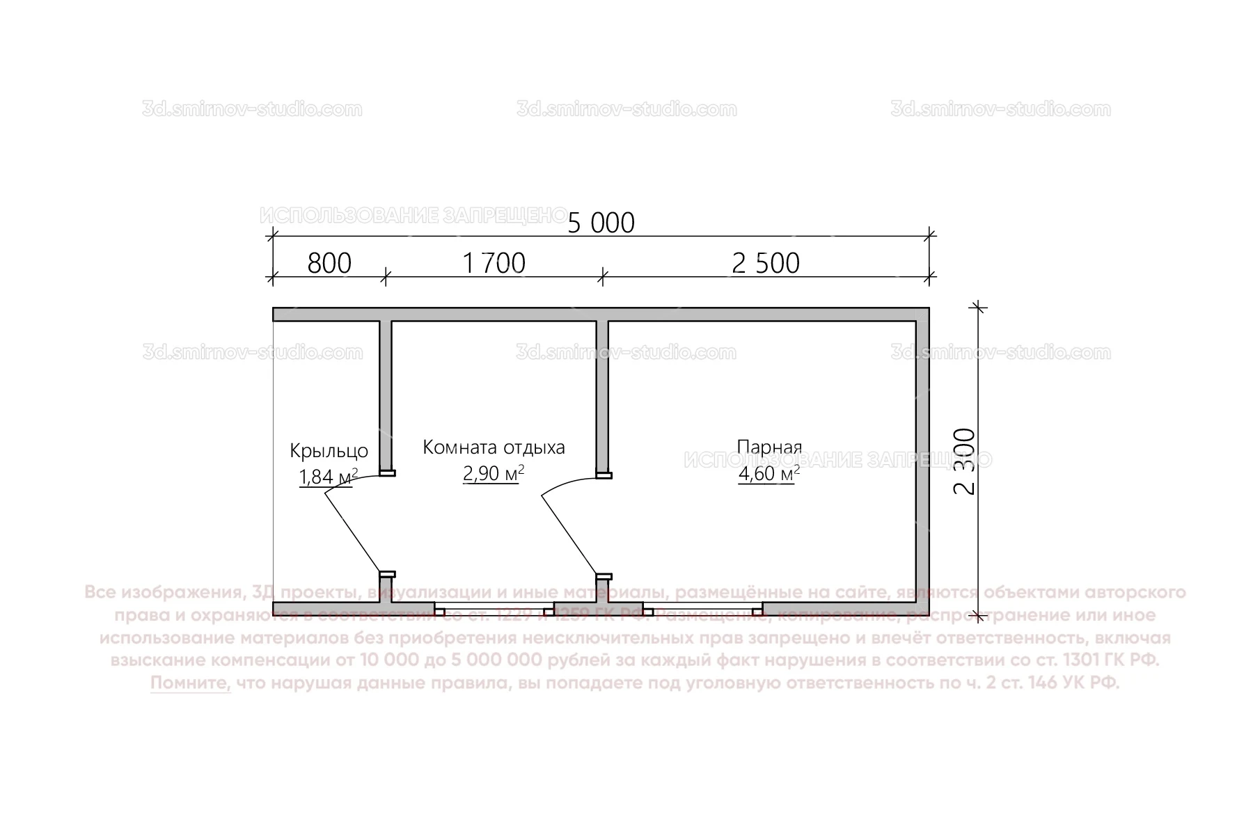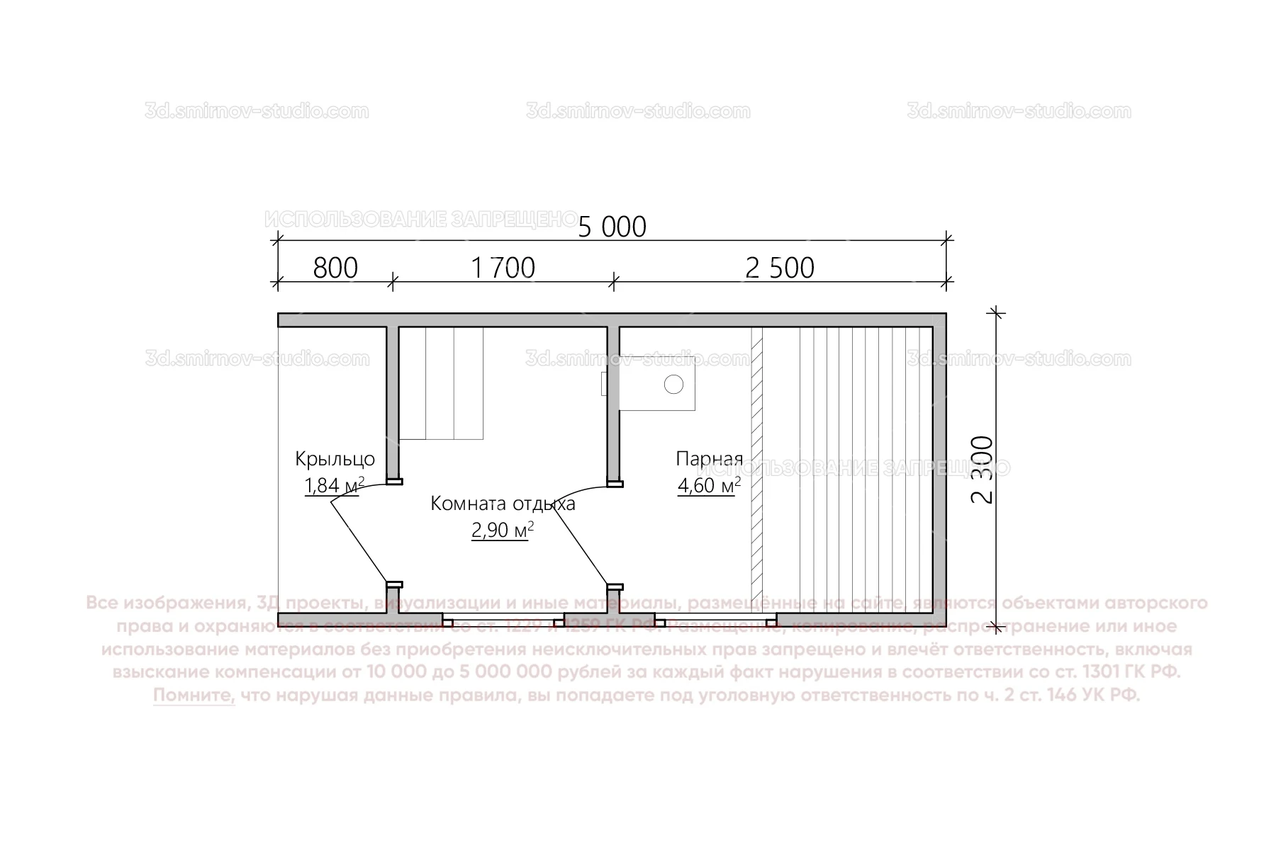 3Д проект мобильной бани в стиле барн 5 на 2.3 метра, площадью 9,34 м², с прямой крышей, крыльцом и комнатой отдыха