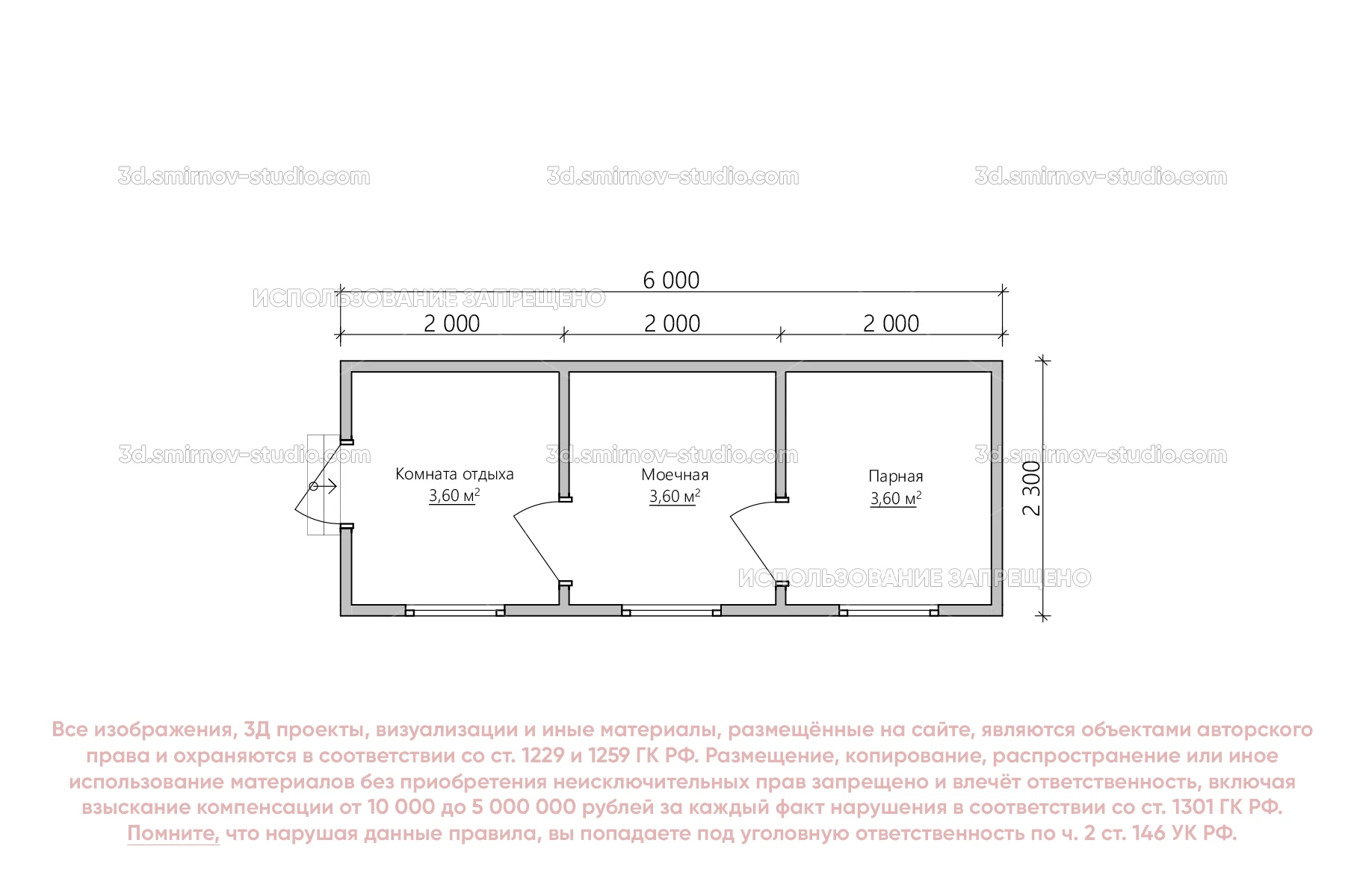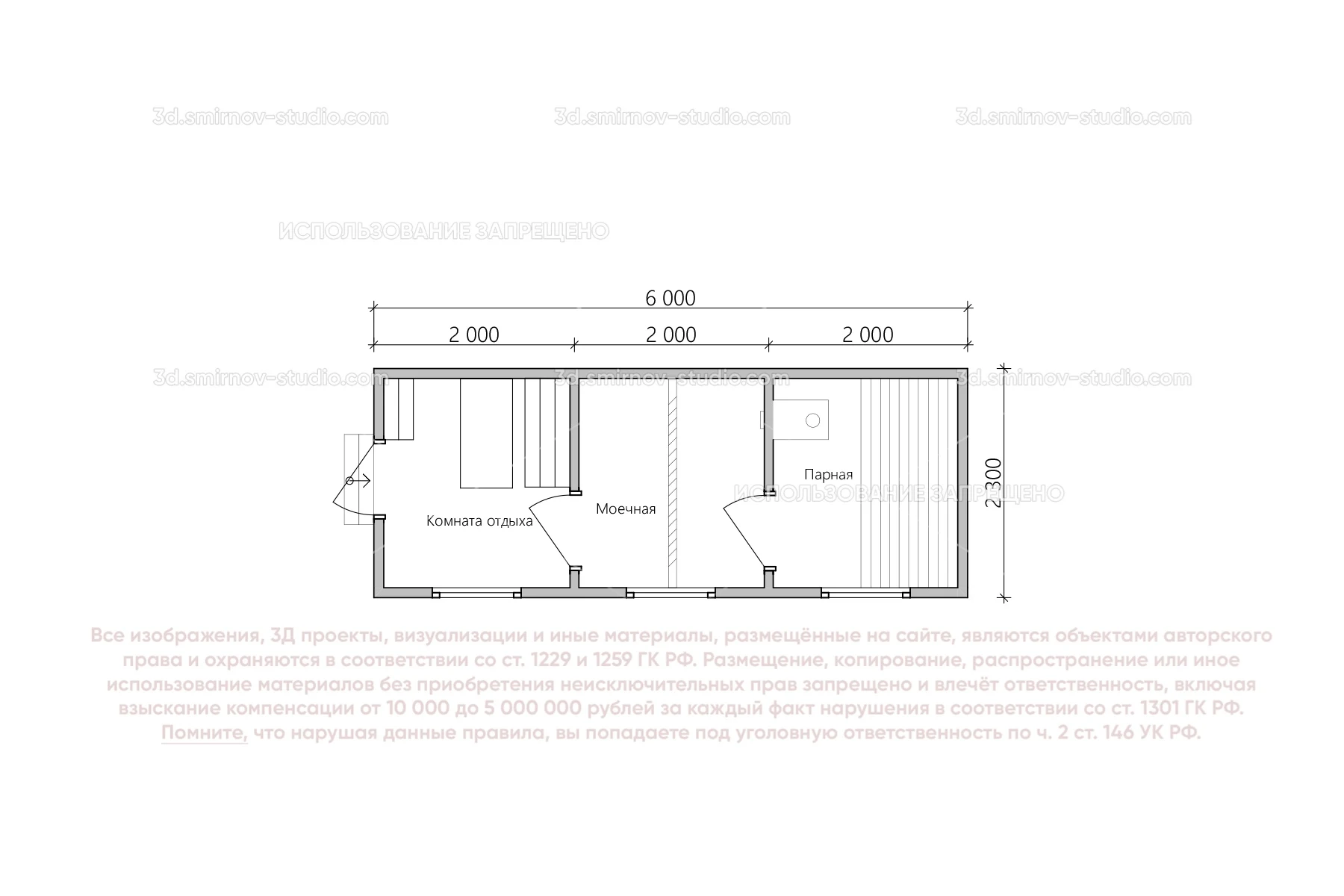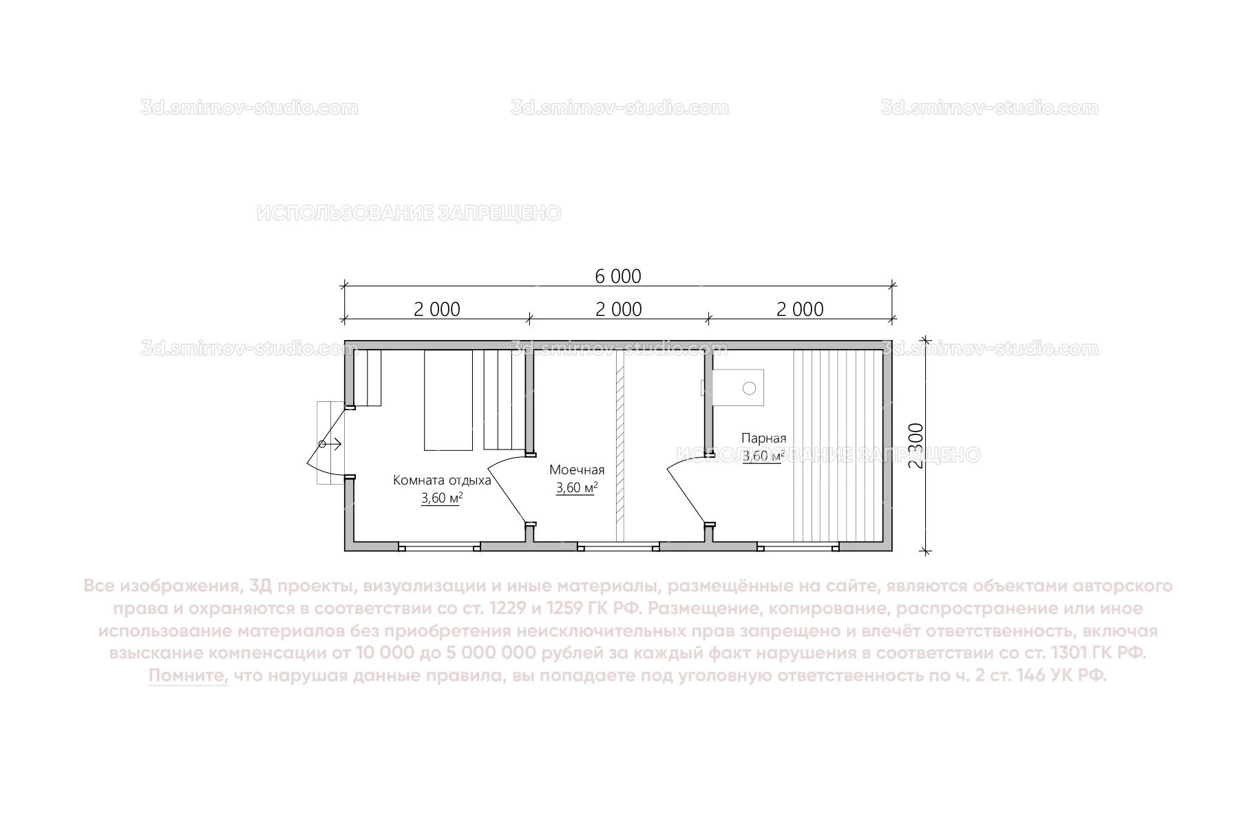 3Д проект мобильной бани в стиле барн 6 на 2.3 метра, площадью 10,80 м², с прямой крышей, комнатой отдыха и моечной