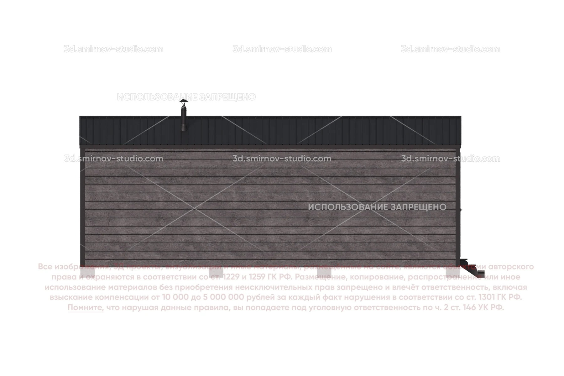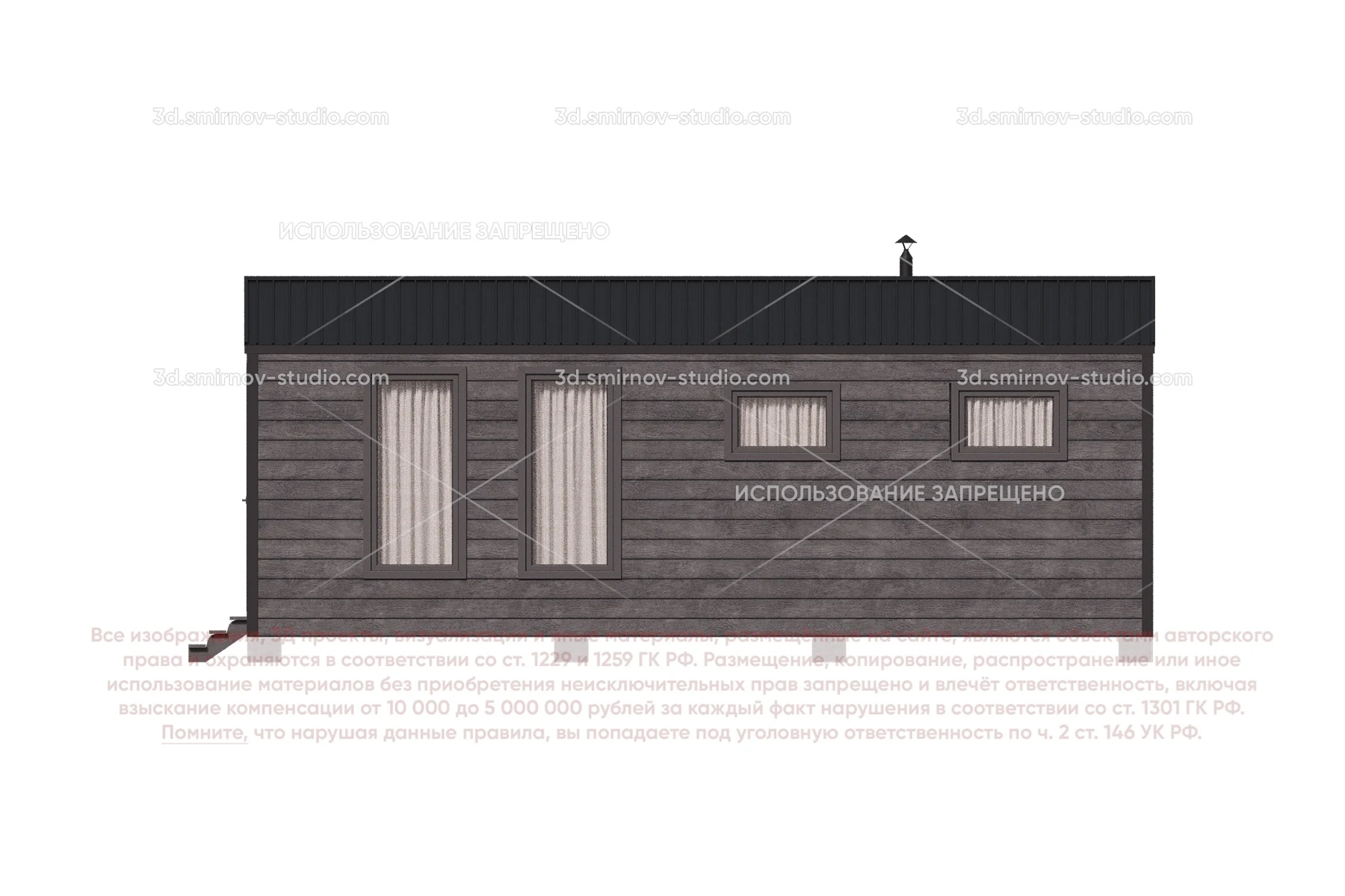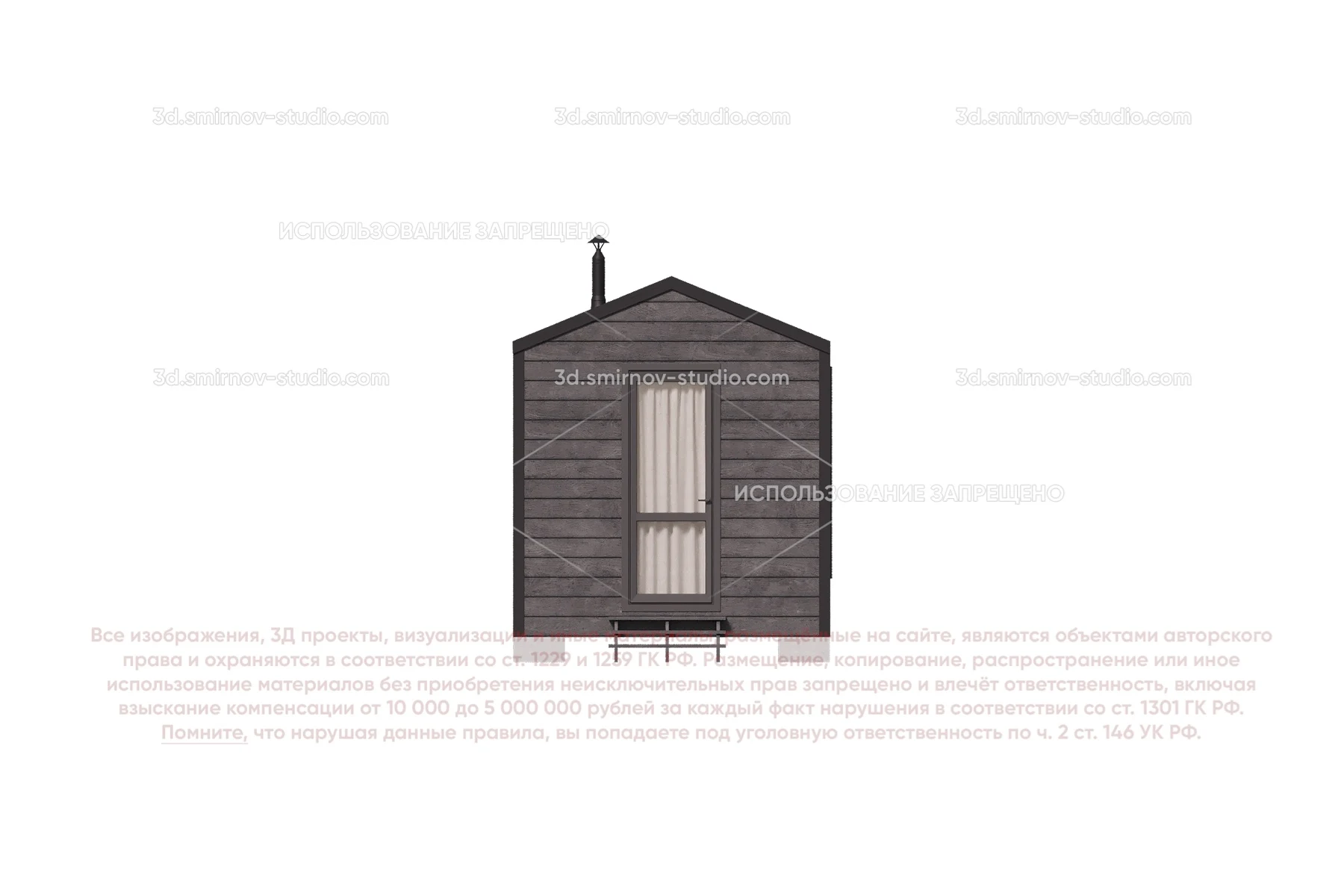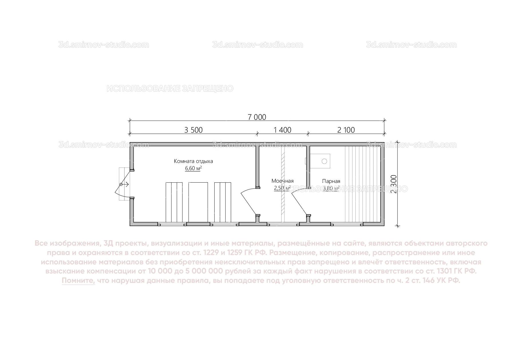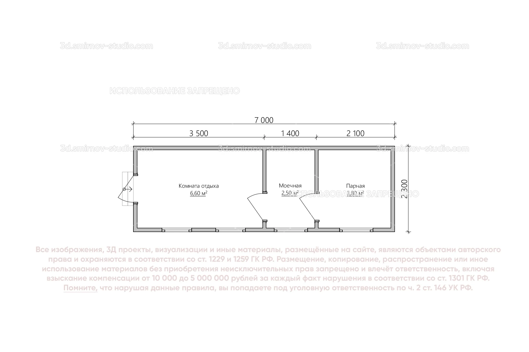 3Д проект мобильной бани в стиле барн 7 на 2.3 метра, площадью 12,90 м², с прямой крышей, комнатой отдыха и моечной