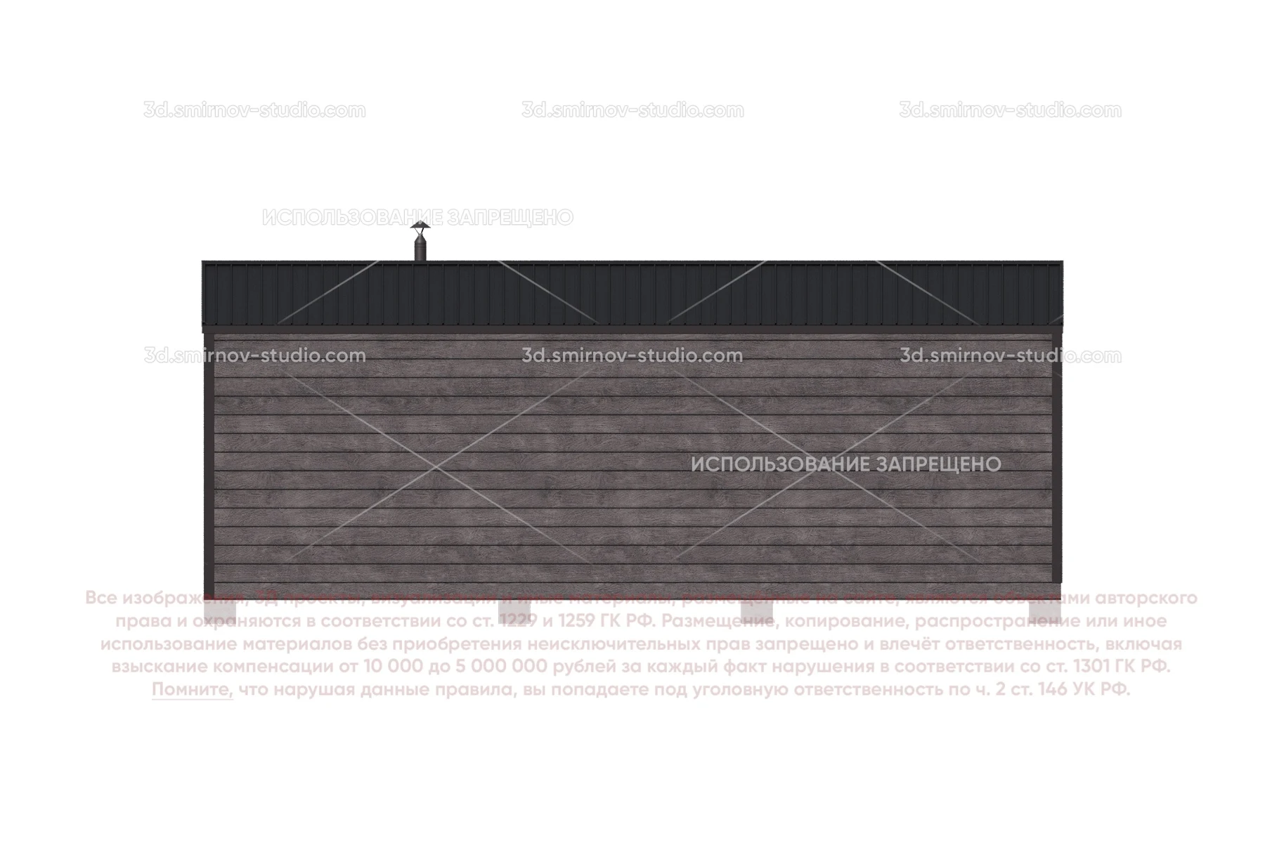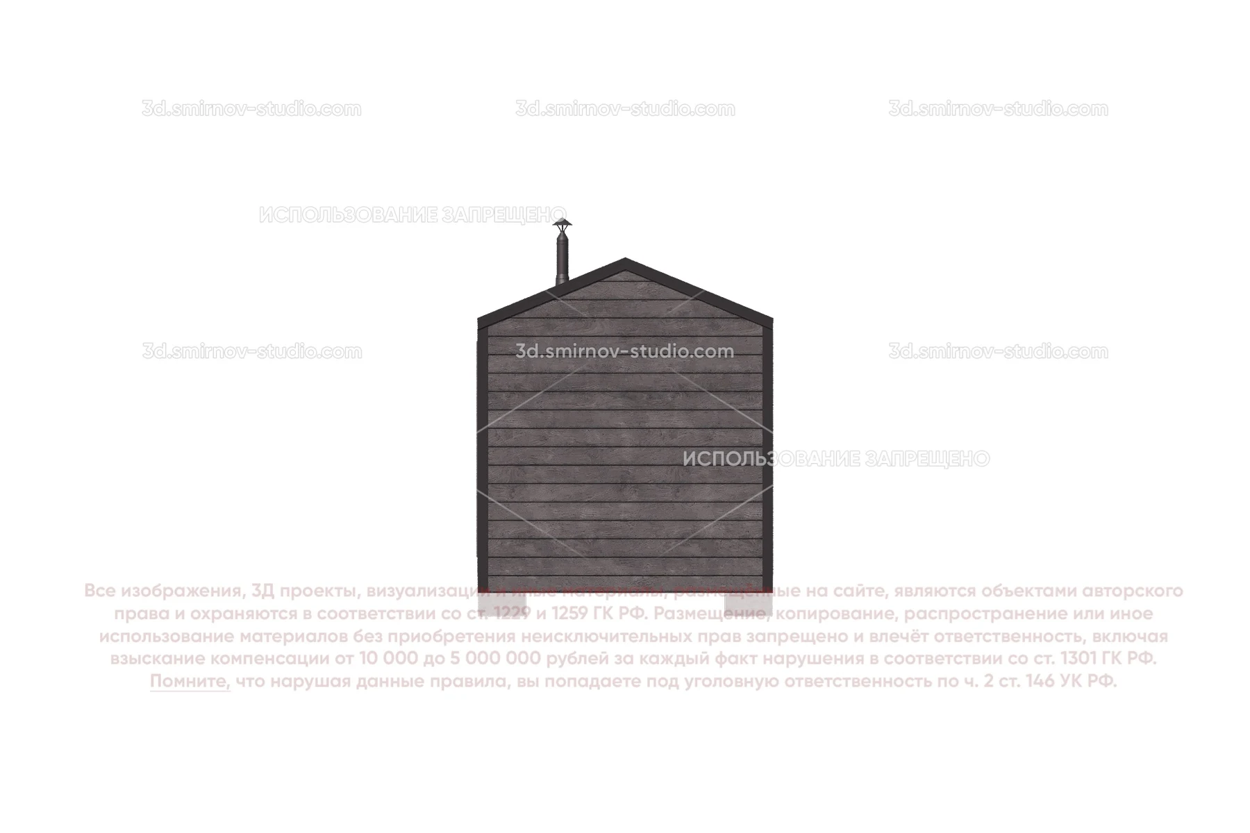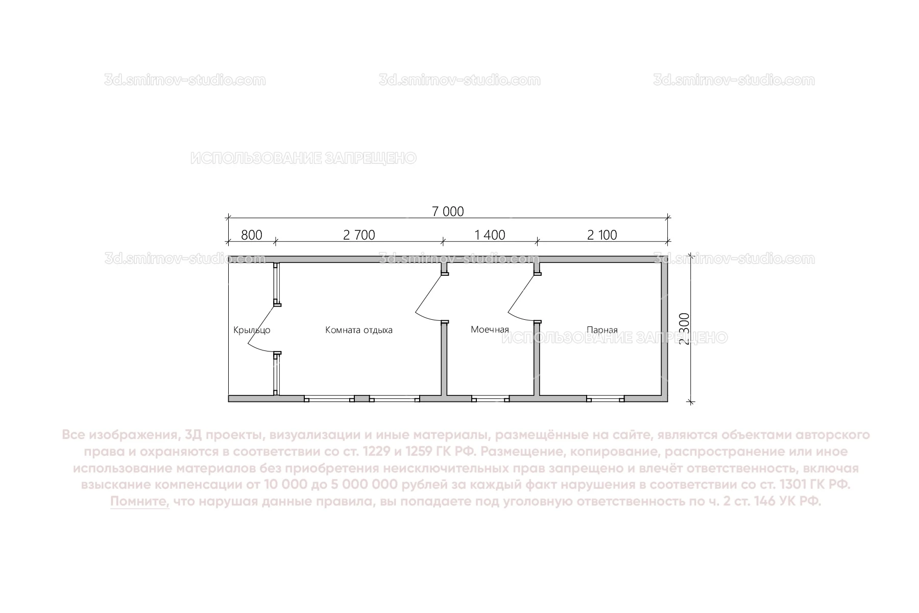 3Д проект мобильной бани в стиле барн 7 на 2.3 метра, площадью 12,94 м², с прямой крышей, крыльцом, комнатой отдыха и моечной