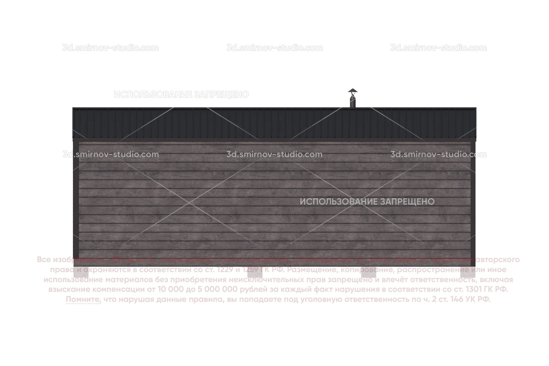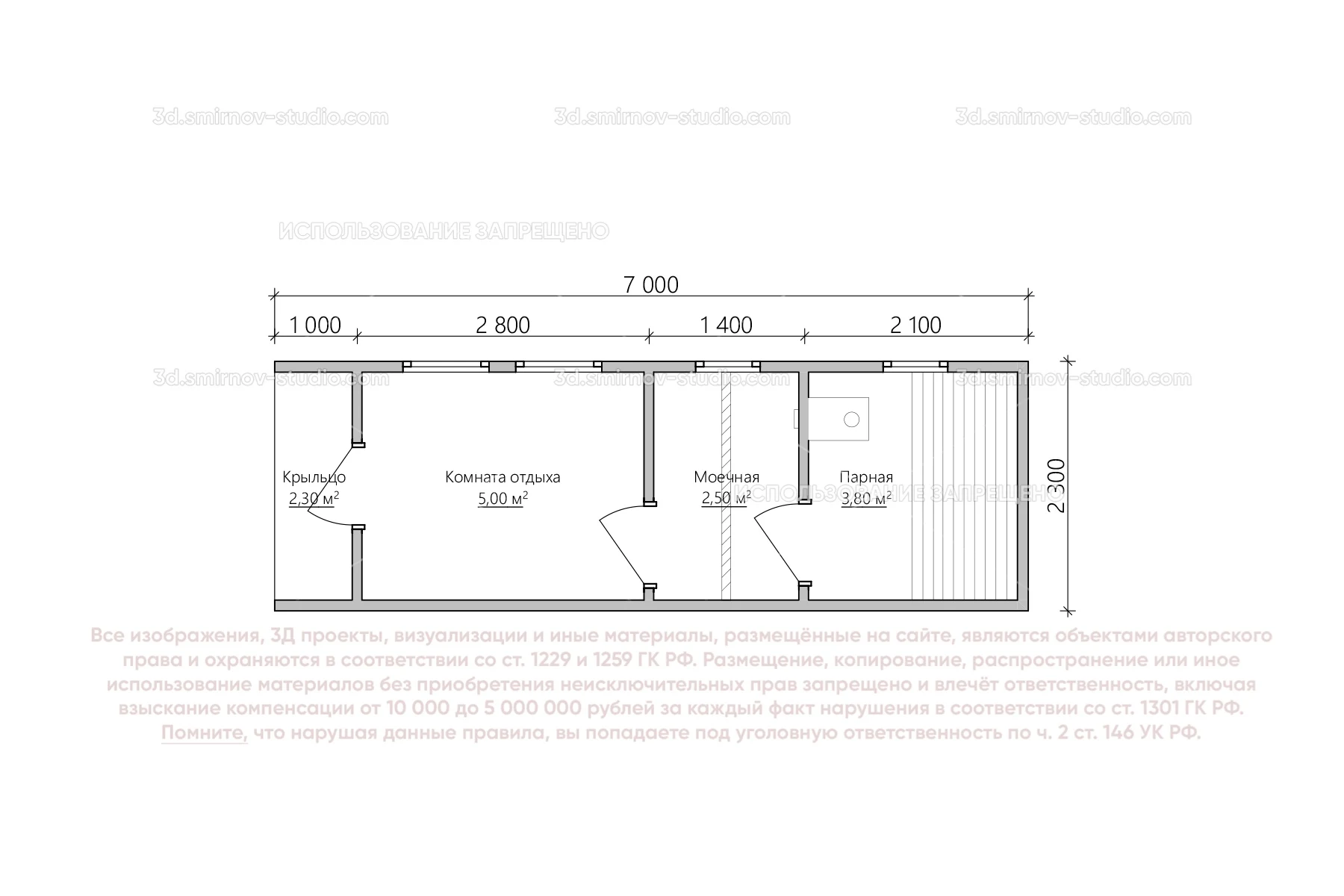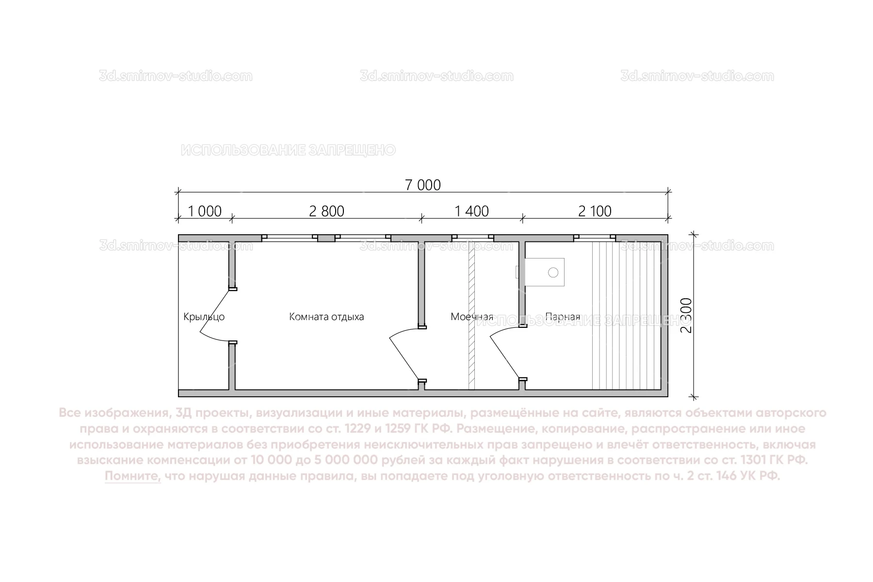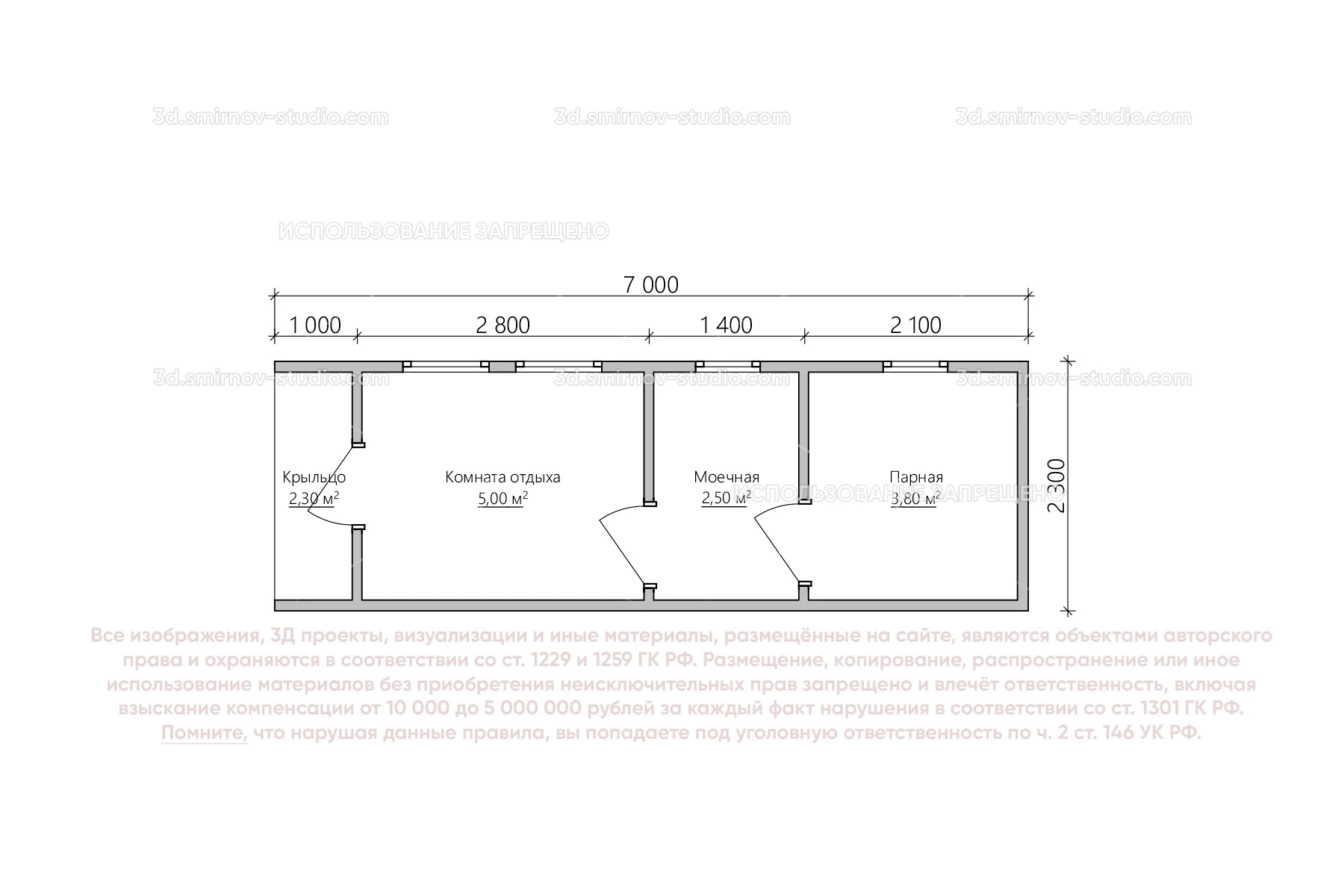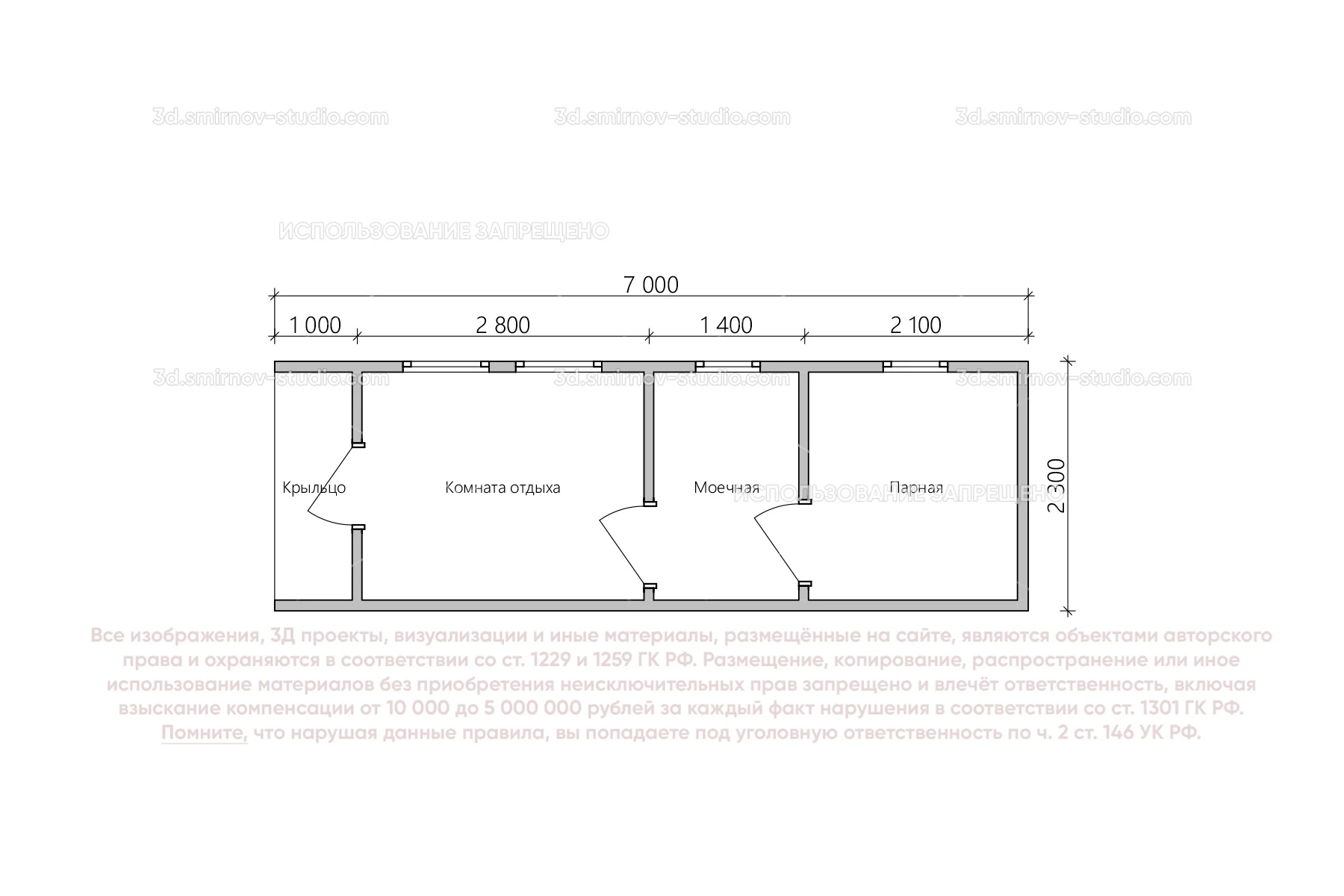 3Д проект мобильной бани в стиле барн 7 на 2.3 метра, площадью 13,60 м², с прямой крышей, крыльцом, комнатой отдыха и моечной